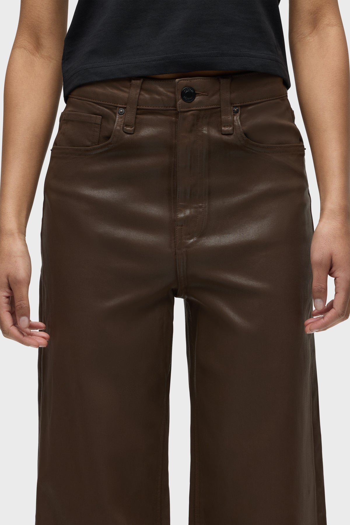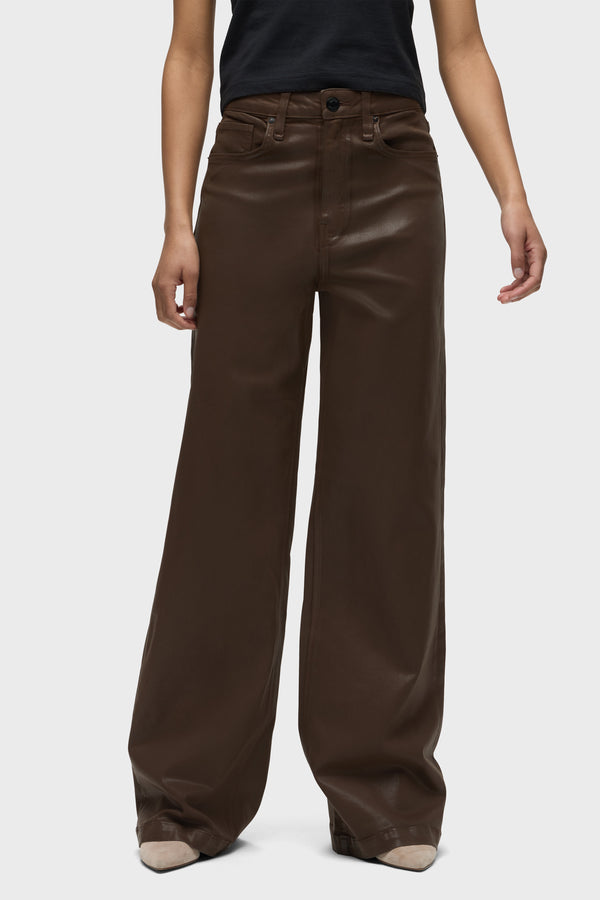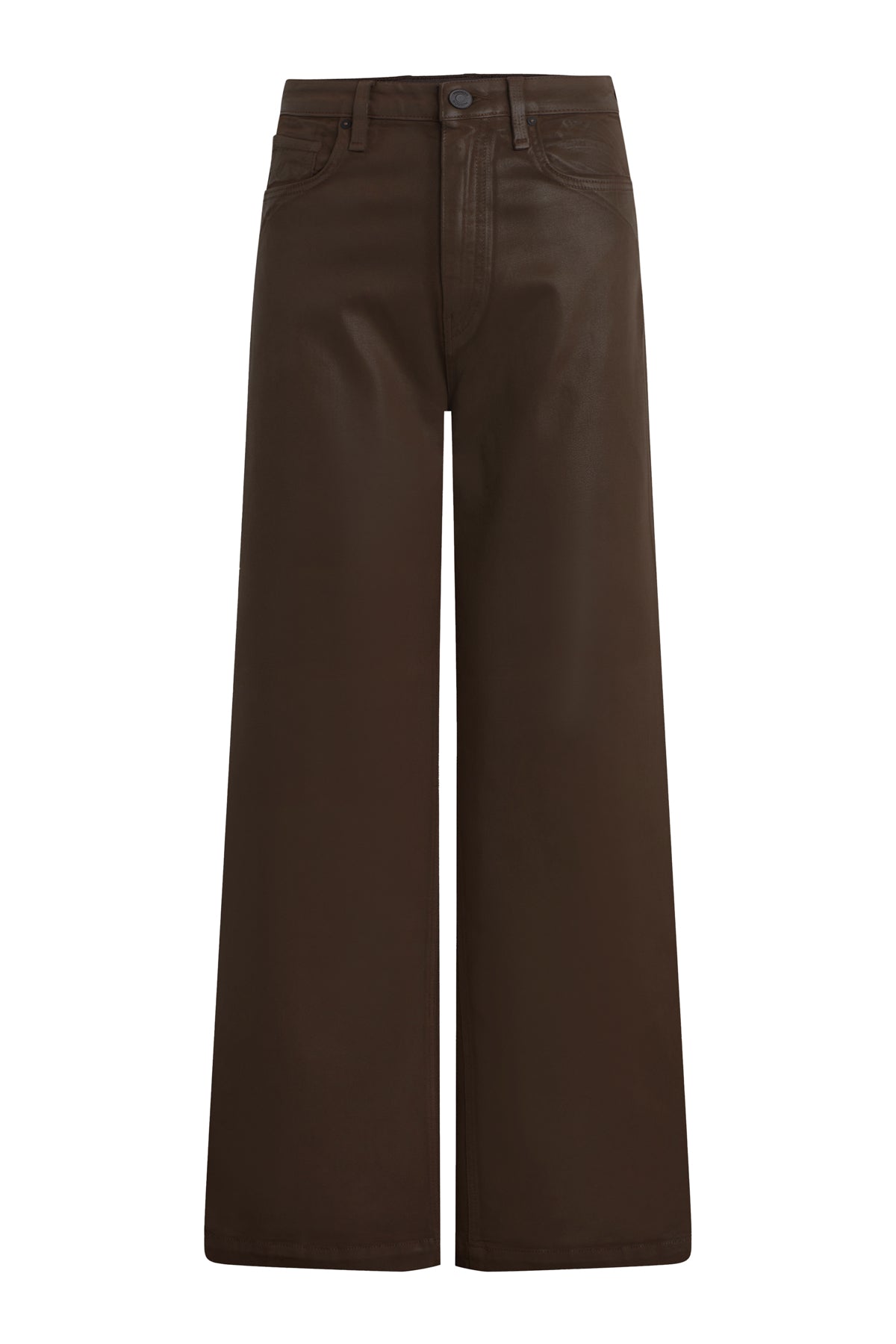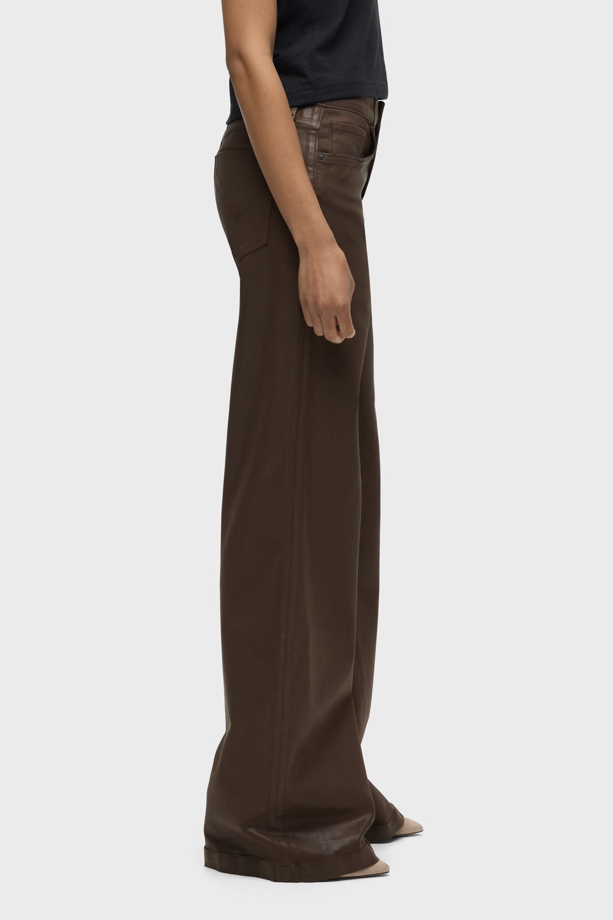 Our Jodie High-Rise Wide Leg Jean in Bracken Coated is cut in a stretch fabric for must-own, roomy fit. Finished with 32" inseam, the pair has classic five-pocket details in chocolate brown with a coating for luxe sheen. -