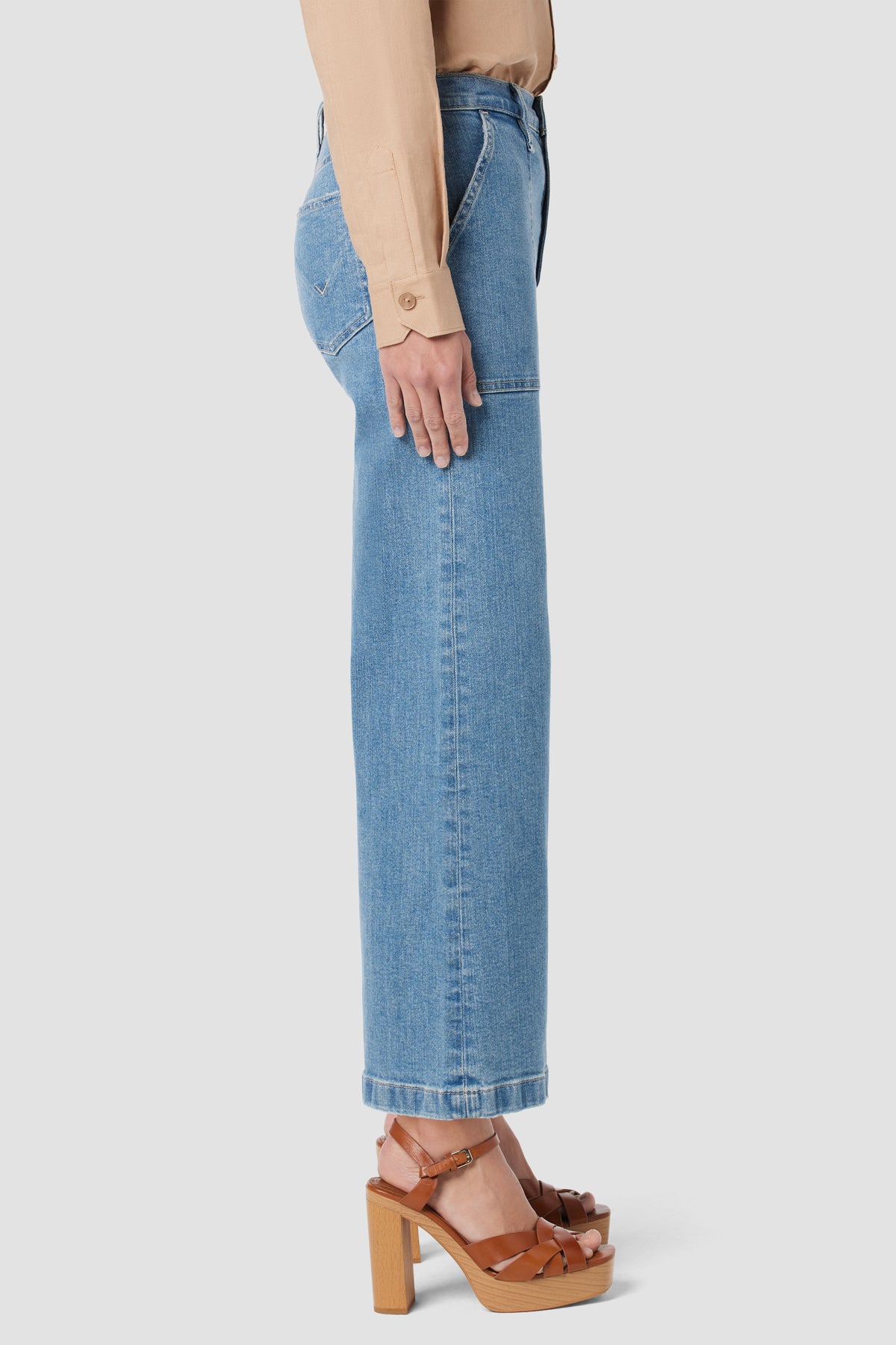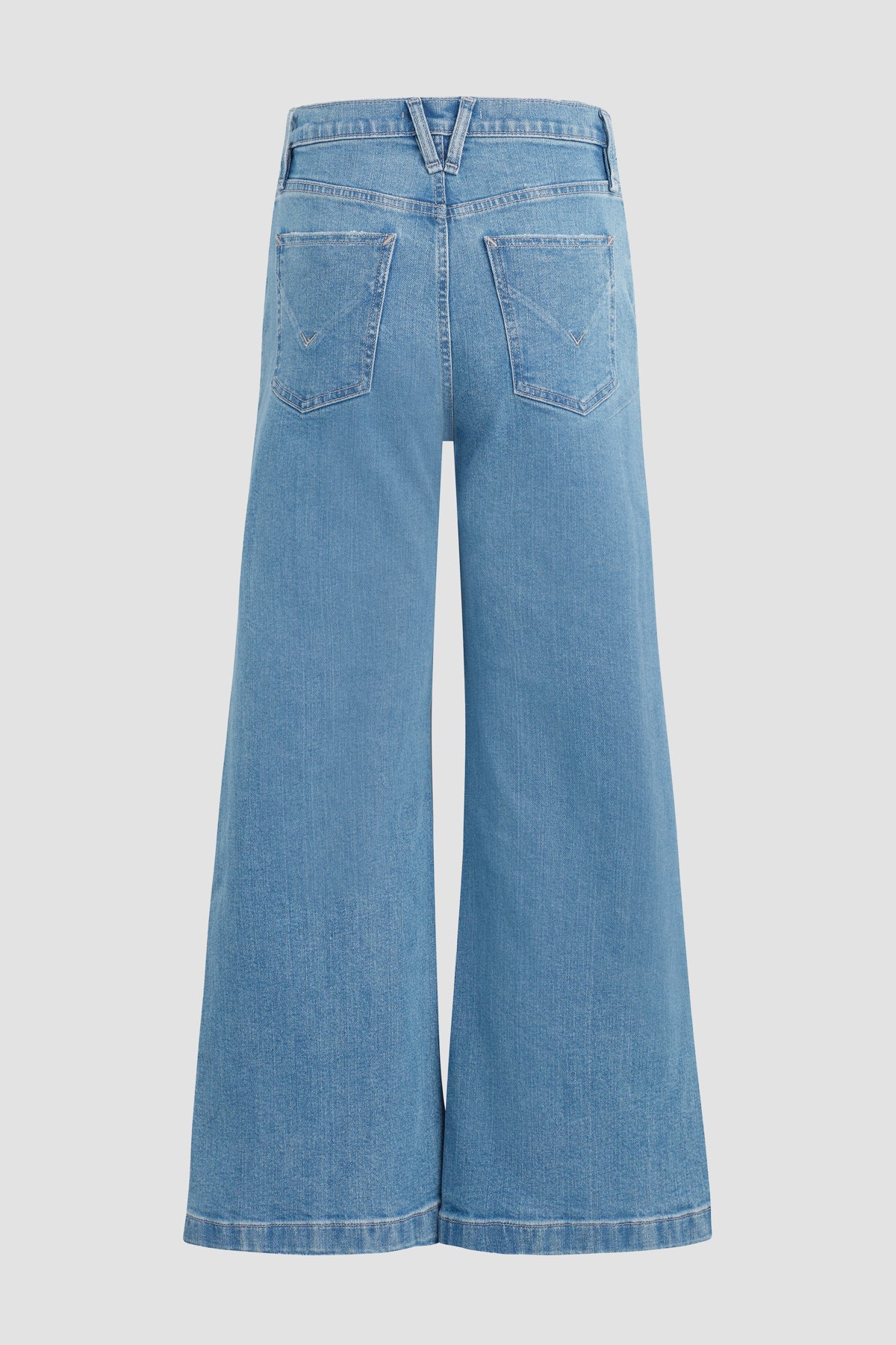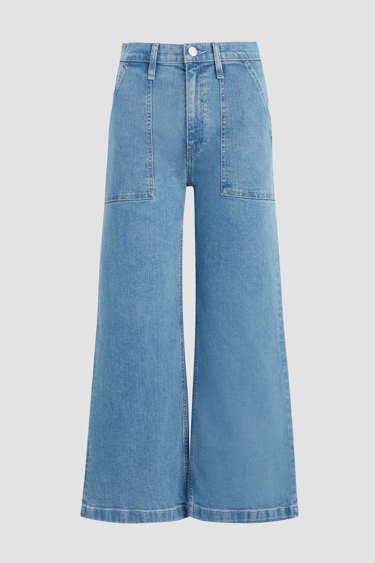 Our Jodie High-Rise Wide Leg Crop Jean in light indigo West Lake is cut for a roomy fit from premium comfort stretch denim. Finished with 27" inseam, patch pockets and grinding along the edges. -