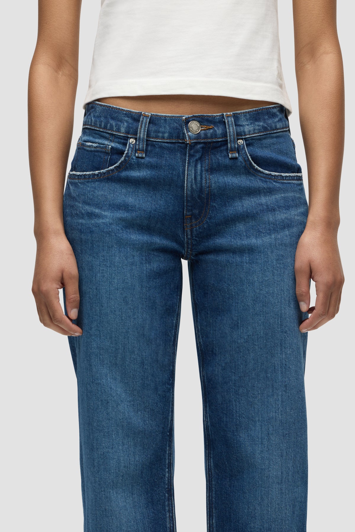 Our new Kelli Low-Rise Straight Jean is a five-pocket that's meant to be worn low and loose. The medium-dark Moon Walk wash features a straight leg with clean hems and expert grinding. -
