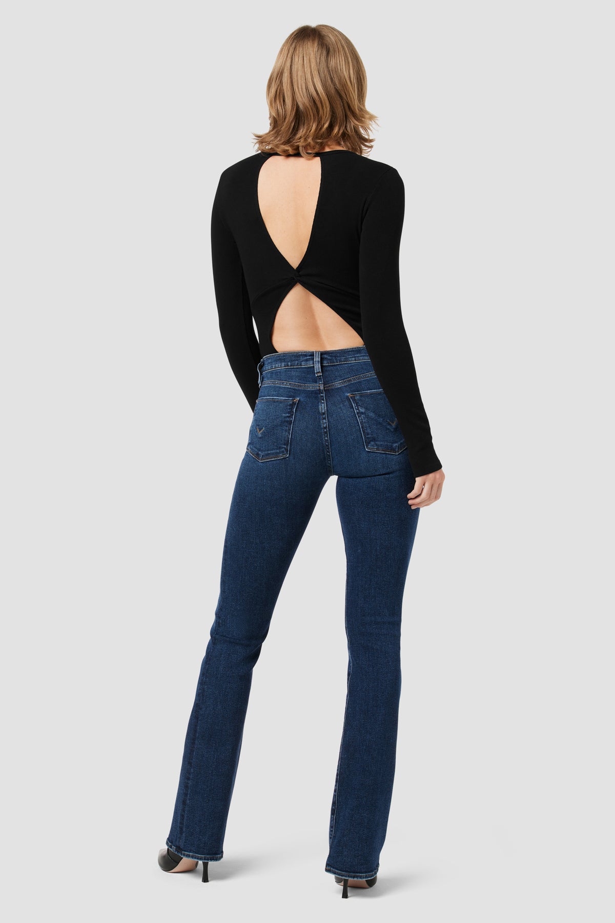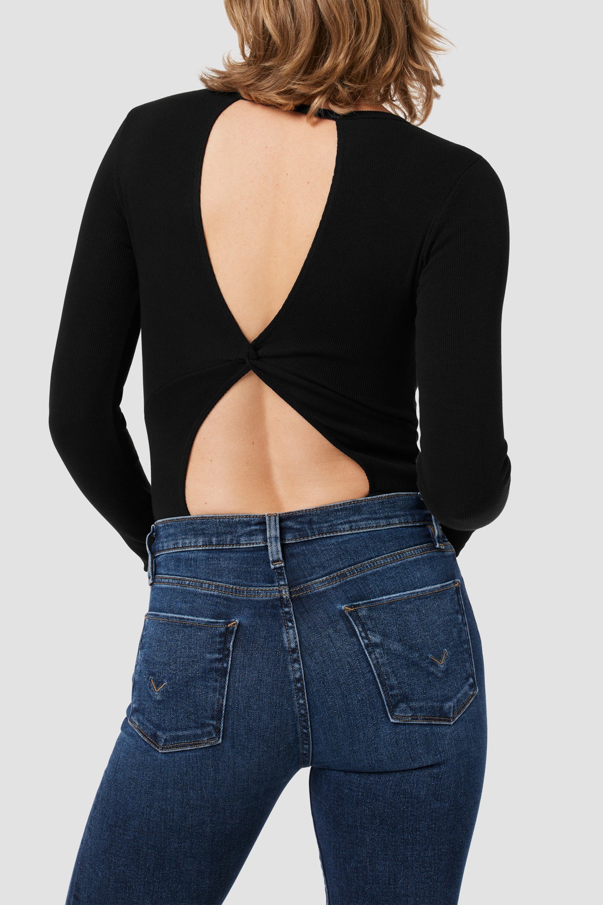 The Knot Back Bodysuit is part of our new Night Owl, The After Dark Collection. The long sleeve crewneck in Black has a bra-friendly back cutout with a comfortably-stretchy bodysuit styling. -