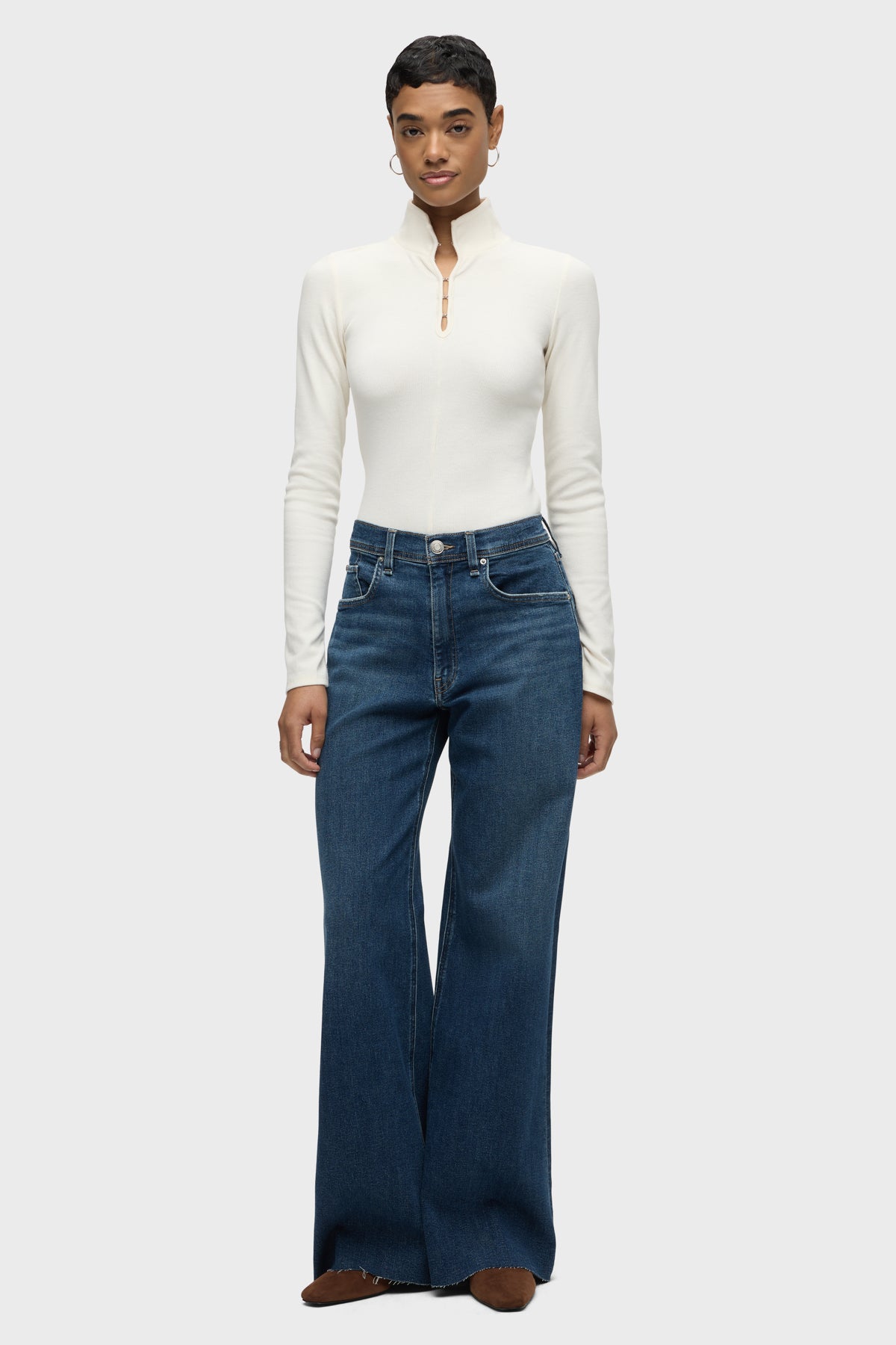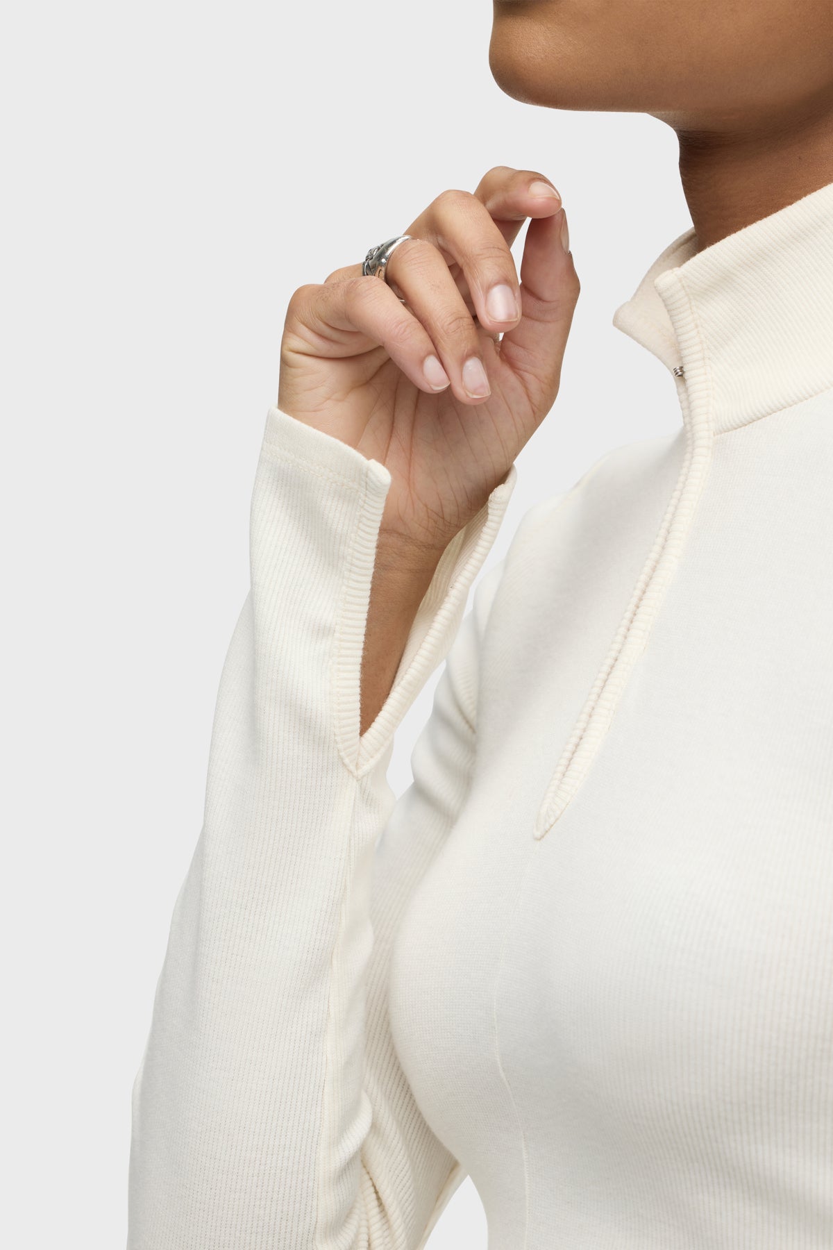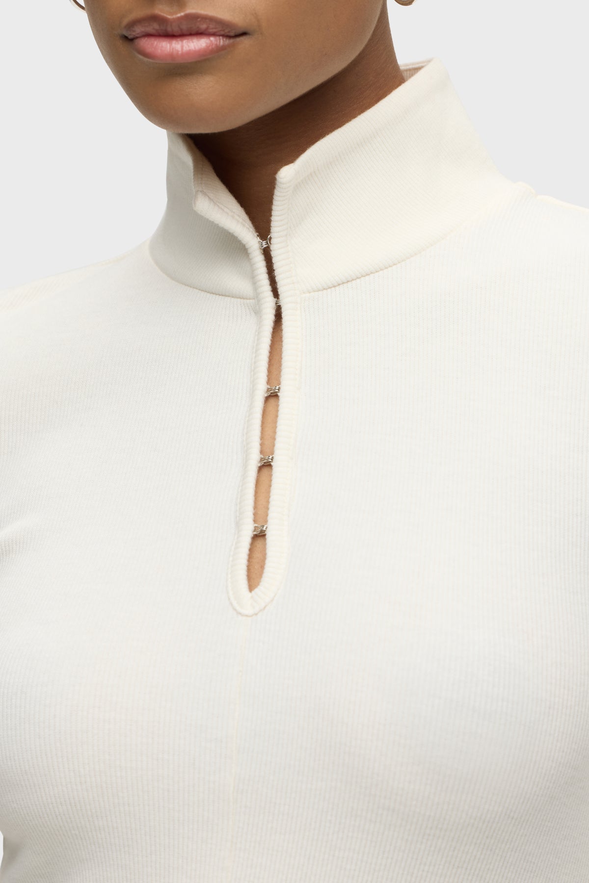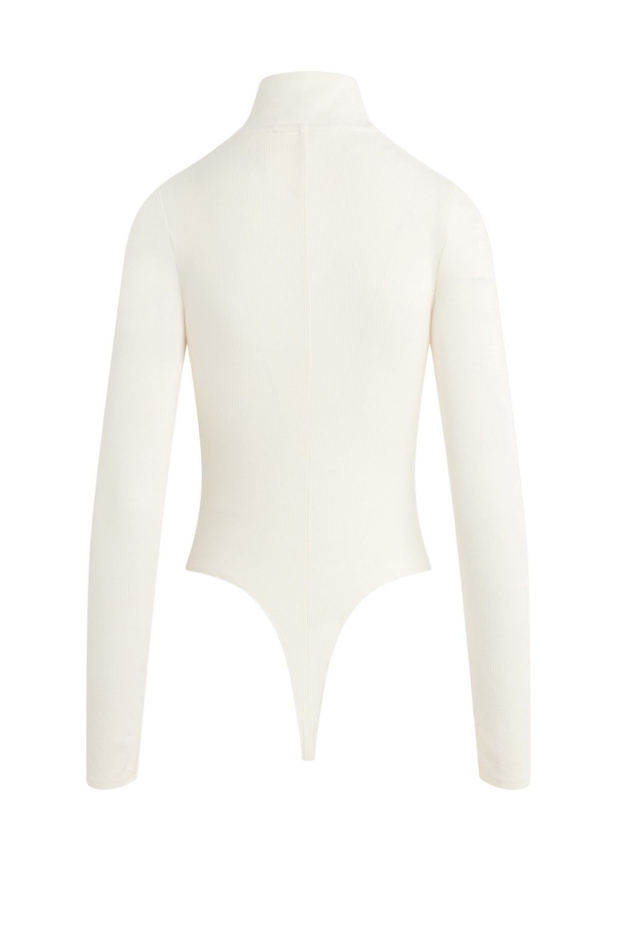 With plenty of stretch, our Long Sleeve Hook & Eye Bodysuit features a stand-up collar with hook & eye closure. It is finished with slits along the sleeve cuffs. -