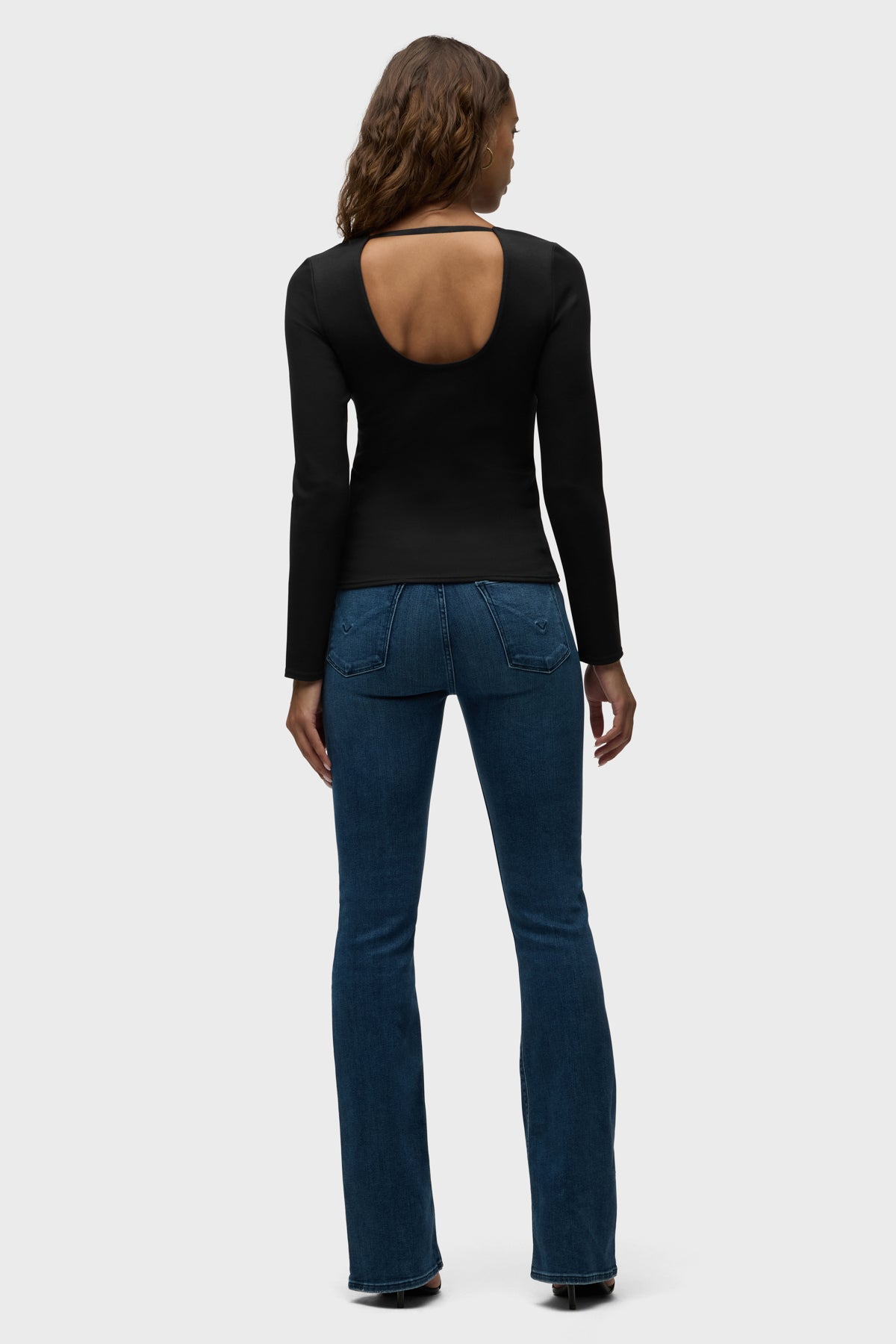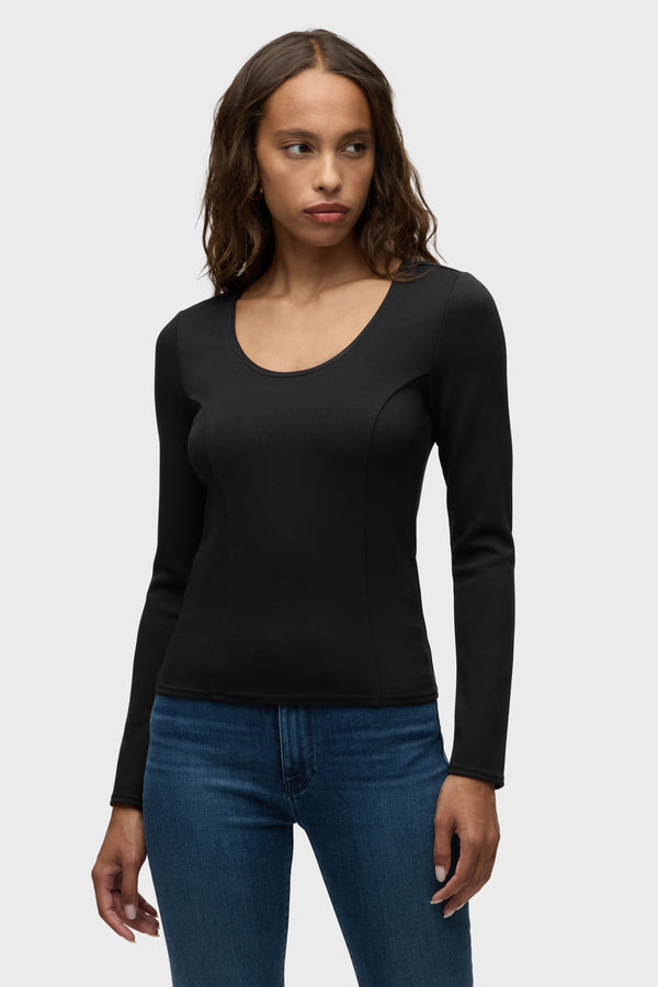 Our Long Sleeve Scoop Neck Top in Black Beauty is made from our new sculpting rib-scuba knit, a soft and flexible feel with every move. It features long sleeves with a back strap across shoulders for a secure fit. -