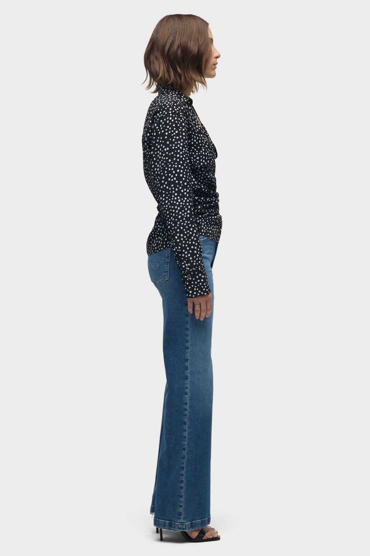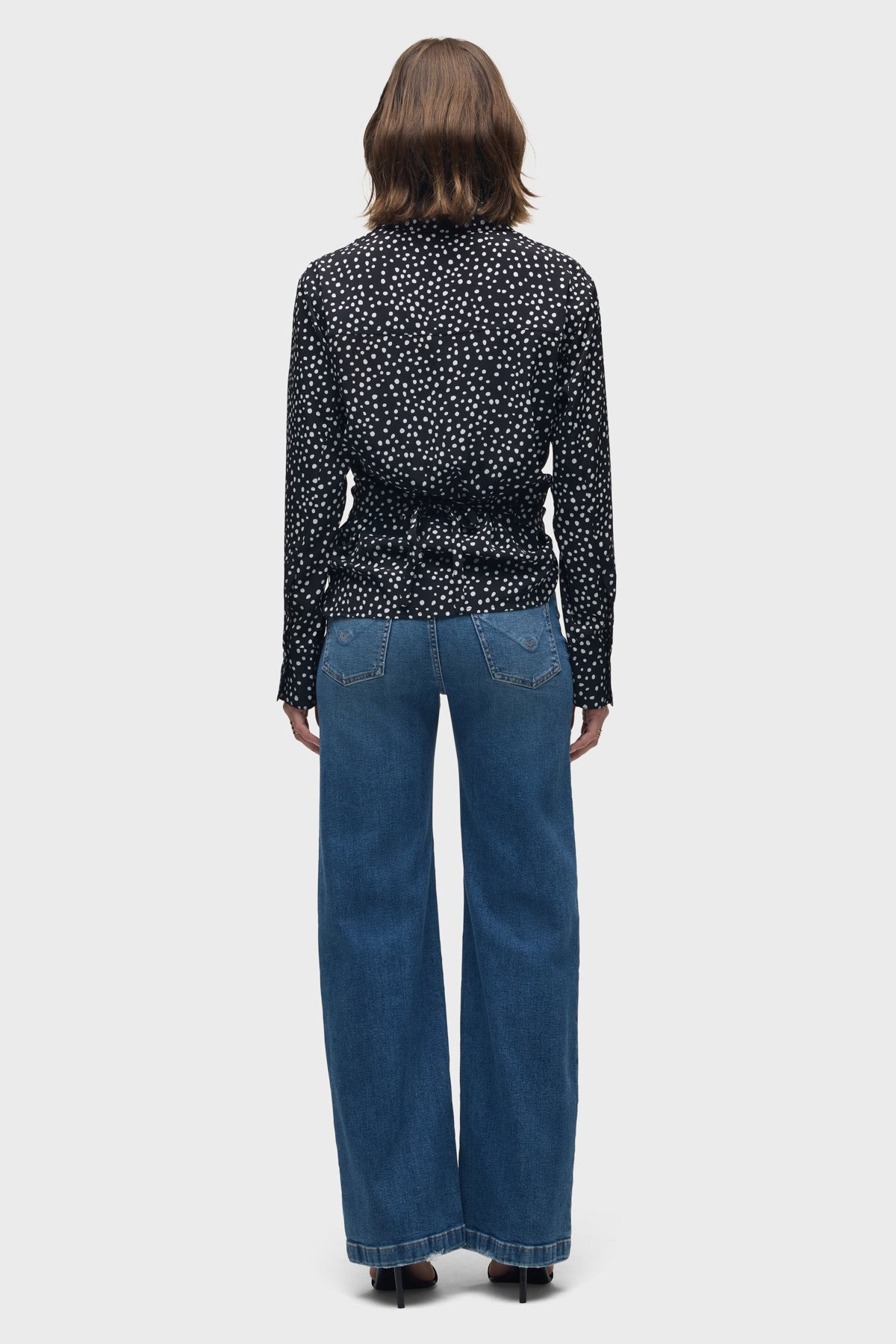 The Long Sleeve Wrap Shirt in Polka Dot has a classic fit that is designed to cross over and tie in the back. This style features an elevated polka dot print, cuffs on the sleeves and an optional baby snap along the center front chest. -