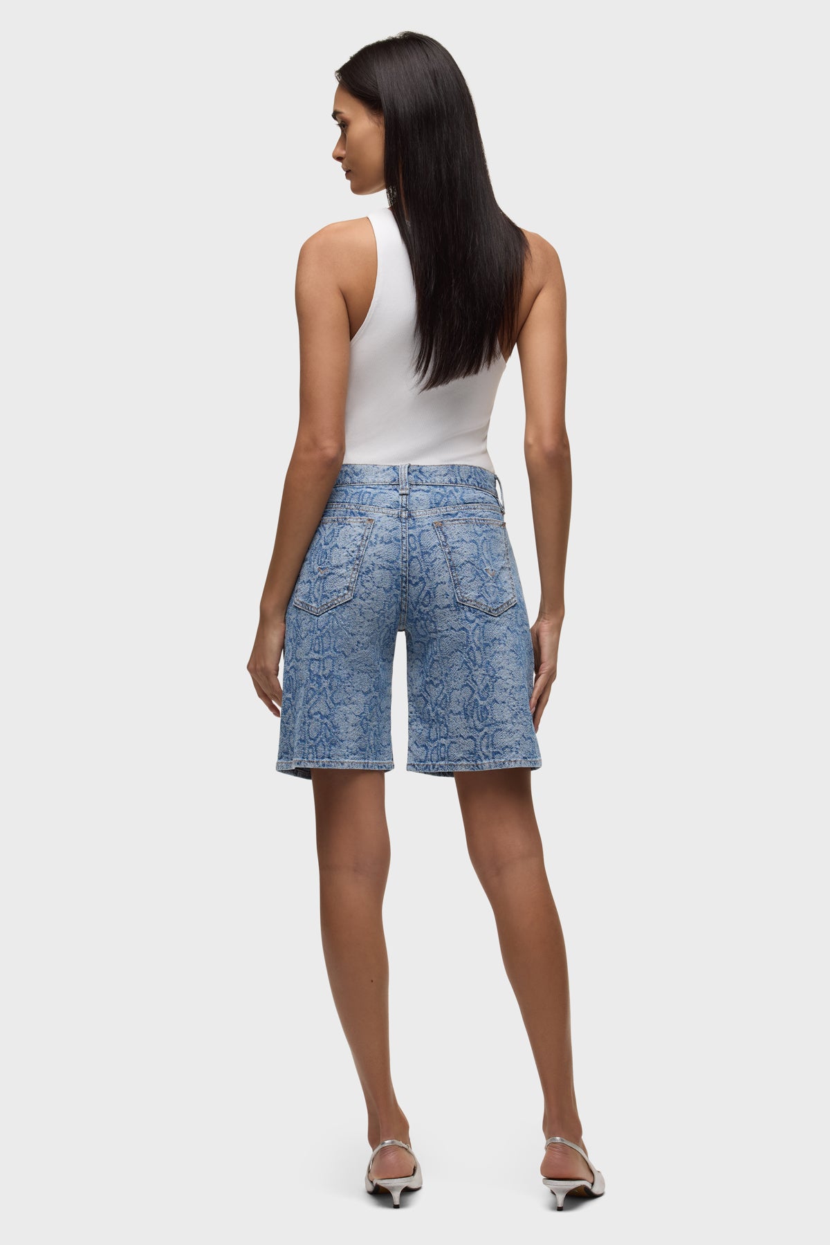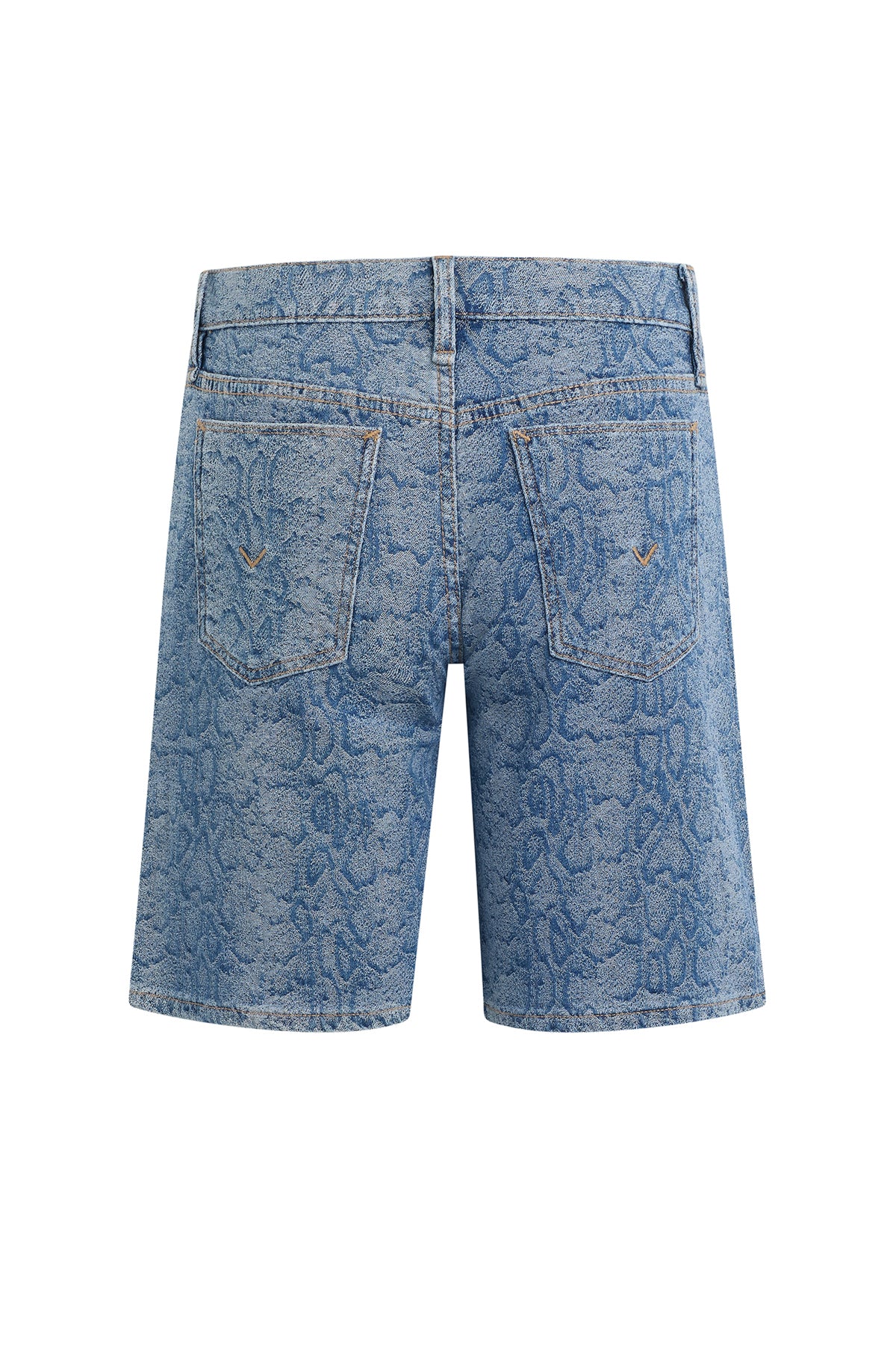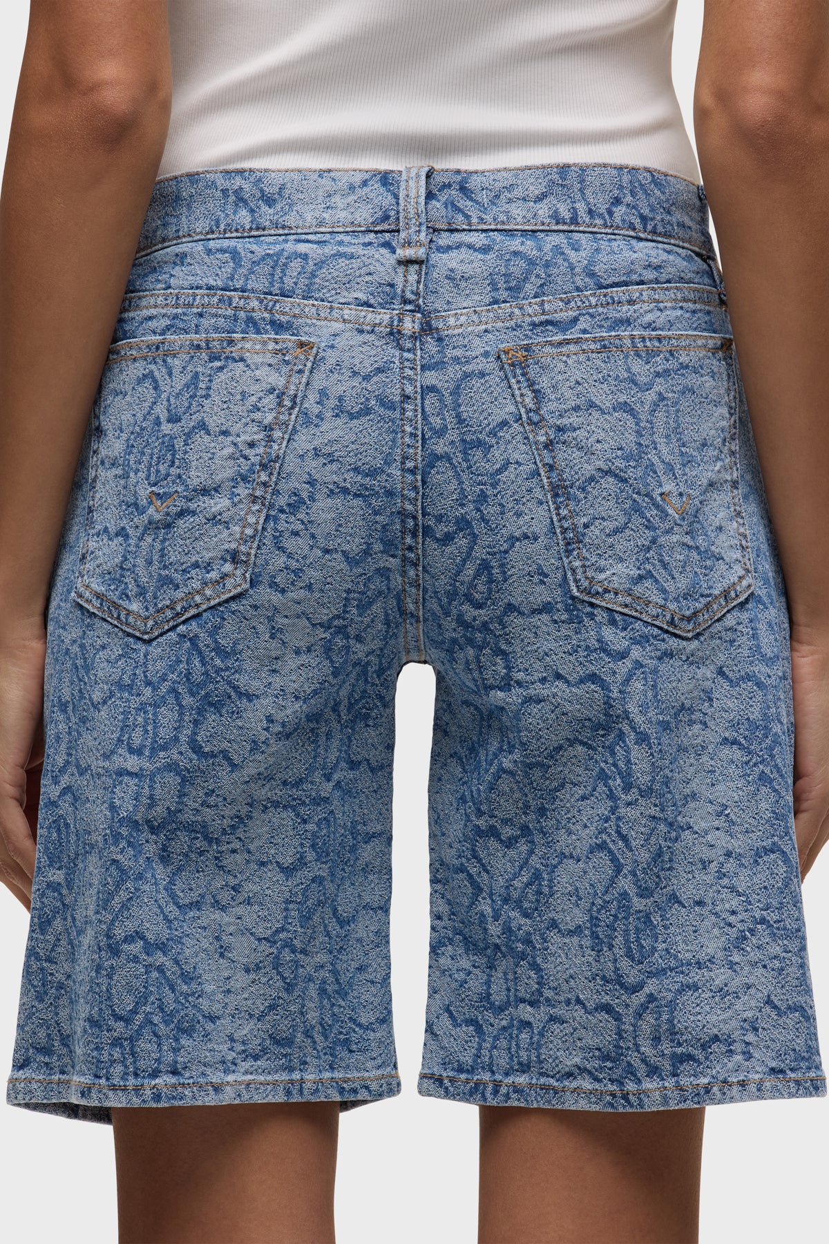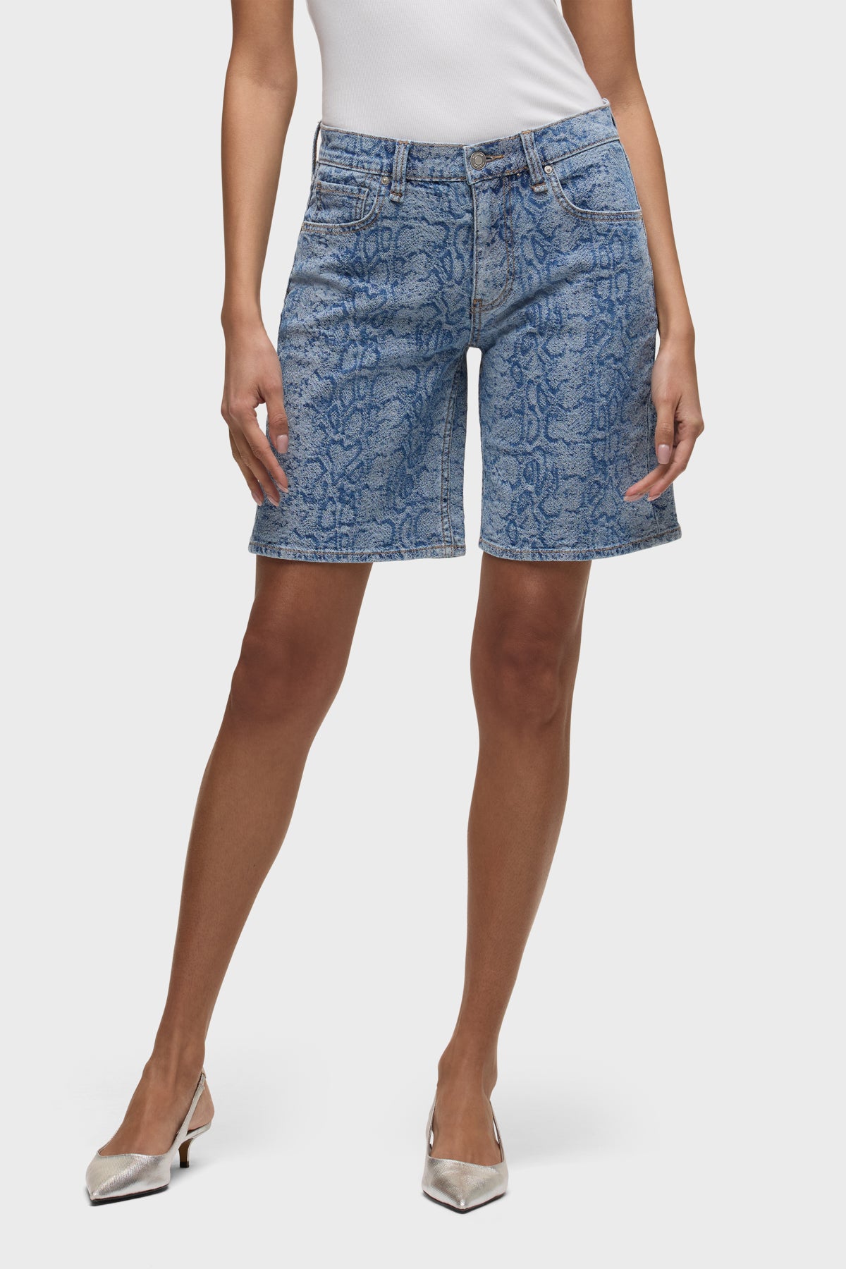 The London Low-Rise Long Short in Venom is a five-pocket casual short with a relaxed, dropped fit, 9" inseam and a clean finished hem. The star of this style is the snake jacquard in a medium indigo wash on slightly stretchy denim. For a looser fit, we recommend sizing up. -