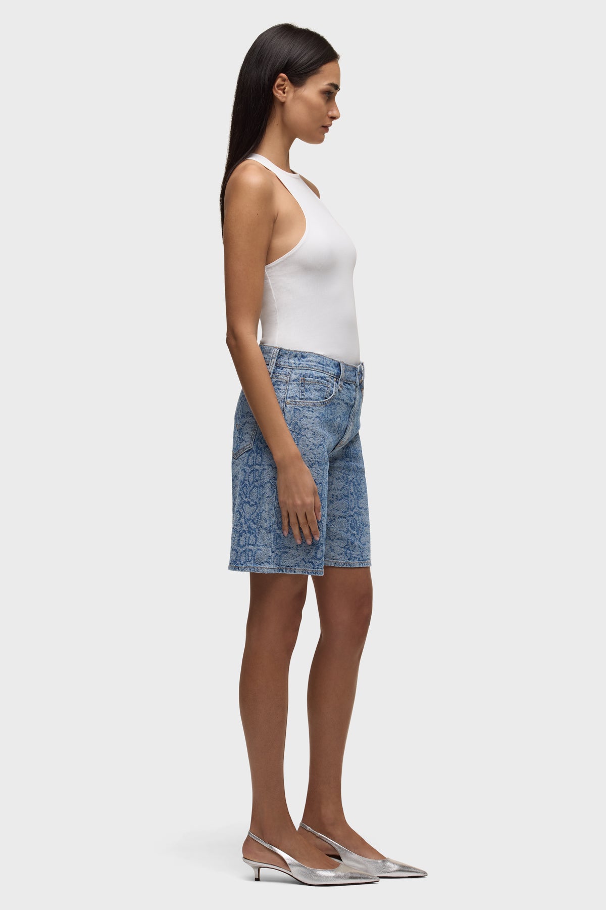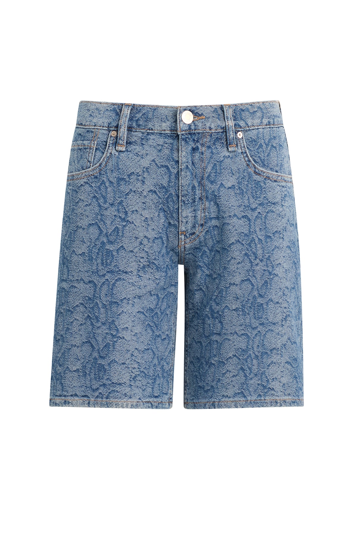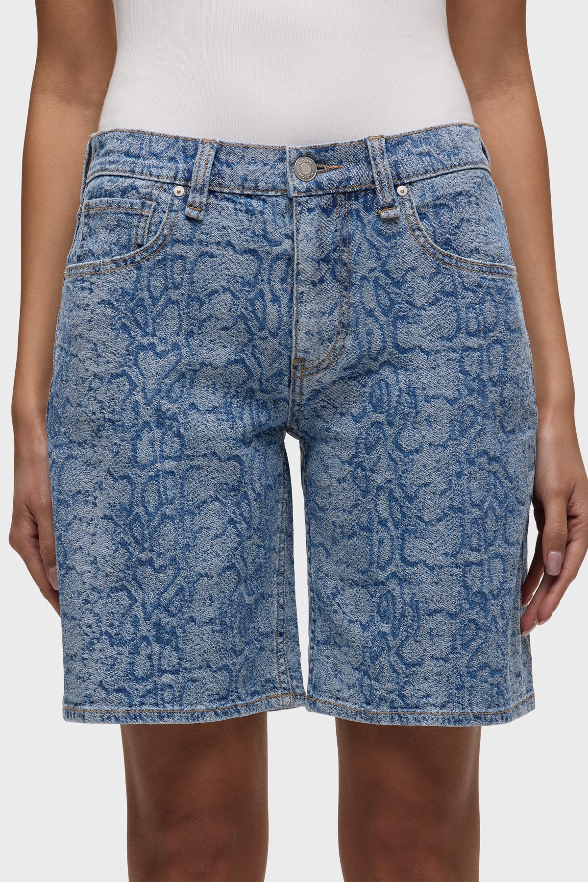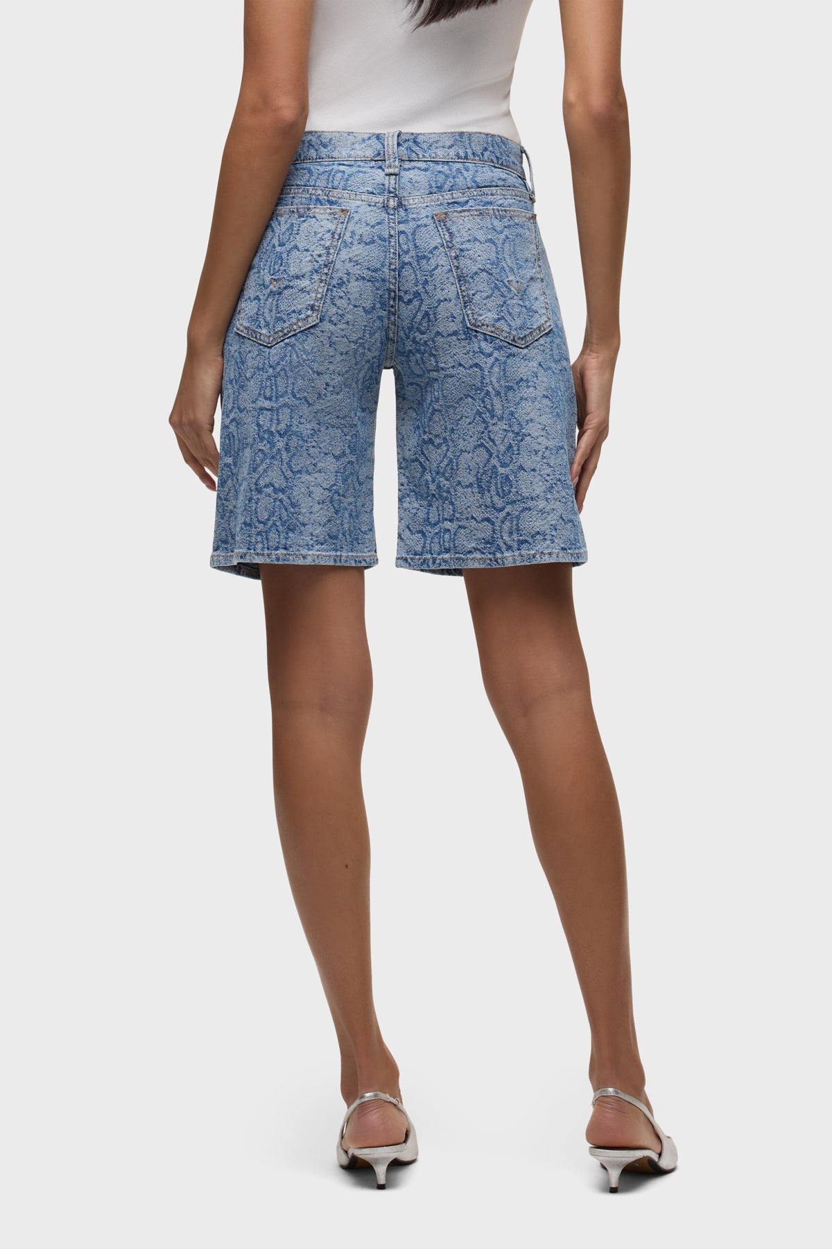 The London Low-Rise Long Short in Venom is a five-pocket casual short with a relaxed, dropped fit, 9" inseam and a clean finished hem. The star of this style is the snake jacquard in a medium indigo wash on slightly stretchy denim. For a looser fit, we recommend sizing up. -