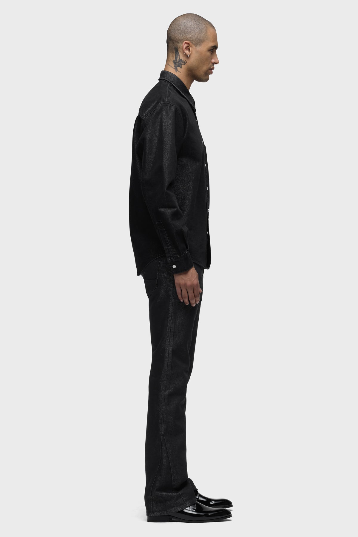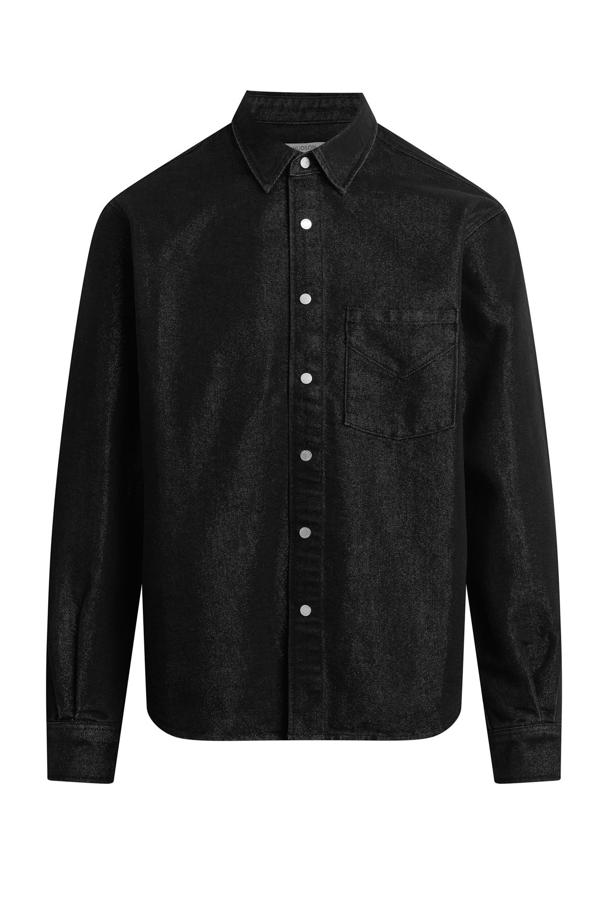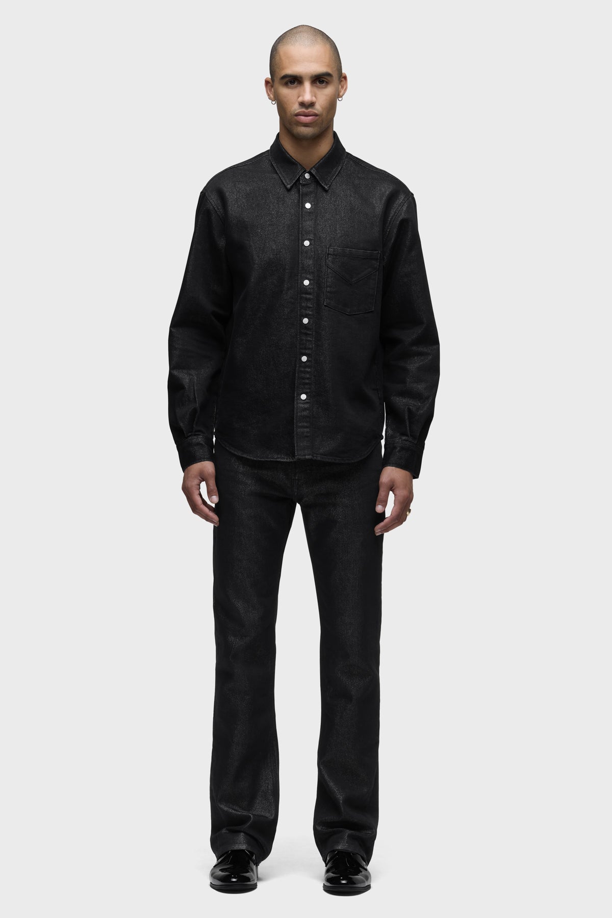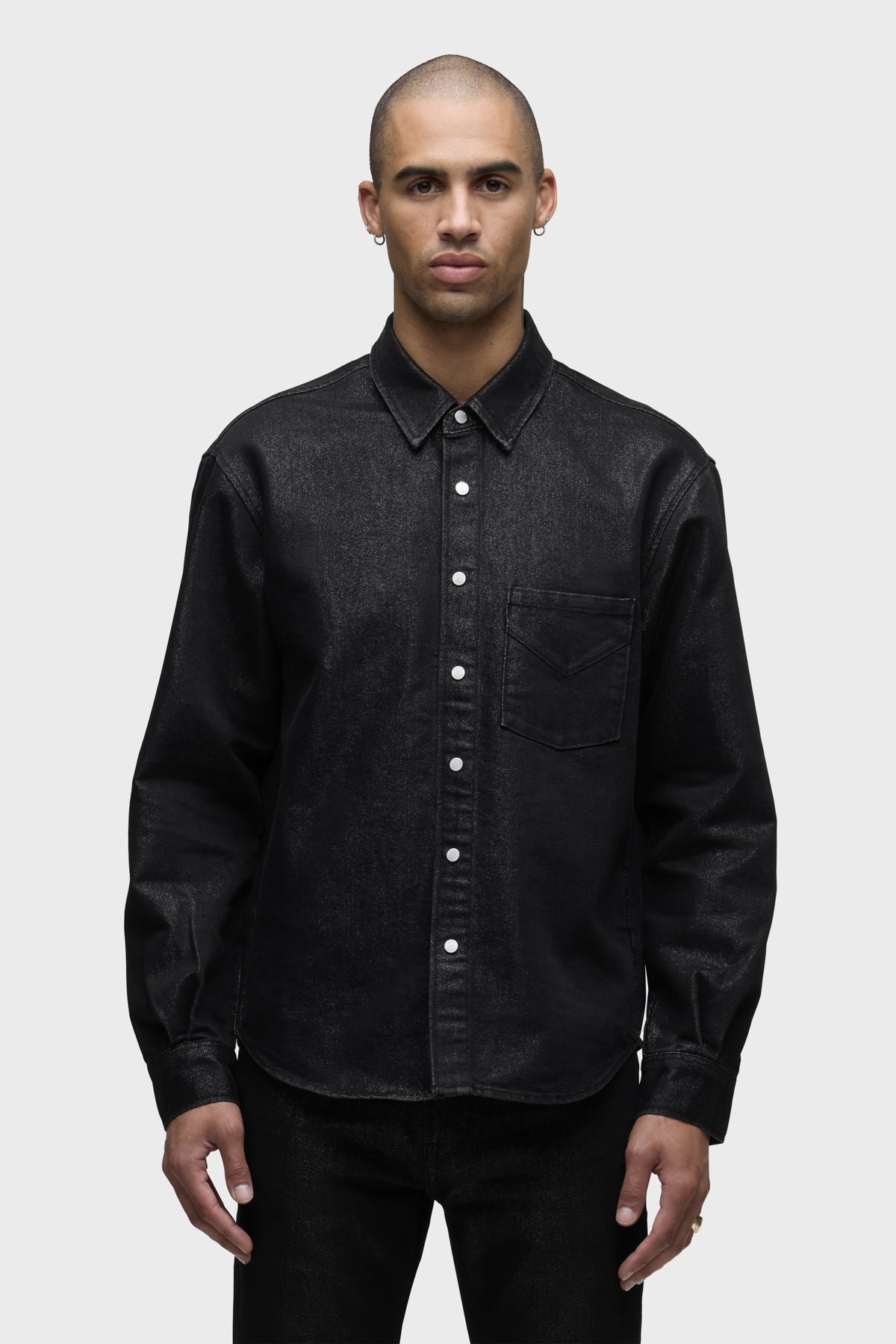 Crafted from black denim woven with silver Lurex for a subtle shimmer, the Long Sleeve Shirt in Stargazer brings understated glam to any look. It is finished with nickel snaps at the front. Pair it with the coordinating Walker Kick Flare for a sleek set. -