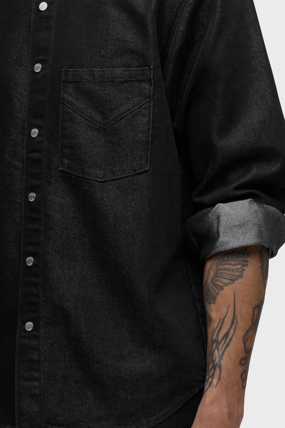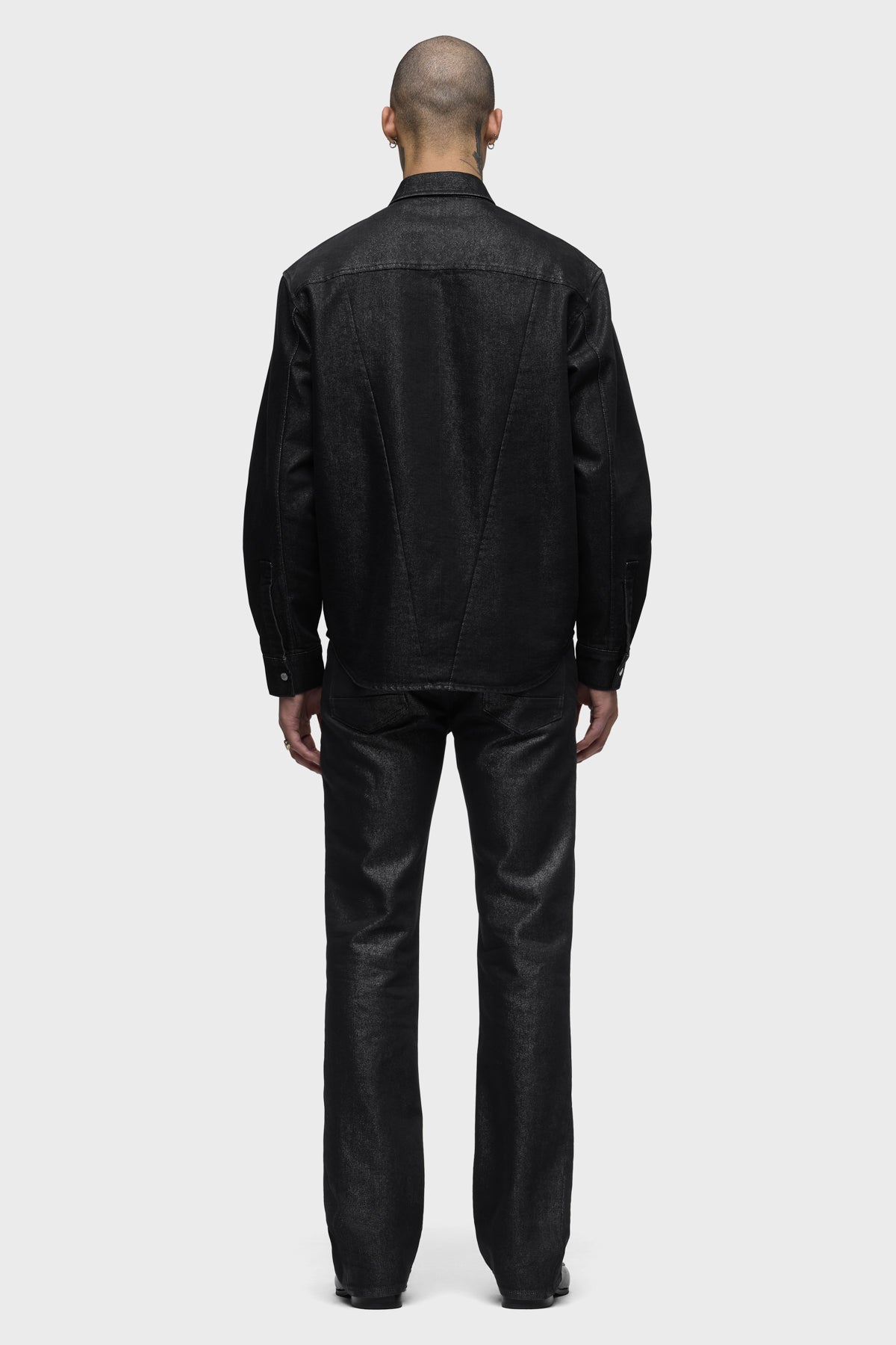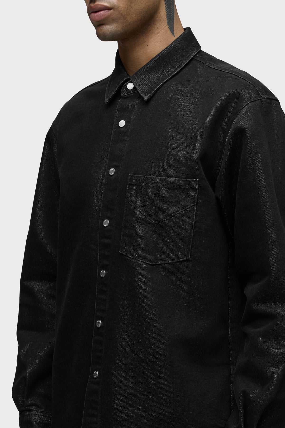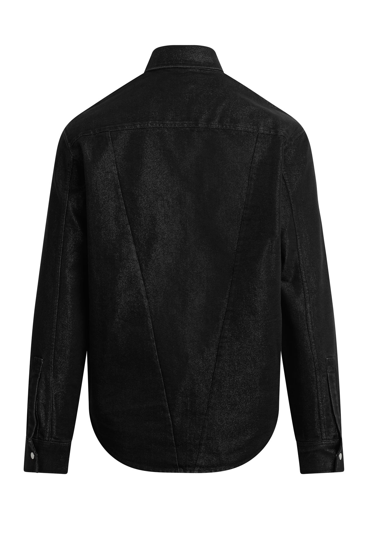 Crafted from black denim woven with silver Lurex for a subtle shimmer, the Long Sleeve Shirt in Stargazer brings understated glam to any look. It is finished with nickel snaps at the front. Pair it with the coordinating Walker Kick Flare for a sleek set. -