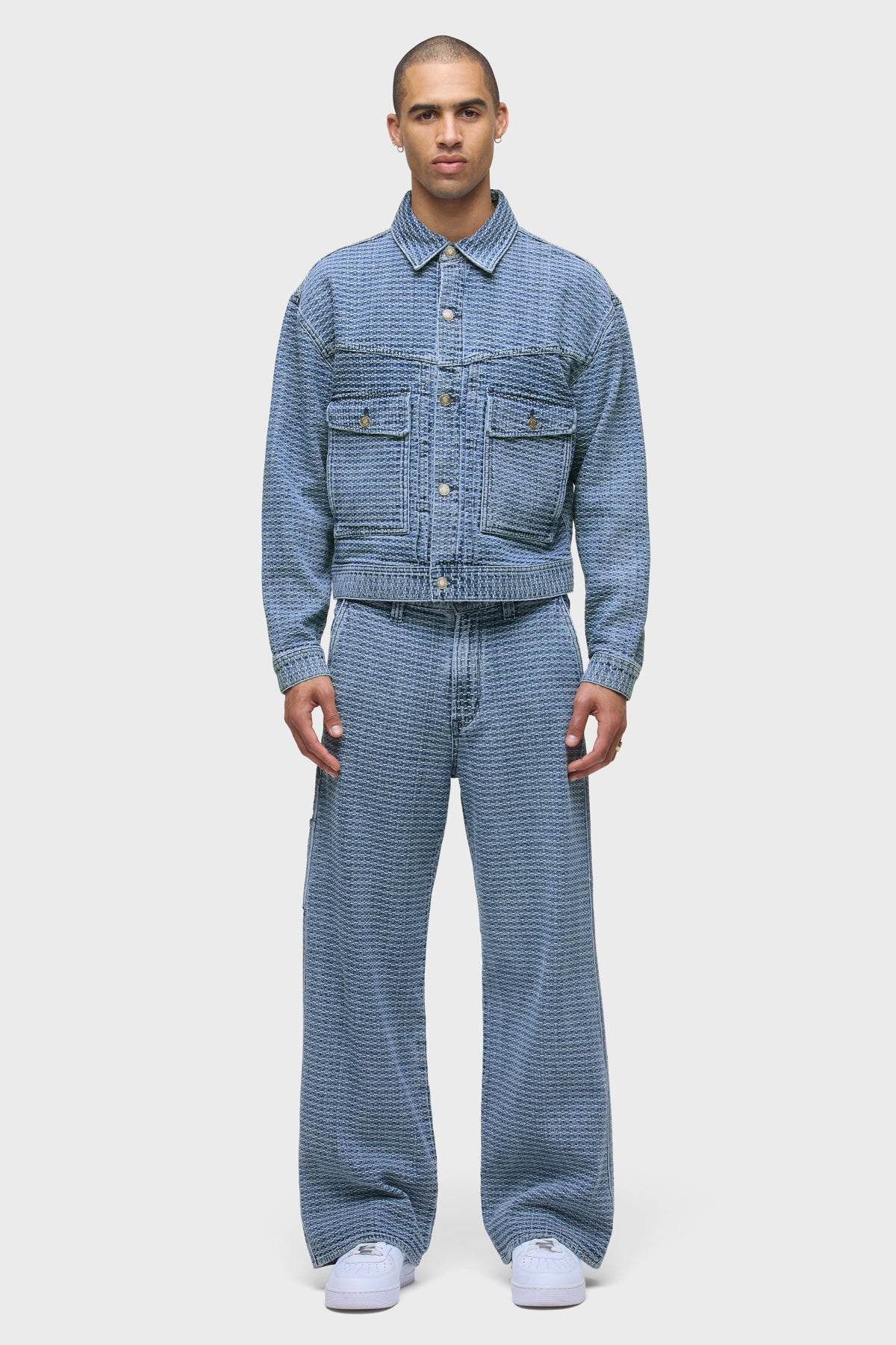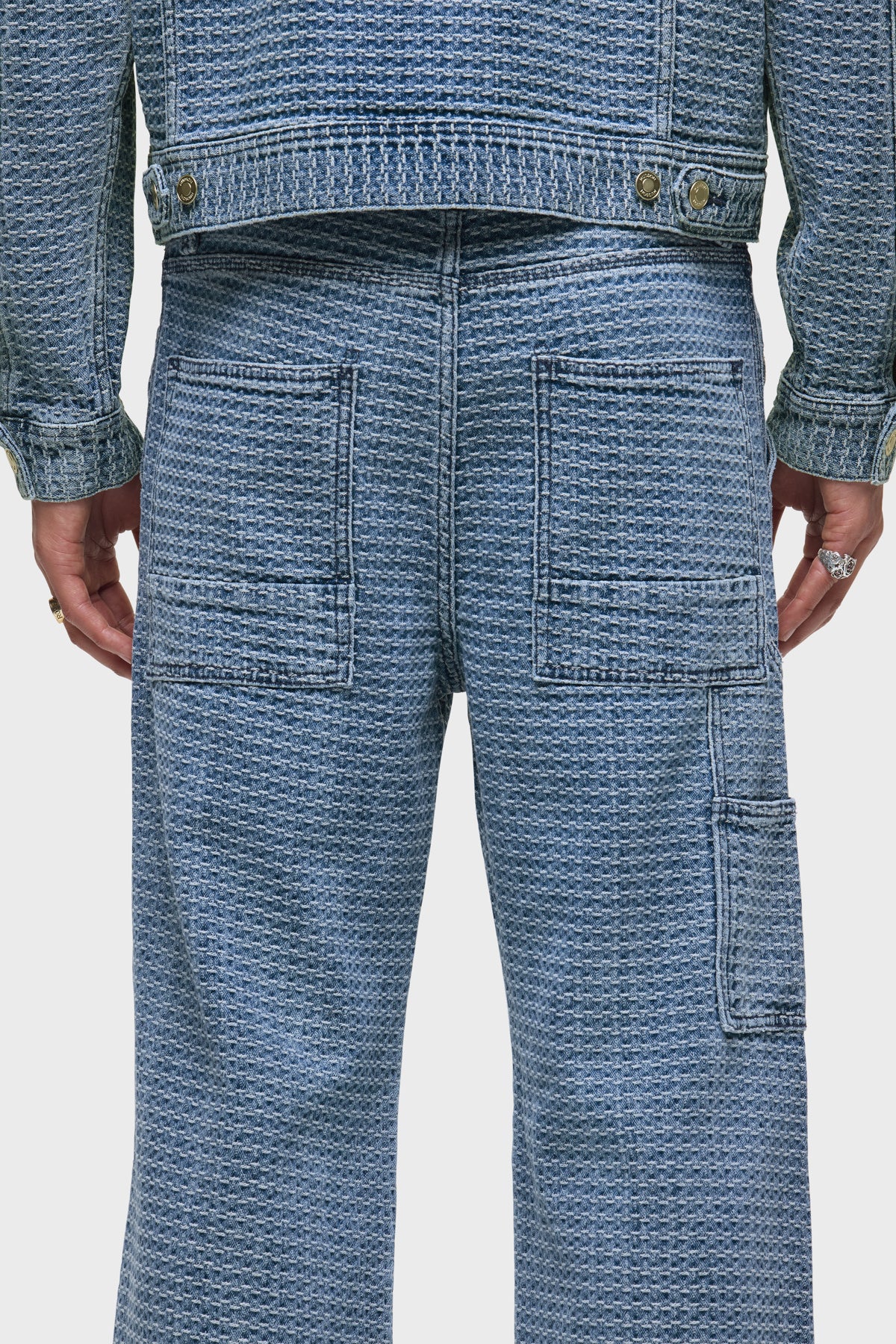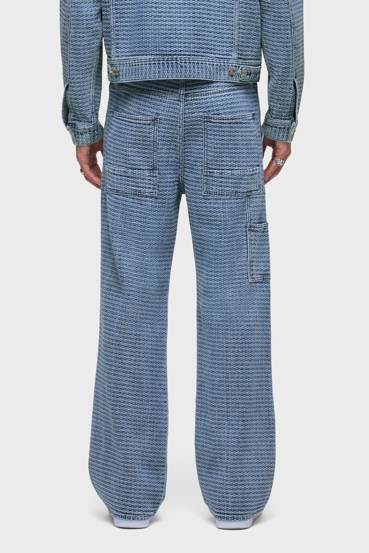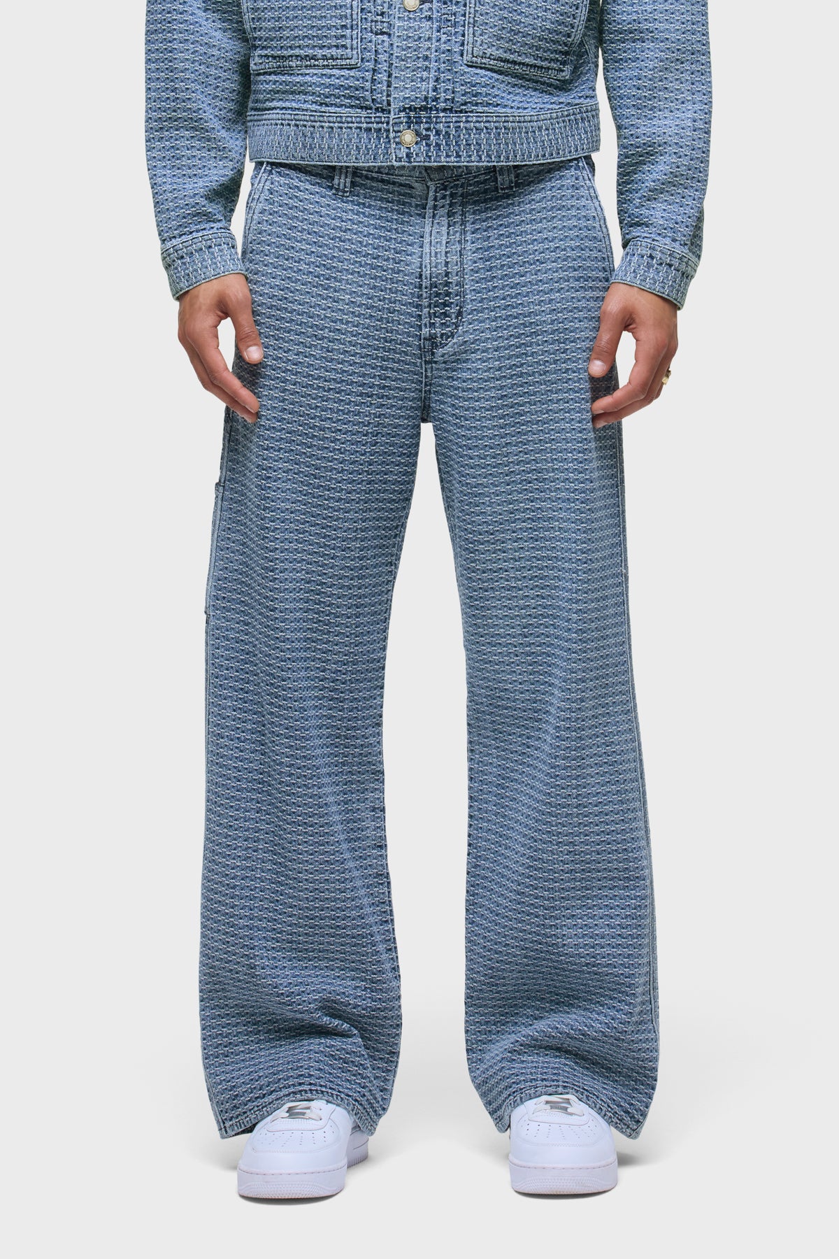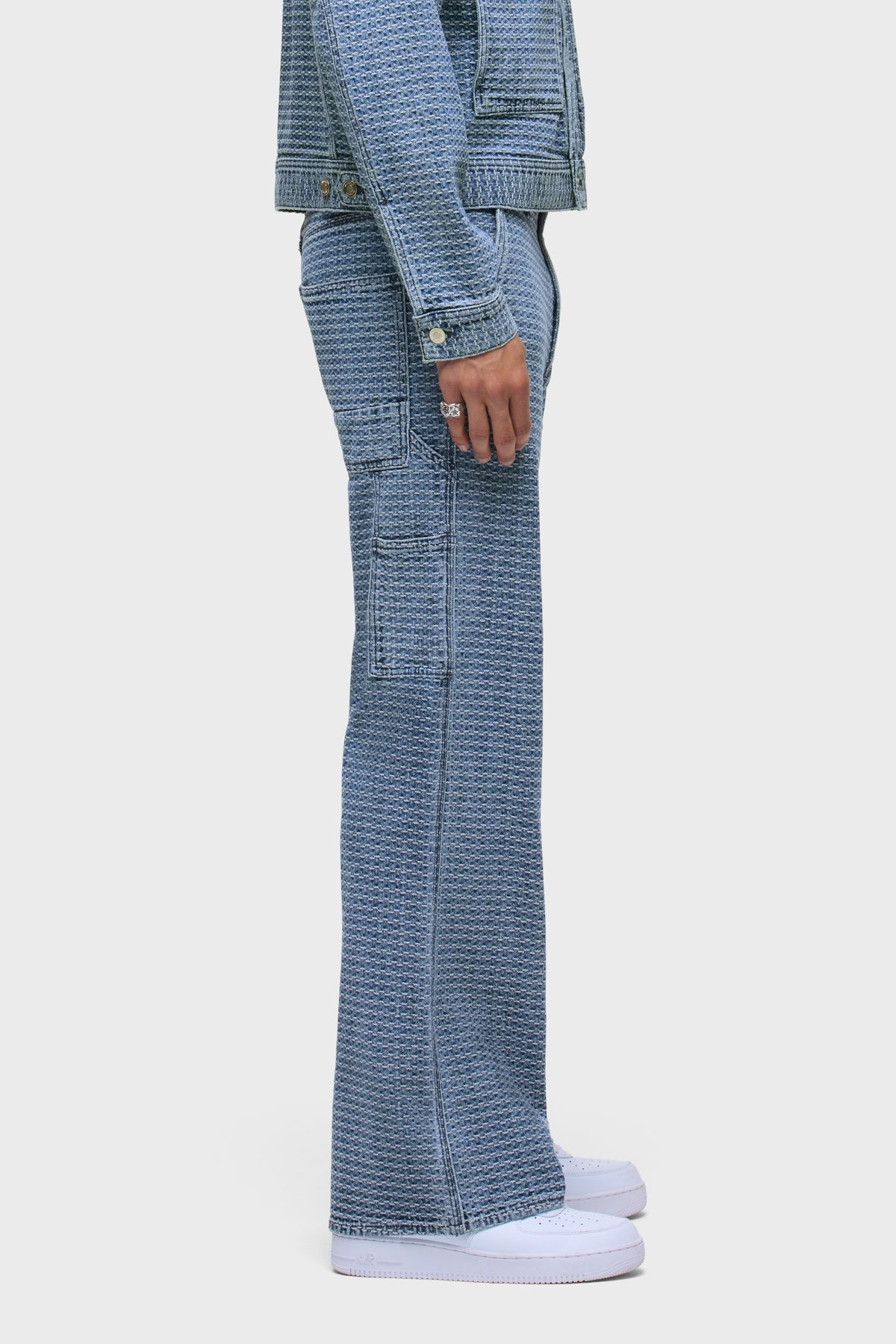 With a 90s grunge look and feel, our Luca Wide Leg Carpenter Jean in Jacquard Indigo is a loose silhouette with a mid-rise waist and wide cut through the leg, now featured in an indigo jacquard fabrication for added visual interest and texture. -