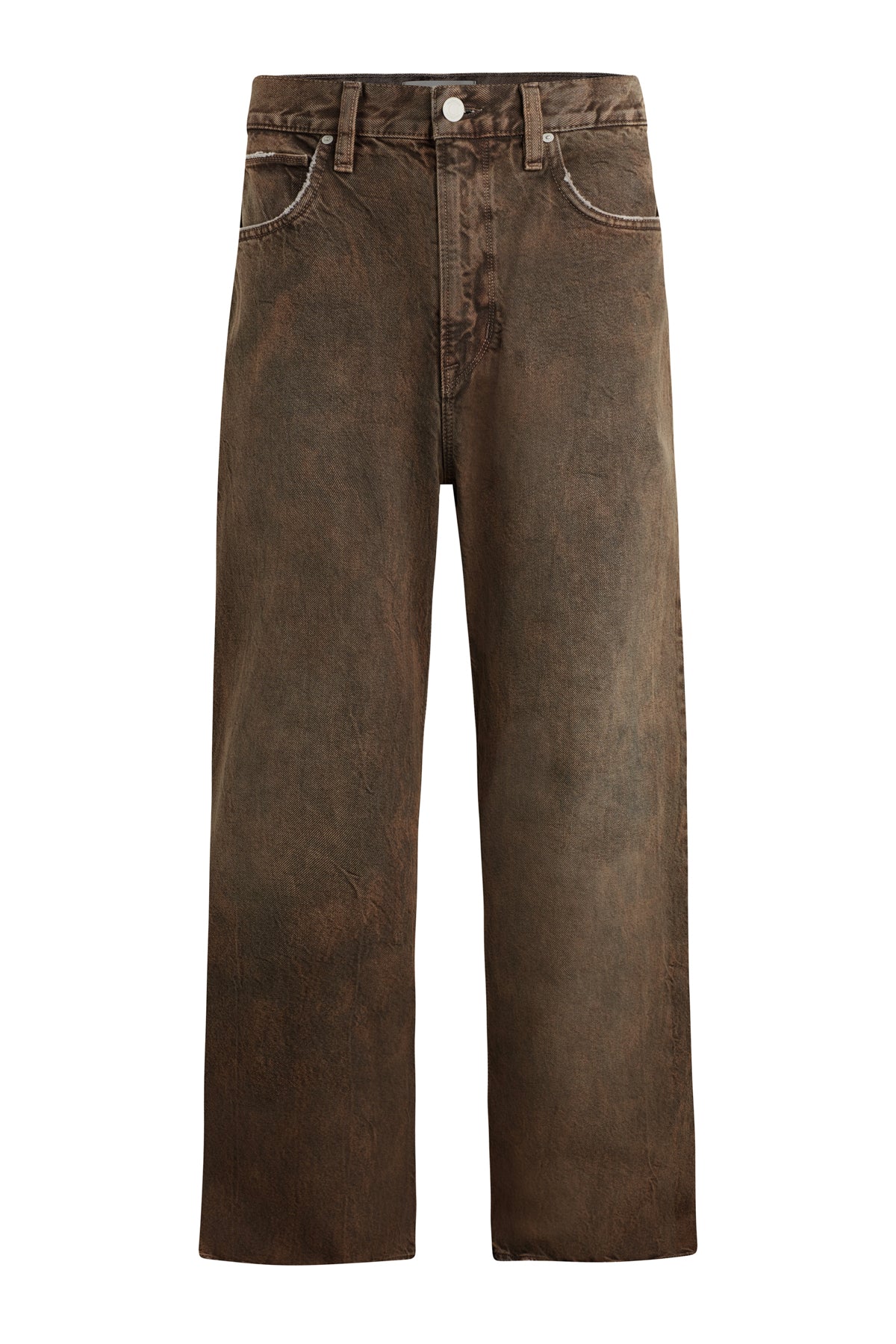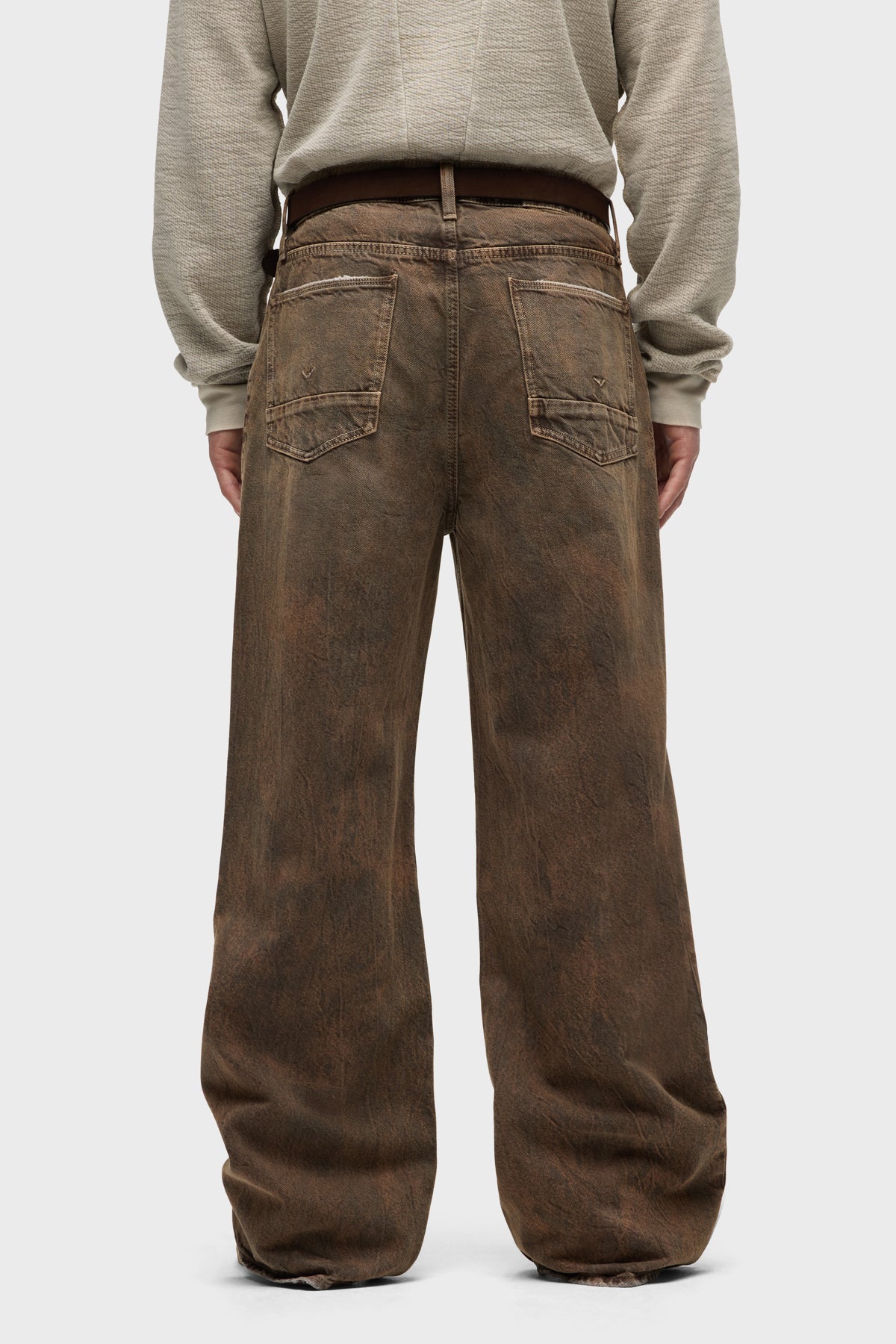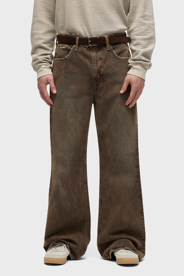 With a 90's grunge look and feel, our Luca Wide Leg Jean in Dark Earth has a loose fit, mid-rise waist and is wide cut through the leg. The distressed dark brown wash is overdyed for a lived-in, stained look and is finished with five-pocket detailing, grinding along the edges and matte grey hardware with signature embroidery at the waistband. -