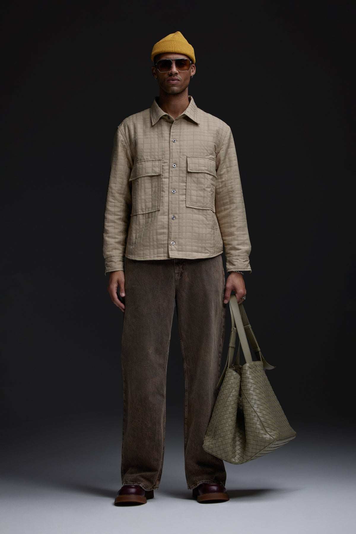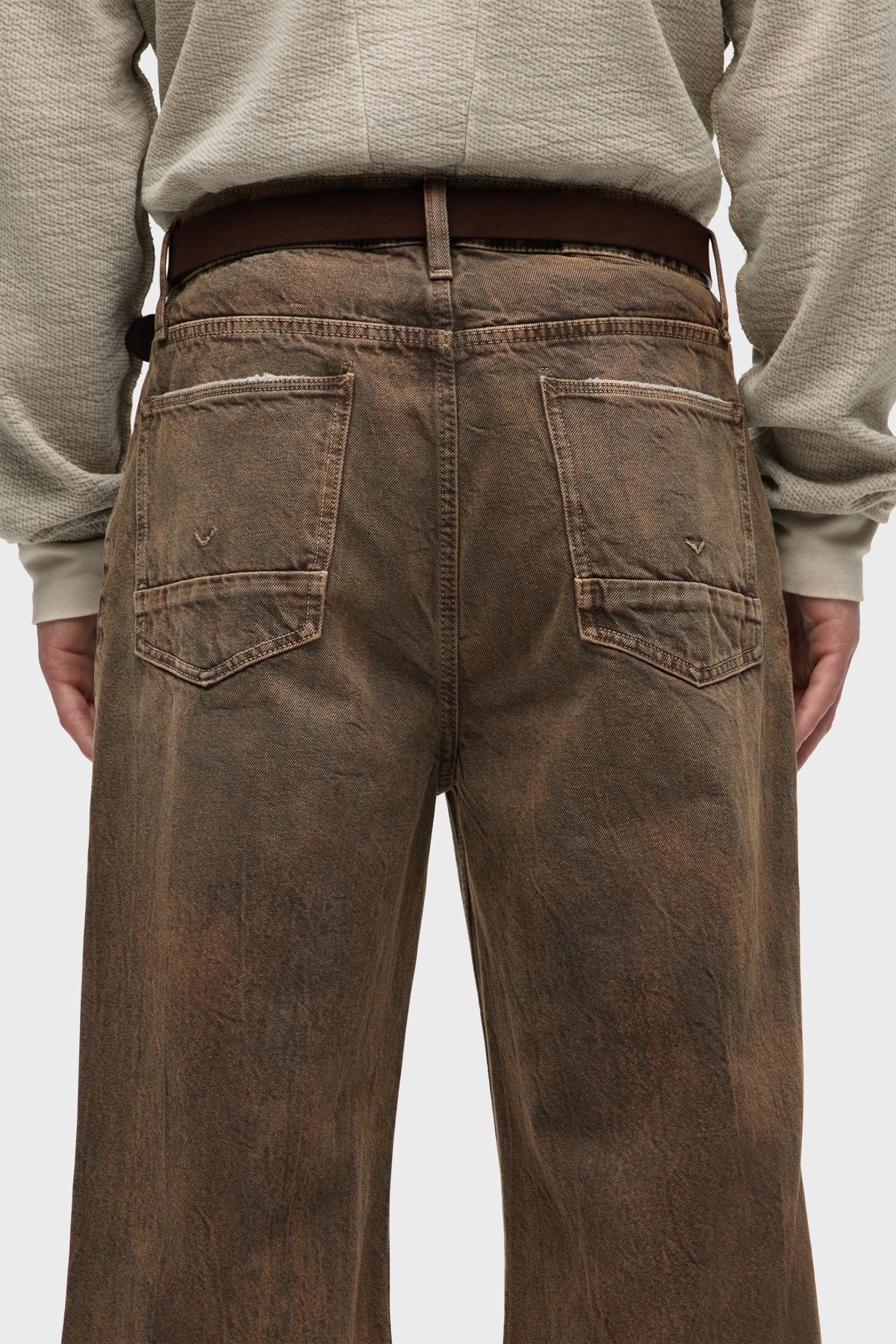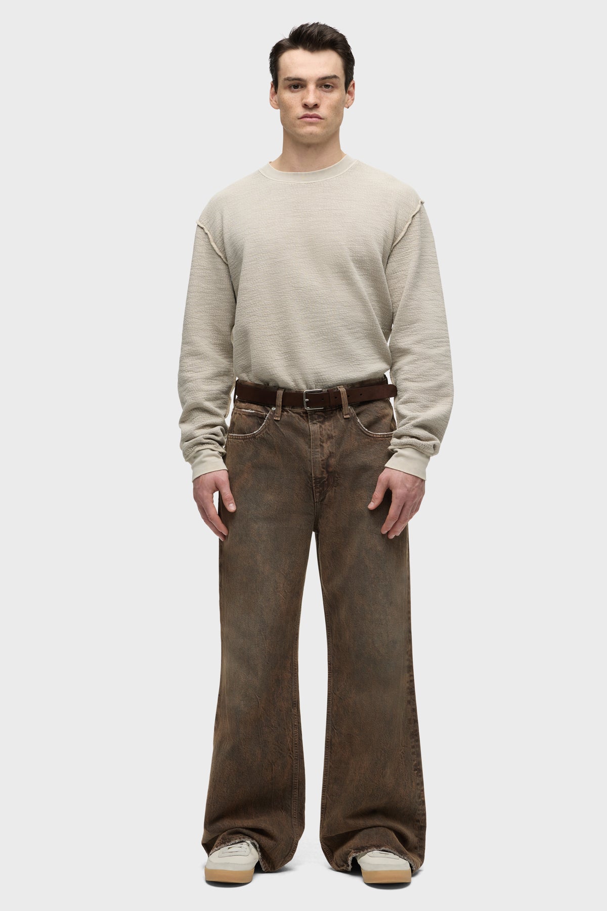 With a 90's grunge look and feel, our Luca Wide Leg Jean in Dark Earth has a loose fit, mid-rise waist and is wide cut through the leg. The distressed dark brown wash is overdyed for a lived-in, stained look and is finished with five-pocket detailing, grinding along the edges and matte grey hardware with signature embroidery at the waistband. -