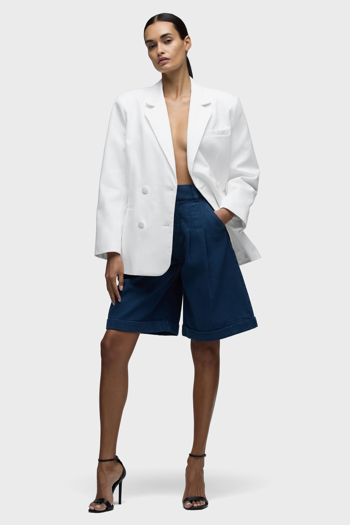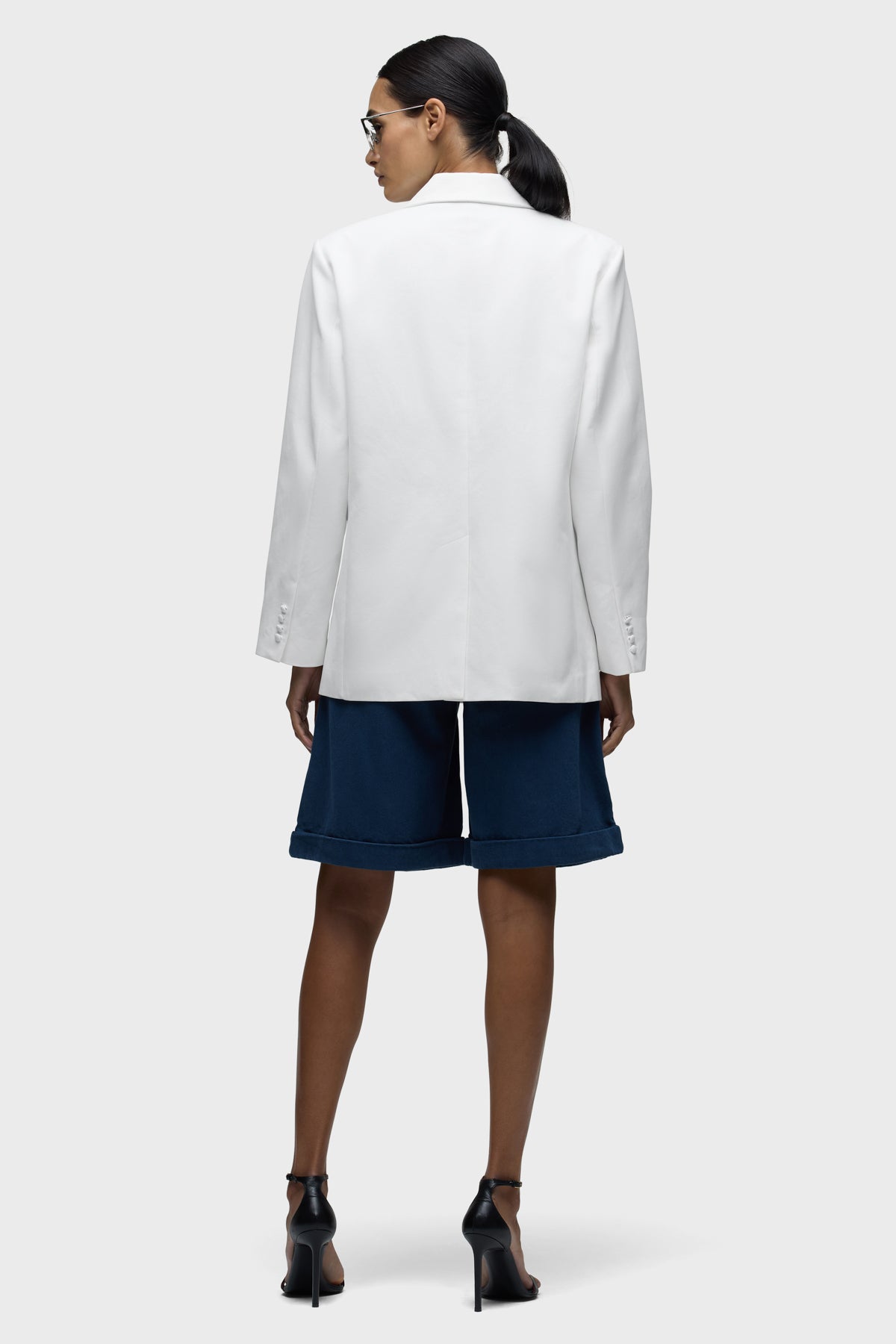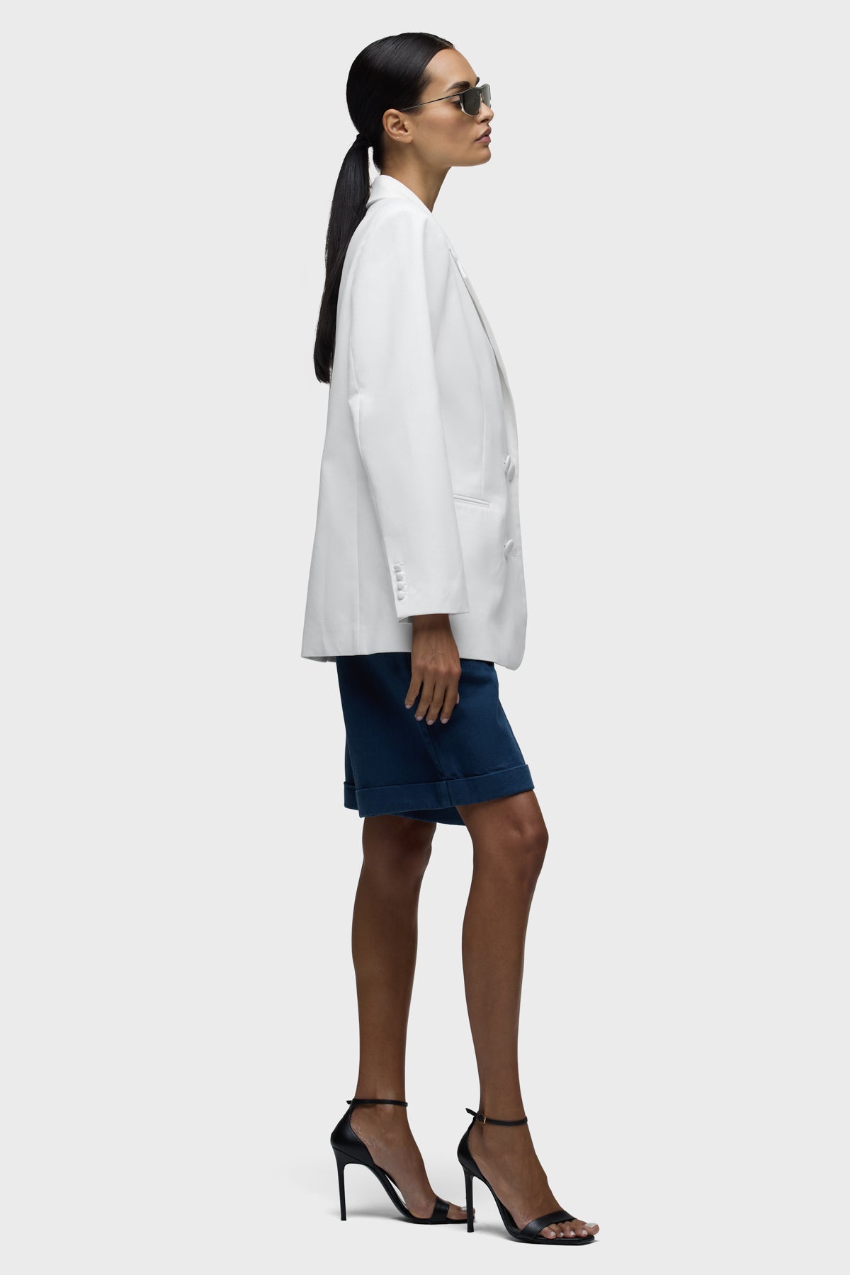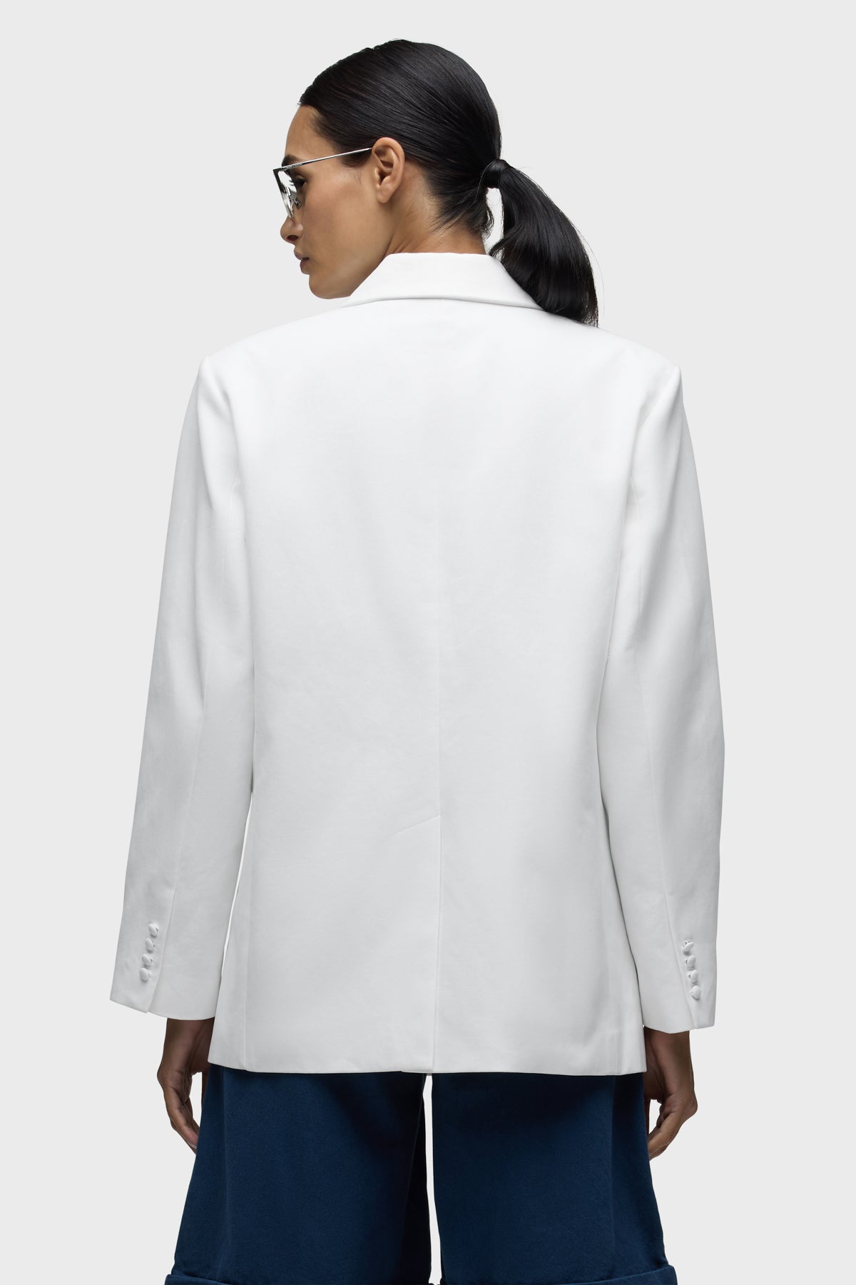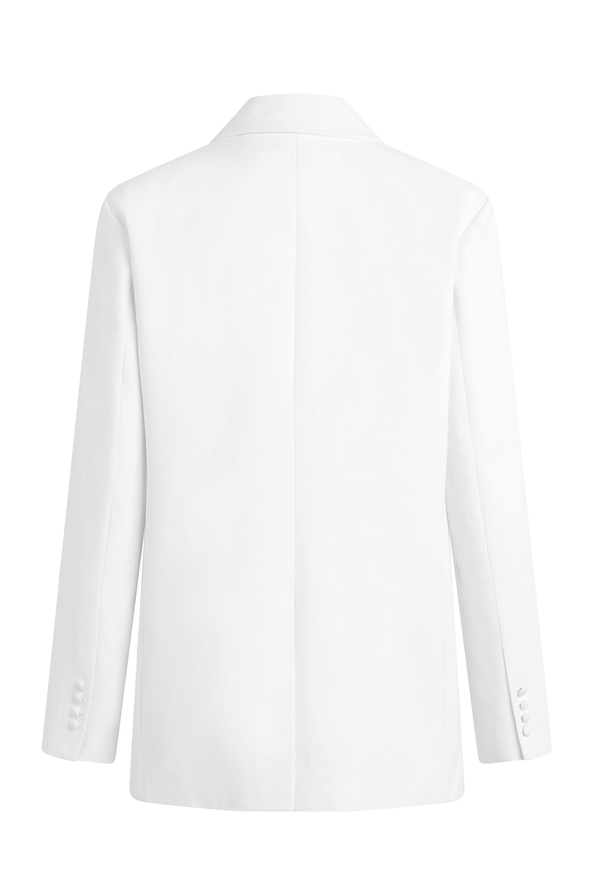 Part of our Brooks Nader collab capsule, the Mae Oversized Blazer in White is a fully lined, double breasted blazer with self covered buttons, an oversized body and shoulder pads. This capsule was curated by model Brooks Nader and features her personal closet must-haves. -