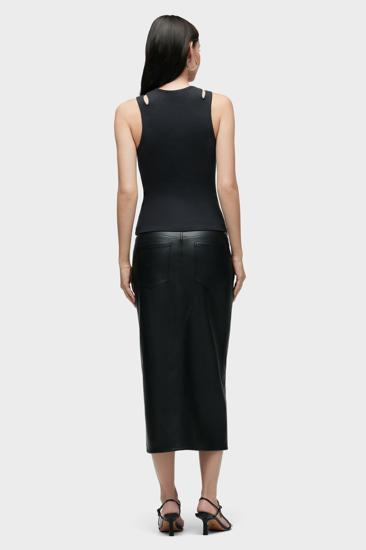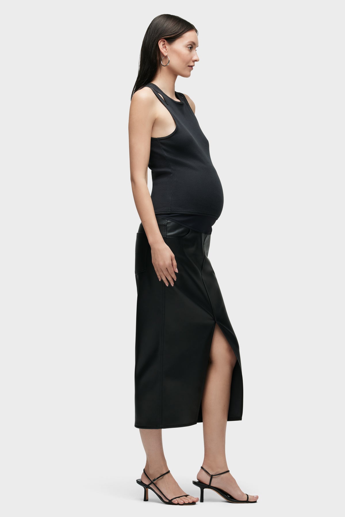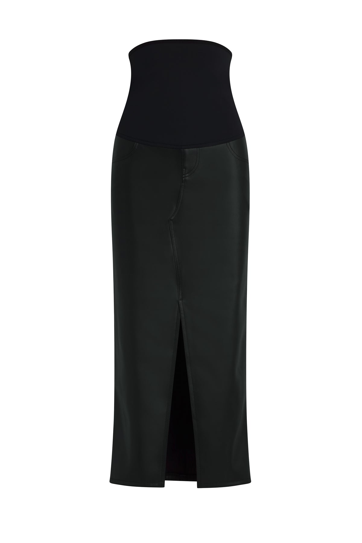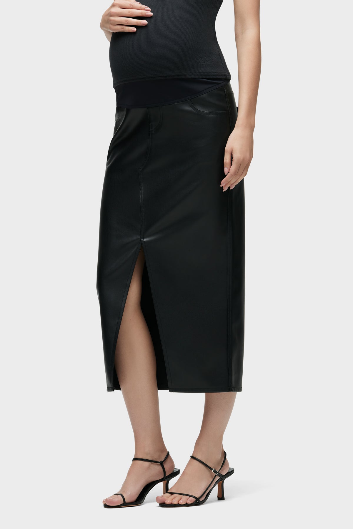 Long and sleek, our popular Maternity Reconstructed Skirt in Black is crafted with a comfortable stretchy belly band and a high center slit. Done in Illusion black vegan leather for an elevated and stylish fit. -