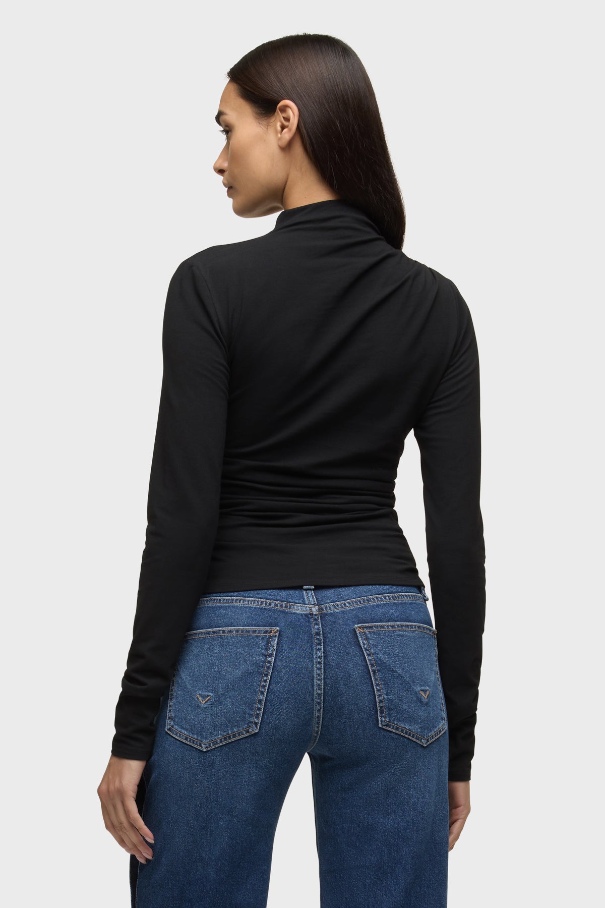 Our Mock Neck Long Sleeve in Black is made to fit closer to the body for a sleek look. This top features ruching at the side seam and neckline for a nice shape on the body. It is made of black stretch jersey fabric. -
