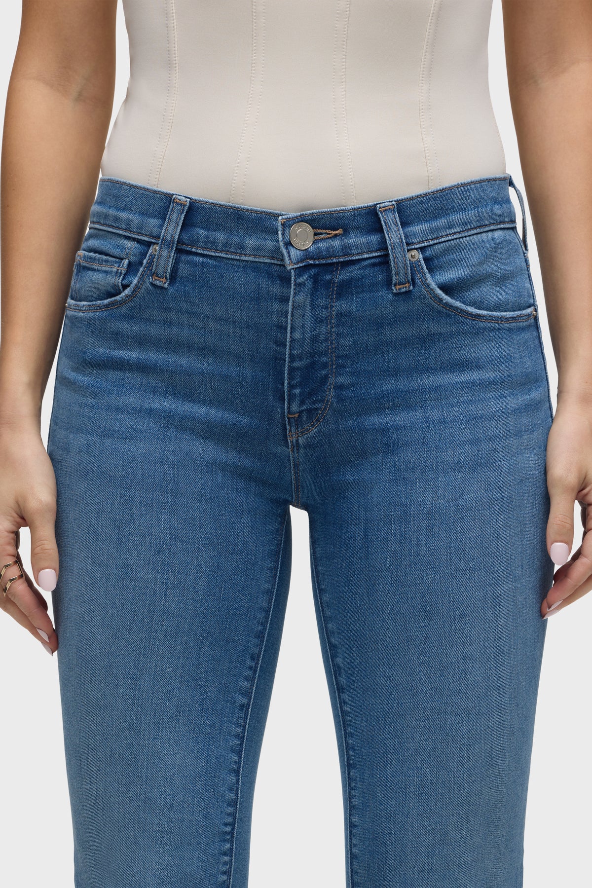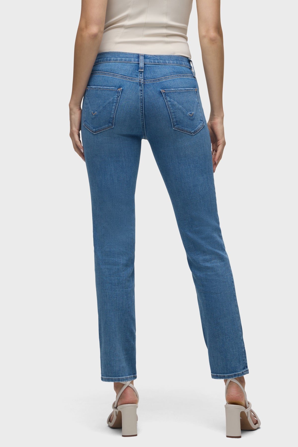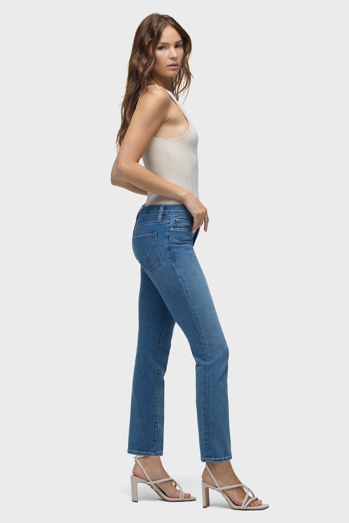 Our Nico Mid-Rise Straight Ankle Jean in Sun Up is cropped for the ideal ankle length and finished with classic five-pocket styling. Its medium indigo wash features stone washing, bleaching, whiskering, all-over hand-sanding and edge grinding on stretch denim. -