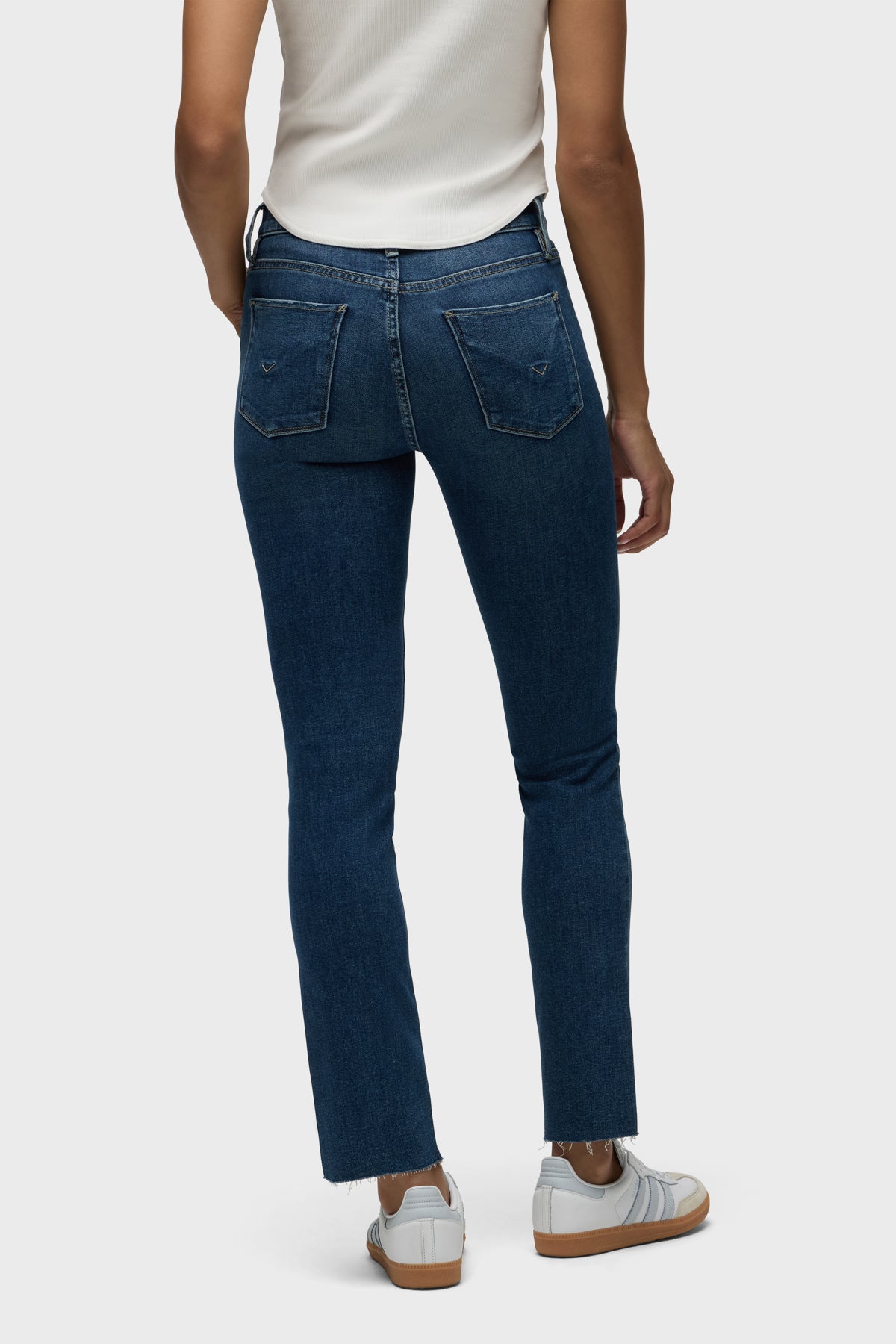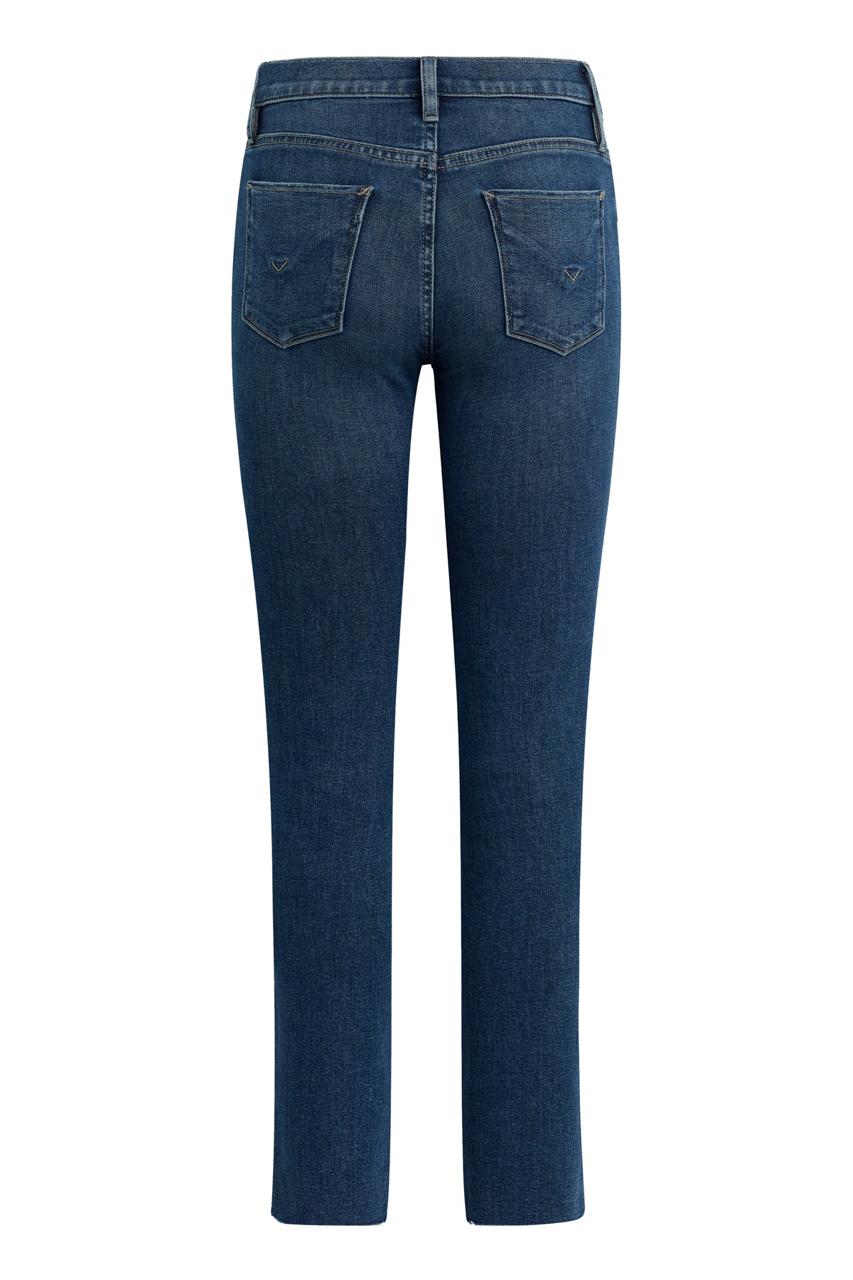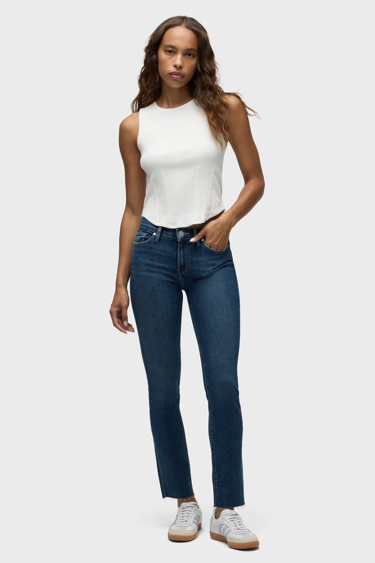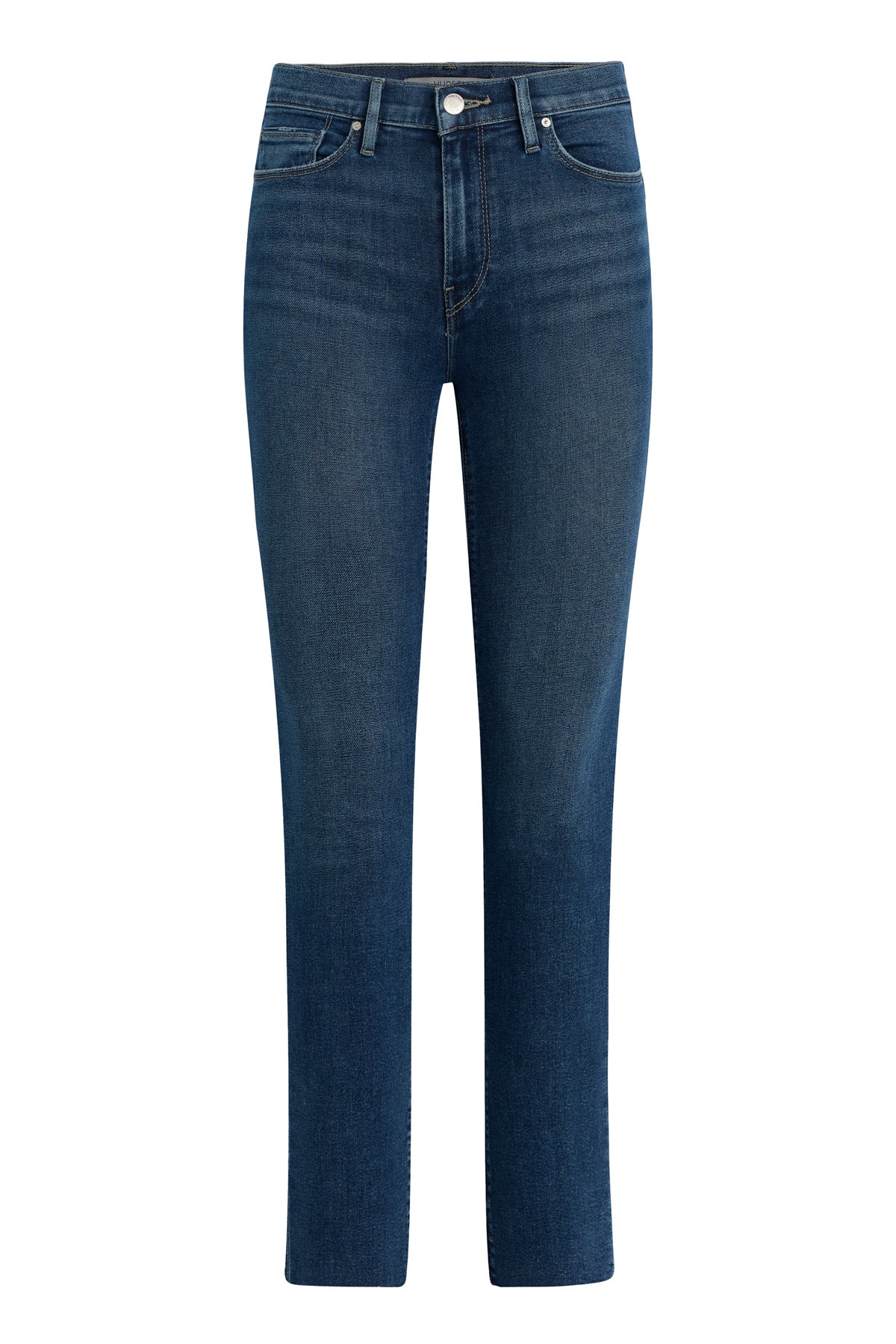 Our Nico Mid-Rise Straight Jean is made from premium stretch denim with a 30" inseam. The medium-dark Park City wash is finished with whiskering, grinding along the edges, classic five-pocket details and a raw hem. -