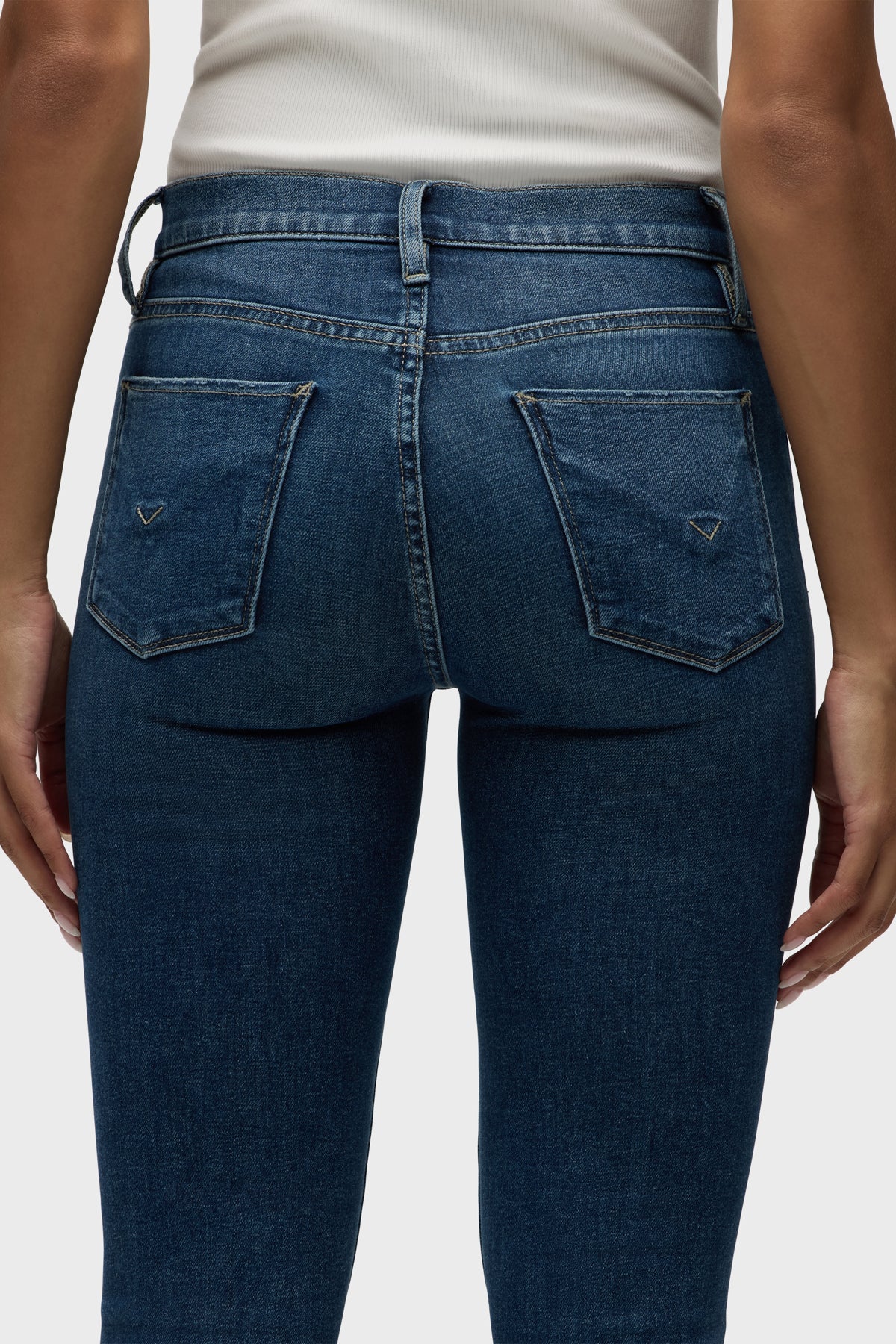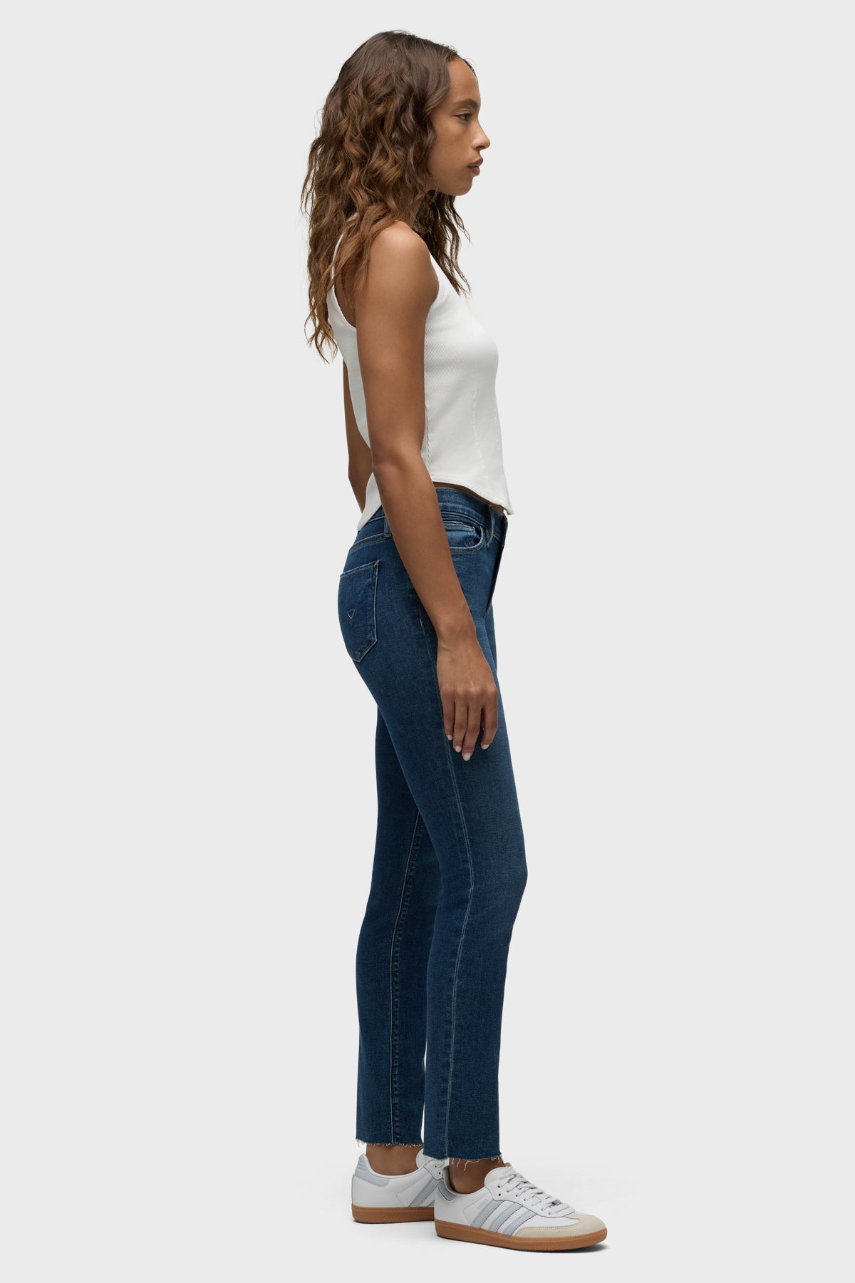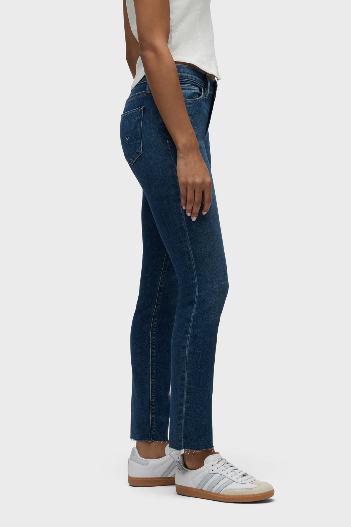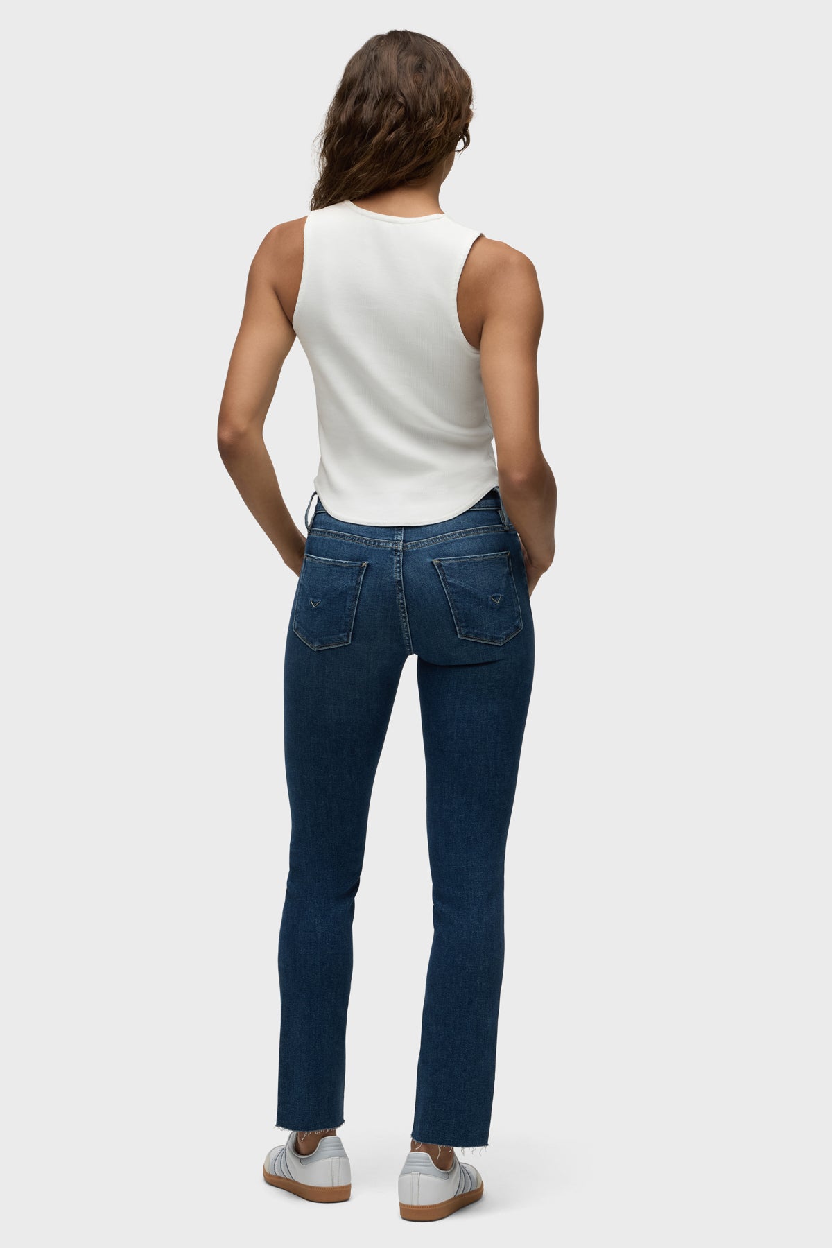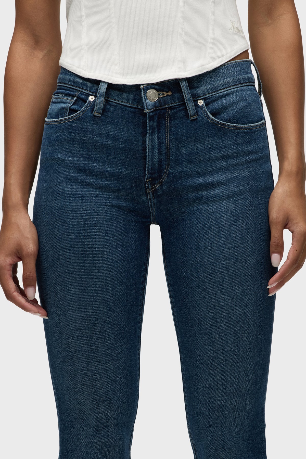 Our Nico Mid-Rise Straight Jean is made from premium stretch denim with a 30" inseam. The medium-dark Park City wash is finished with whiskering, grinding along the edges, classic five-pocket details and a raw hem. -