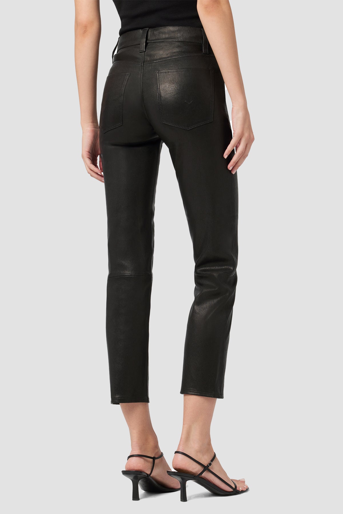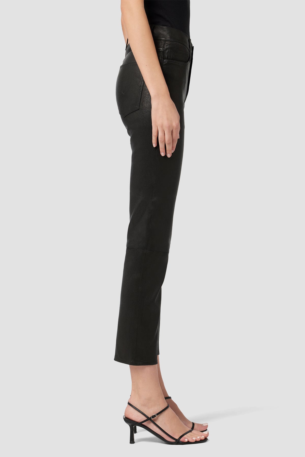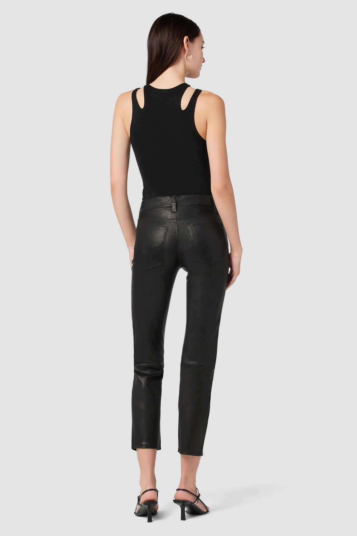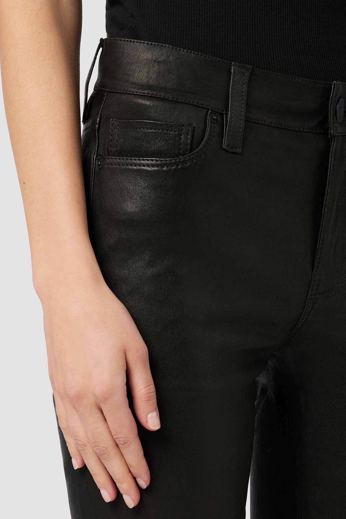 Not your standard black pants. Our Nico Mid-Rise Straight Leather Crop Pant in Black is crafted from panels of supple, stretchy lamb leather with a sleek, glossy finish. Cropped at the ankle, it sits at the natural waist and features a comfortable straight silhouette. -