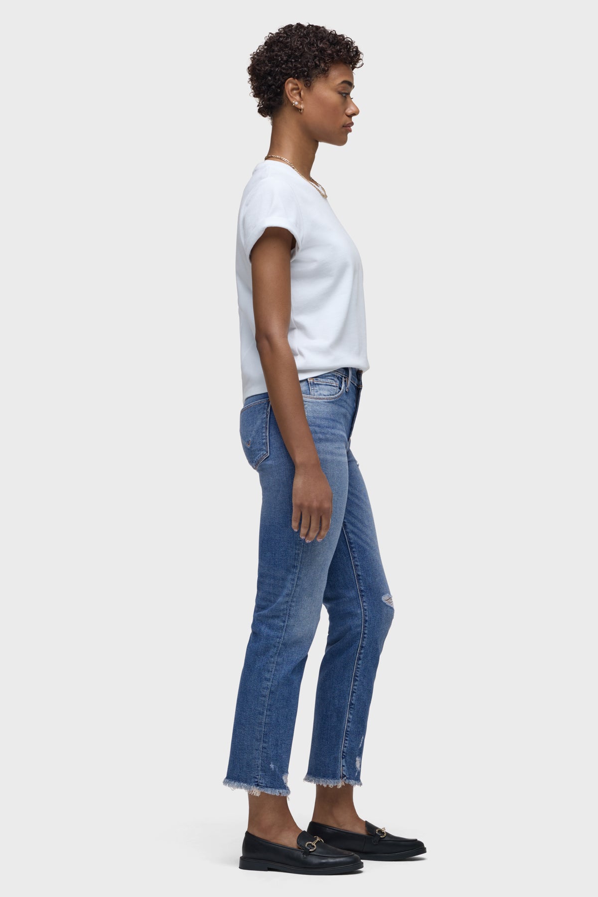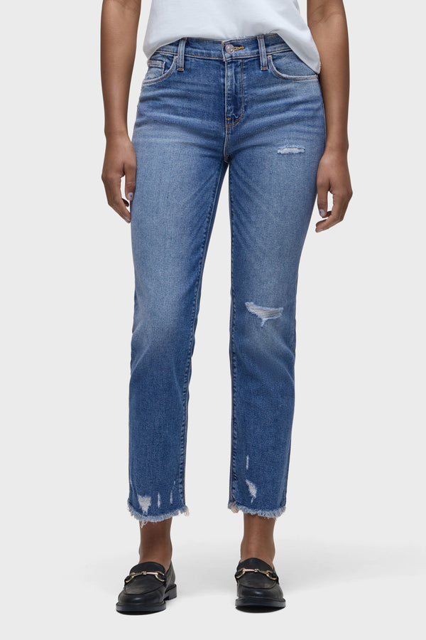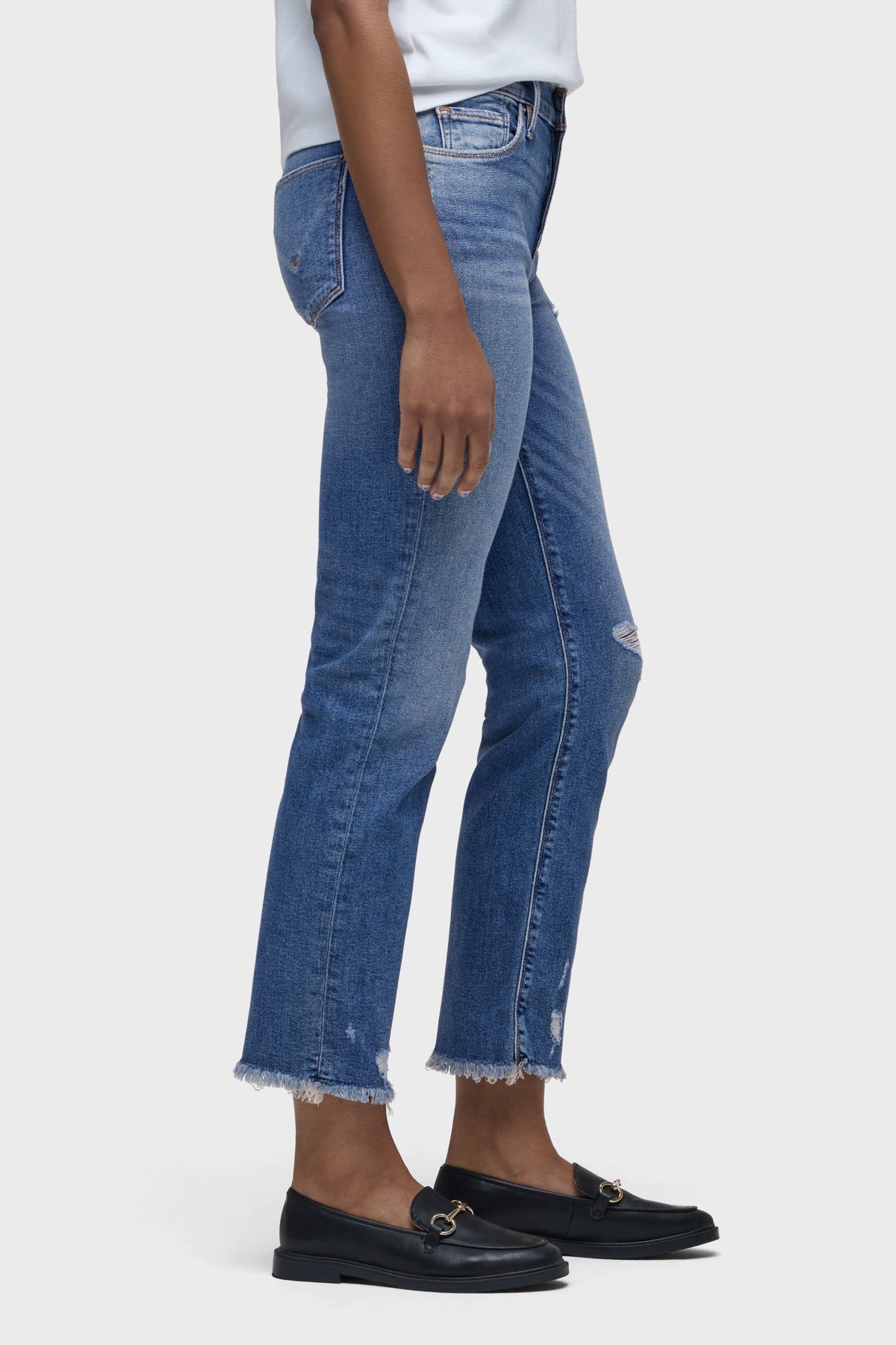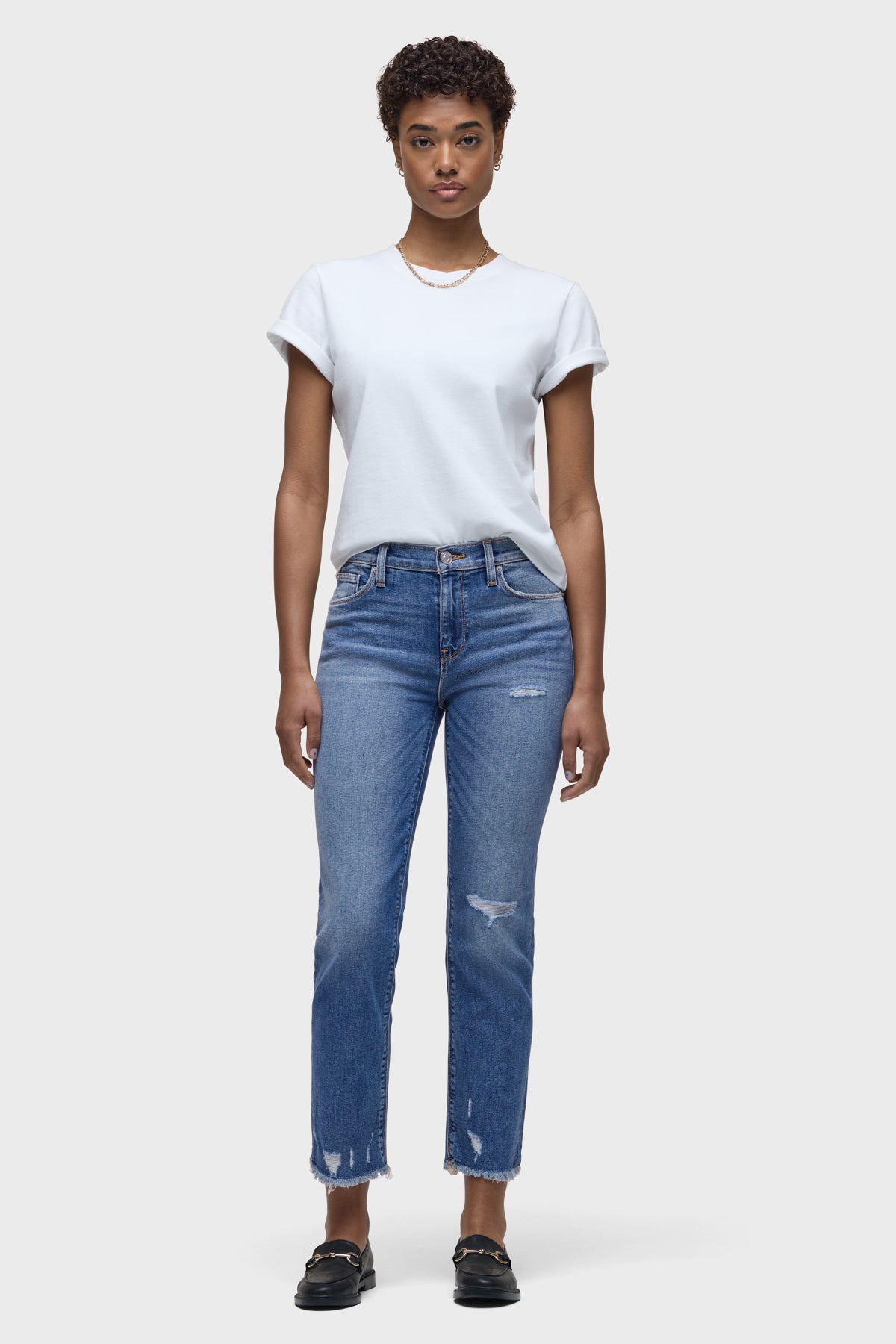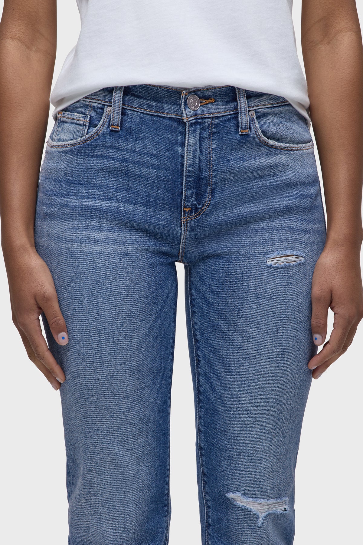 Our Nico Mid-Rise Straight Crop Jean in medium indigo Seaglass is cut in a universally flattering silhouette from premium super stretch denim that smooths, sculpts, and holds its shape. Features a cropped length, classic five-pocket details, a raw hem, and distressing for a worn-in feel.