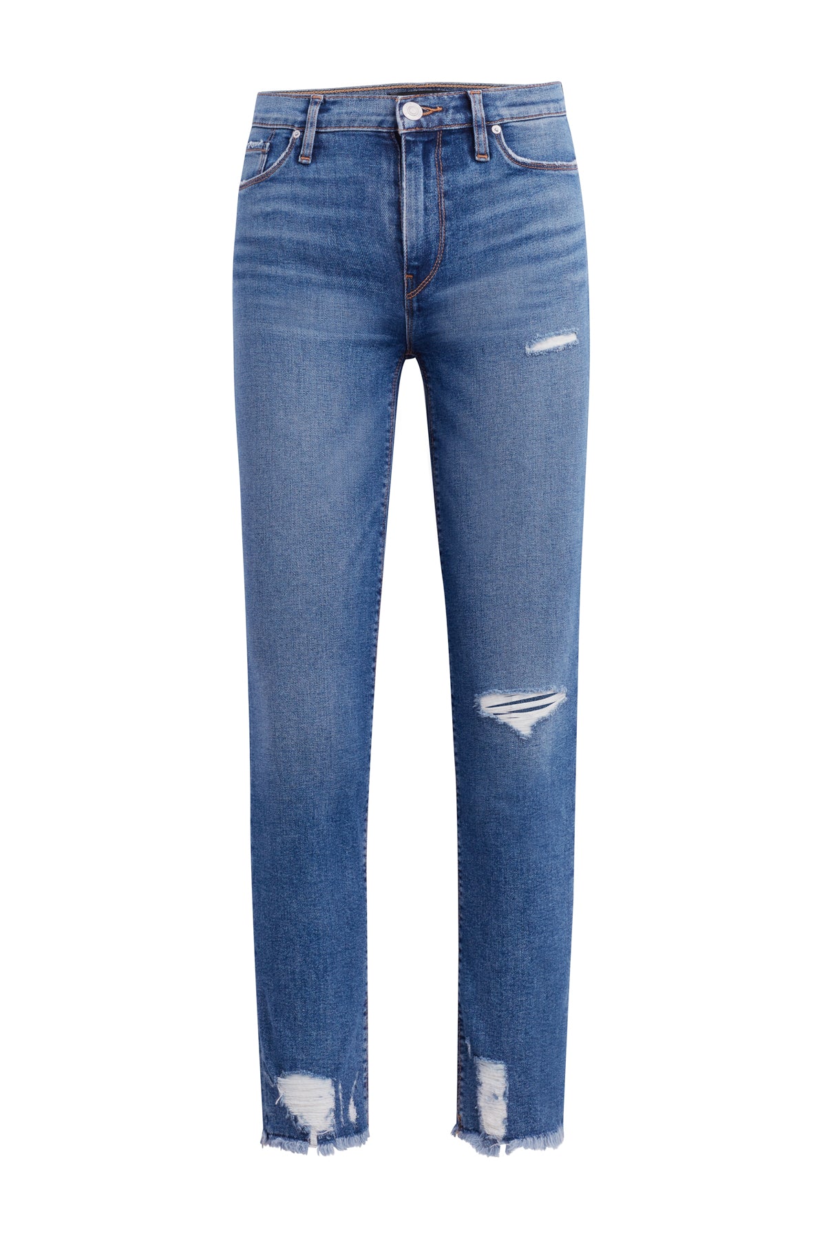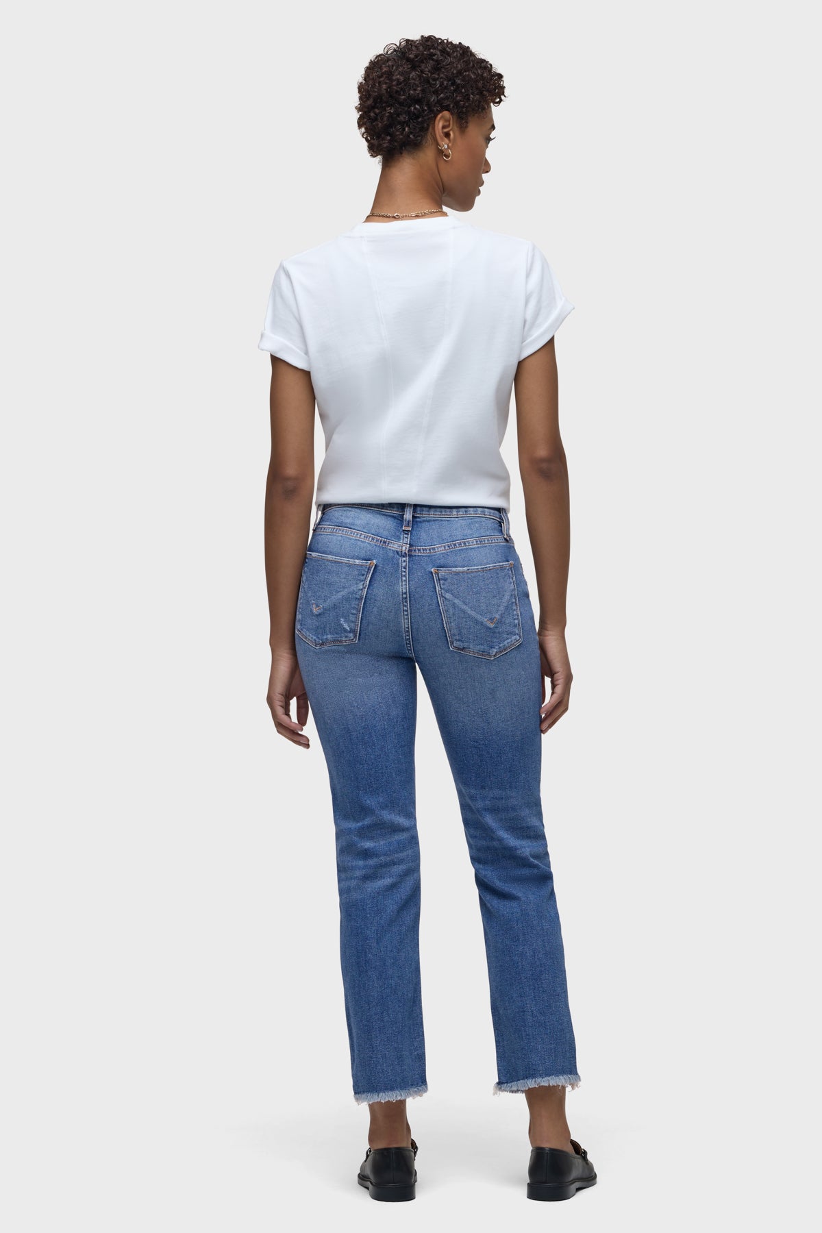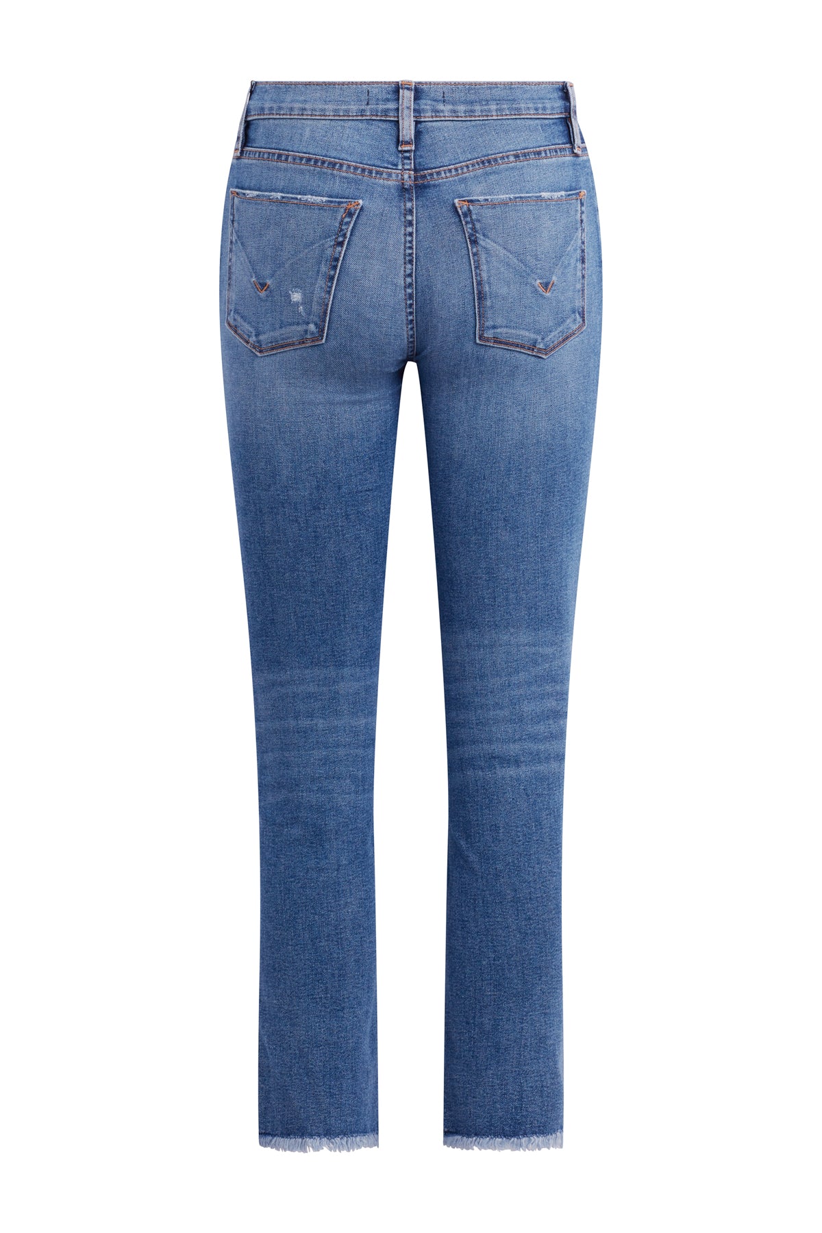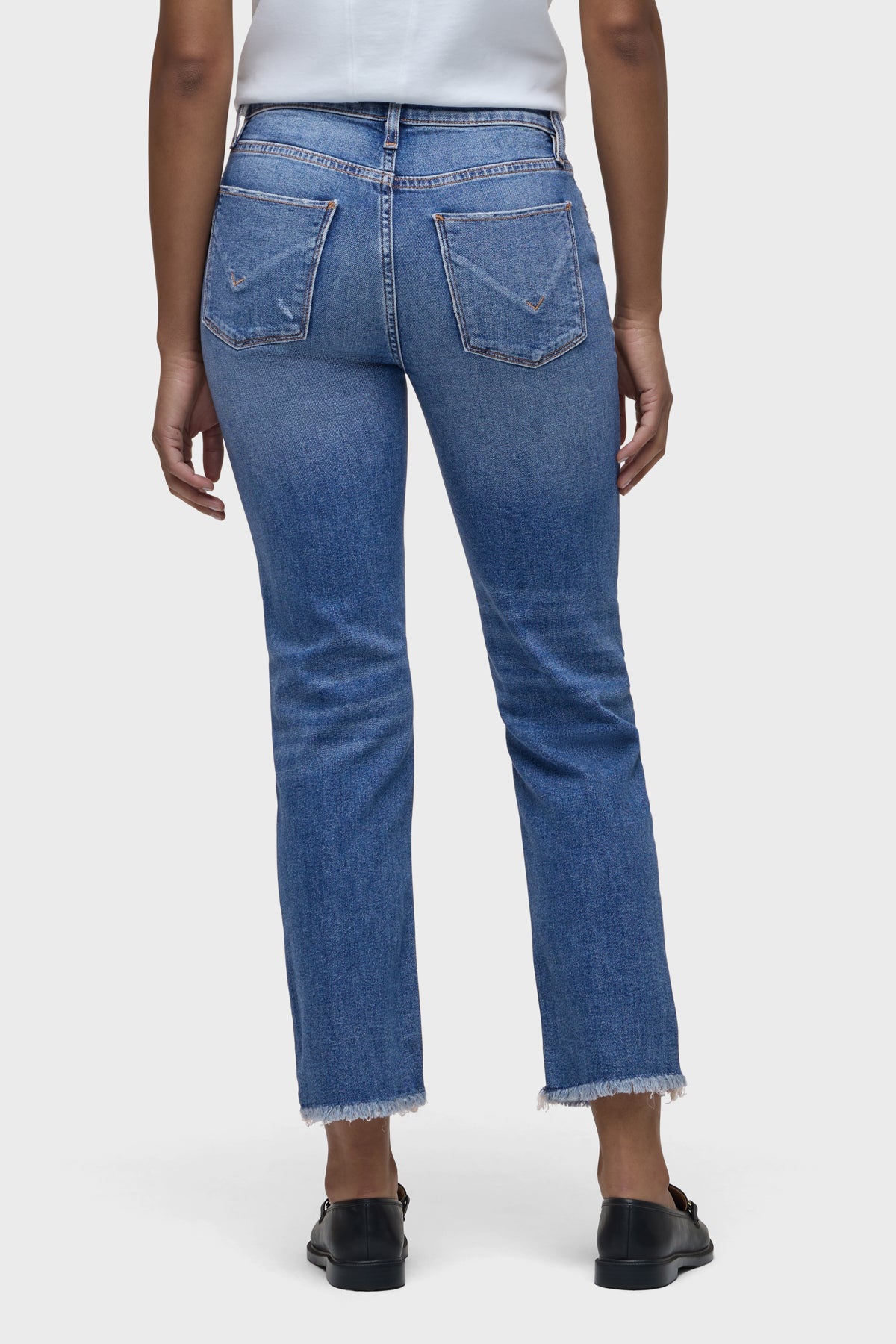 Our Nico Mid-Rise Straight Crop Jean in medium indigo Seaglass is cut in a universally flattering silhouette from premium super stretch denim that smooths, sculpts, and holds its shape. Features a cropped length, classic five-pocket details, a raw hem, and distressing for a worn-in feel.