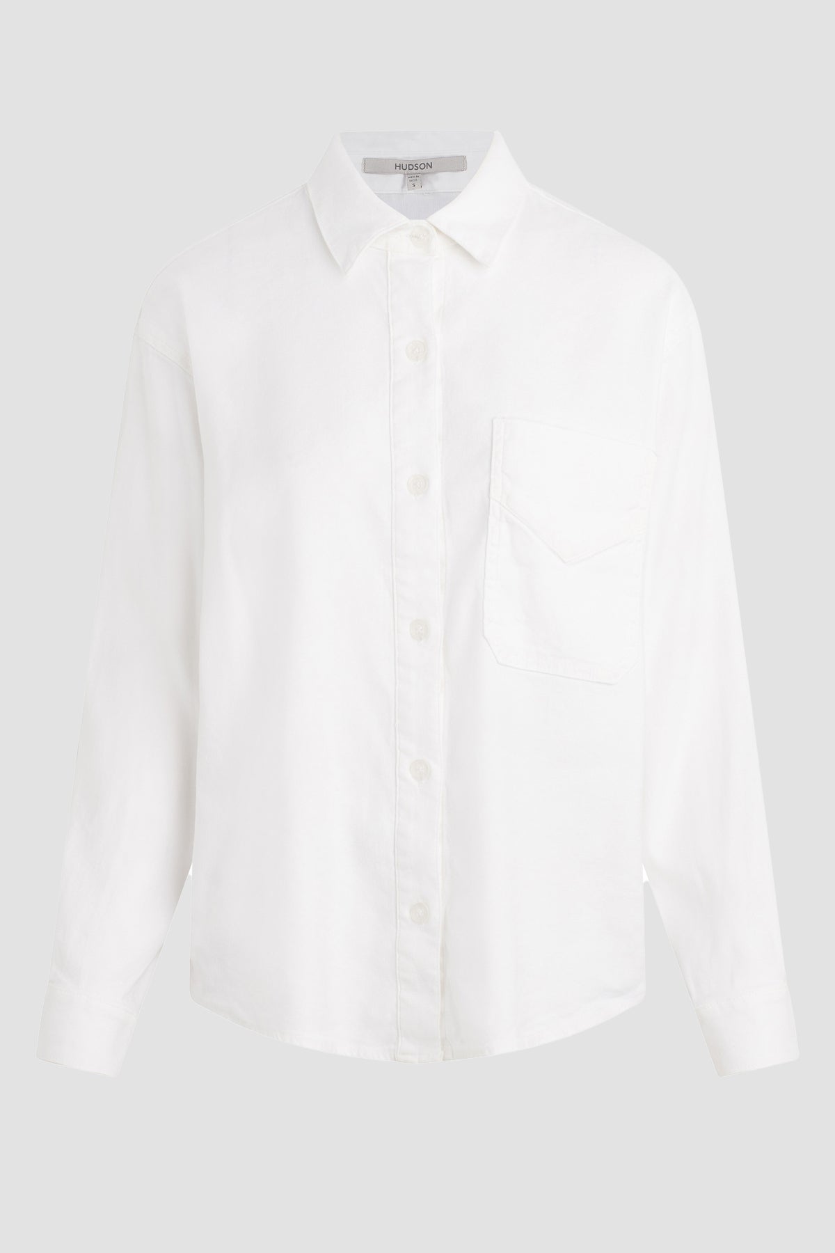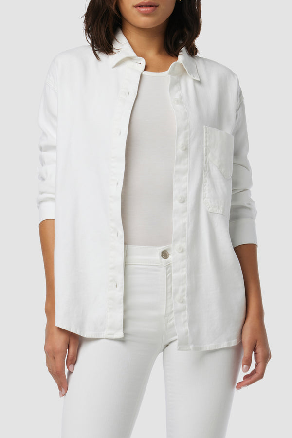 Our Oversized Button Down Shirt in White is cut from stretch linen blend with a roomy, relaxed fit. -