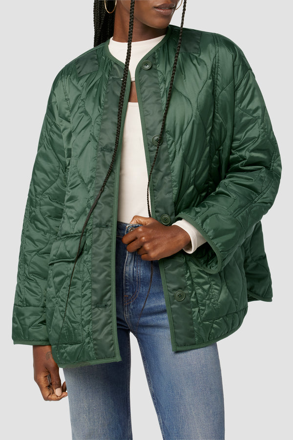 The Oversized Quilted Jacket is designed for lightweight comfort, made from 100% quilted nylon in the shade Rifle Green. Features a button front and flap pockets. -