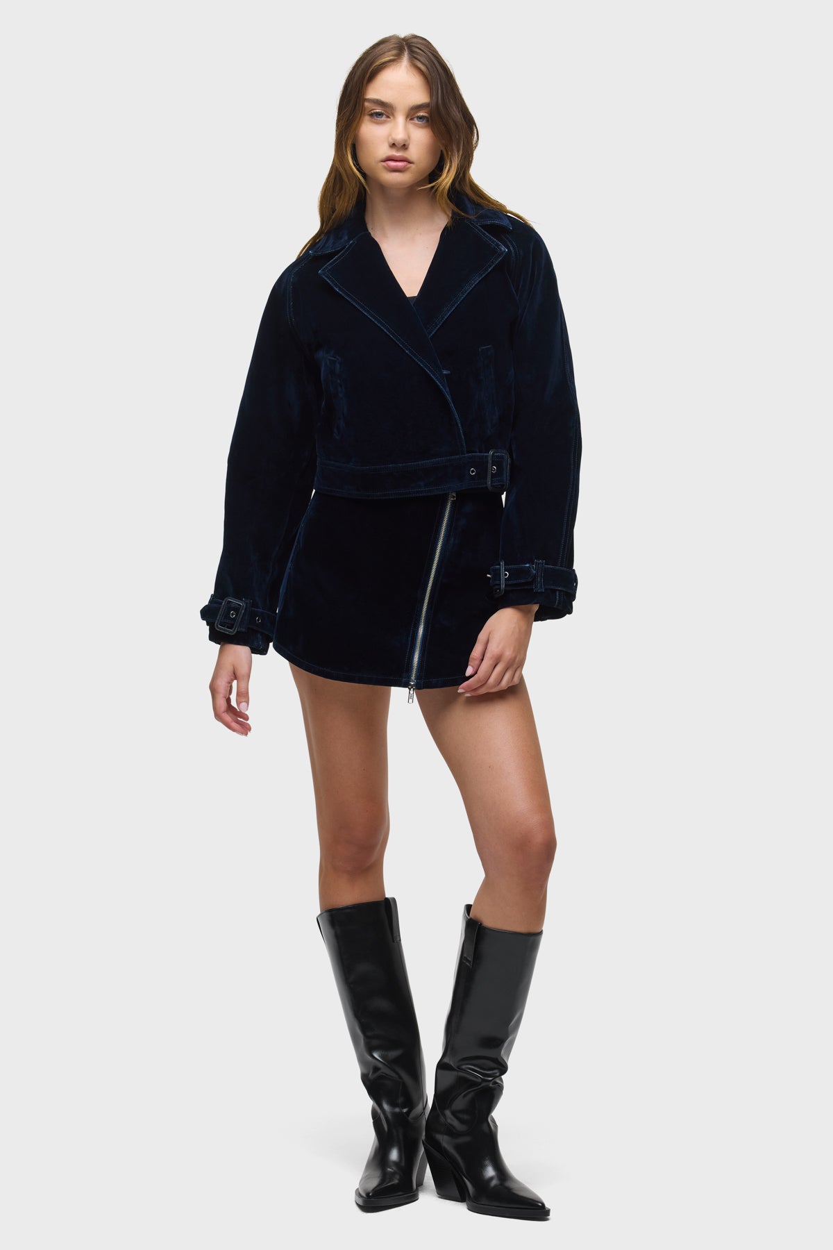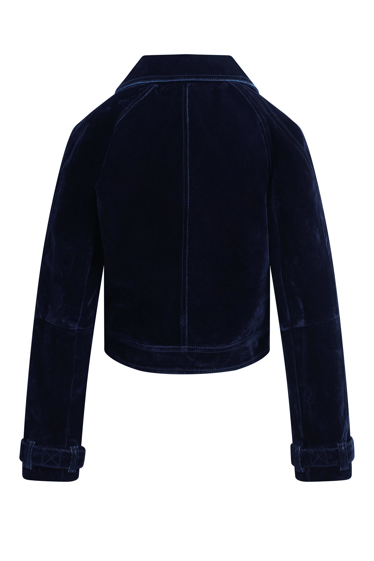 The Raglan Moto Jacket in Indigo Flocking has a slightly cropped style made of non-stretch flocked fabric on an indigo base. It features a belt at the waistband, belts at the sleeves, a collar and a lapel with an overlapping front. -