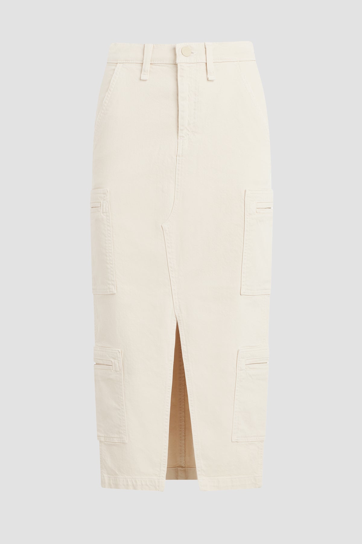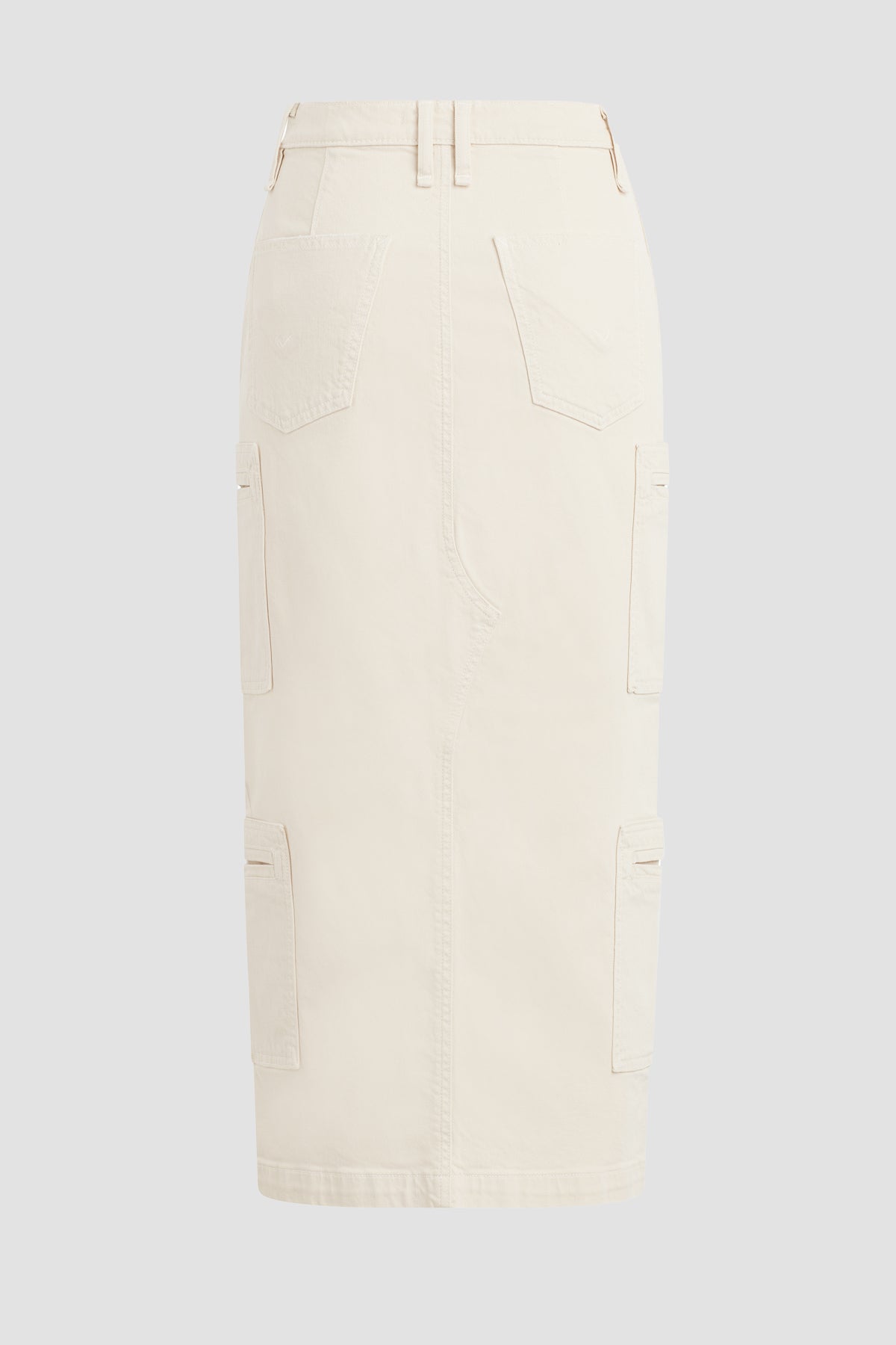 Our Reconstructed Skirt w/ Cargo Welt Pockets in Bleached Sand is cut for a flattering, hold-you-in fit in comfort stretch denim. Hitting below the knee with a midi length, it features a front slit and patch welt pockets in an over-dyed light khaki. -