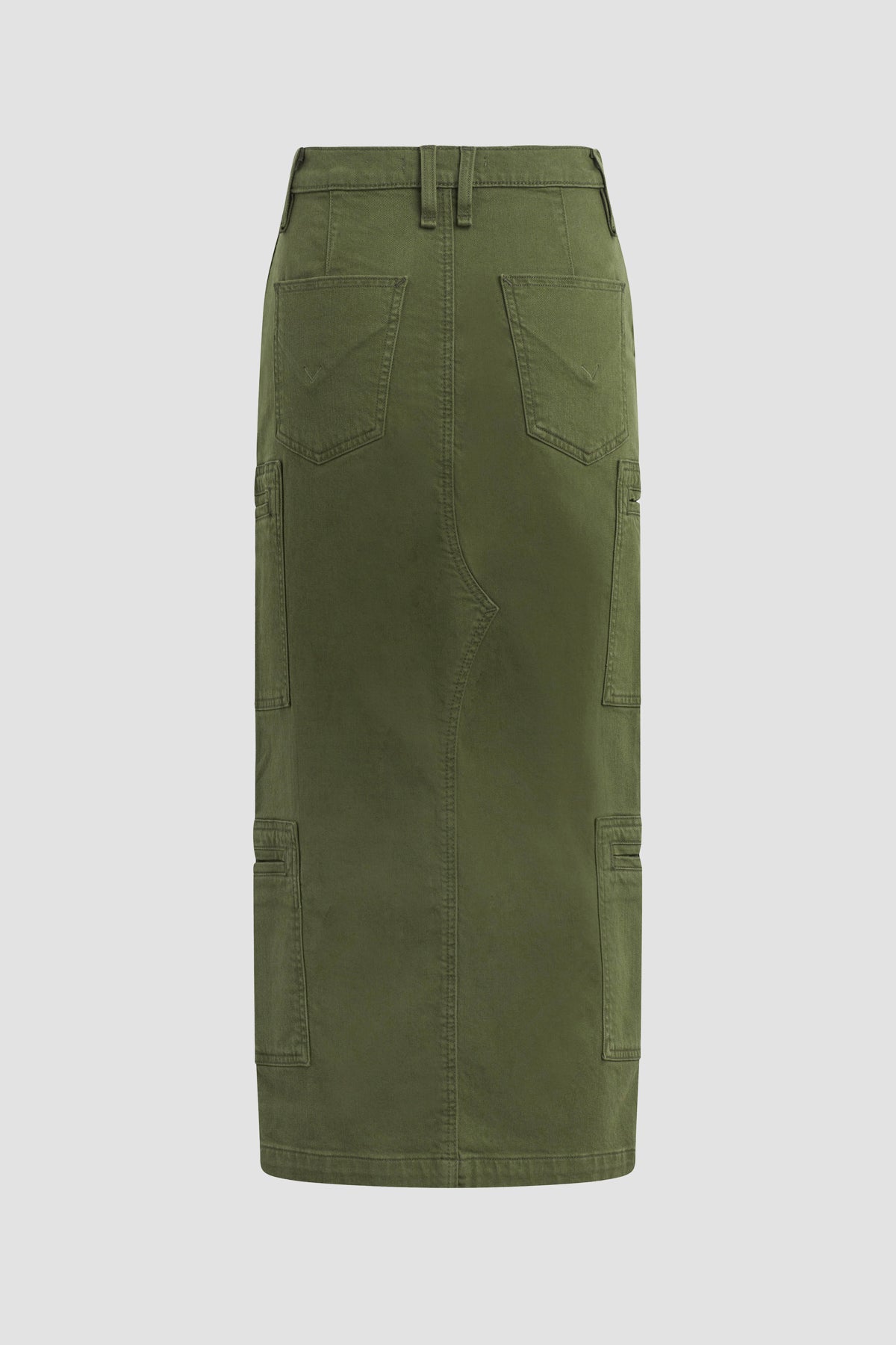 Our Reconstructed Skirt With Cargo Welt Pockets in Cypress is cut from comfort stretch denim for a flattering, hold-you-in fit. Hitting below the knee with a midi length, it features a front slit and patch welt pockets in an over-dyed medium olive wash. -