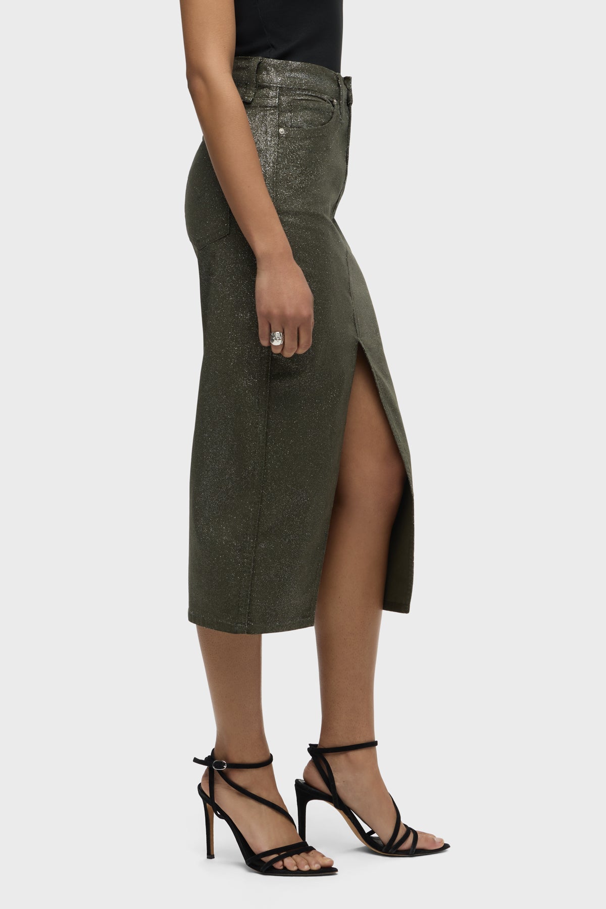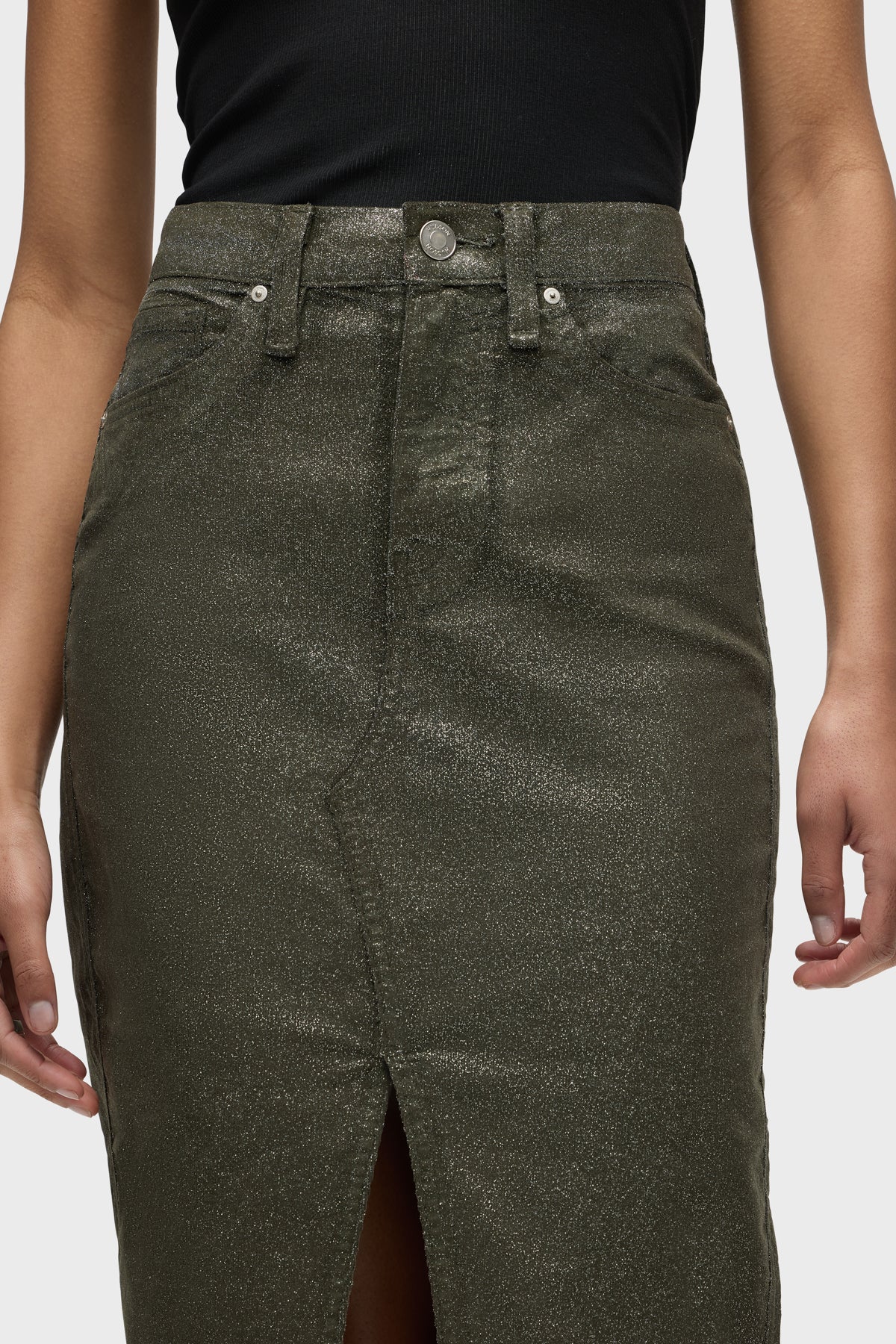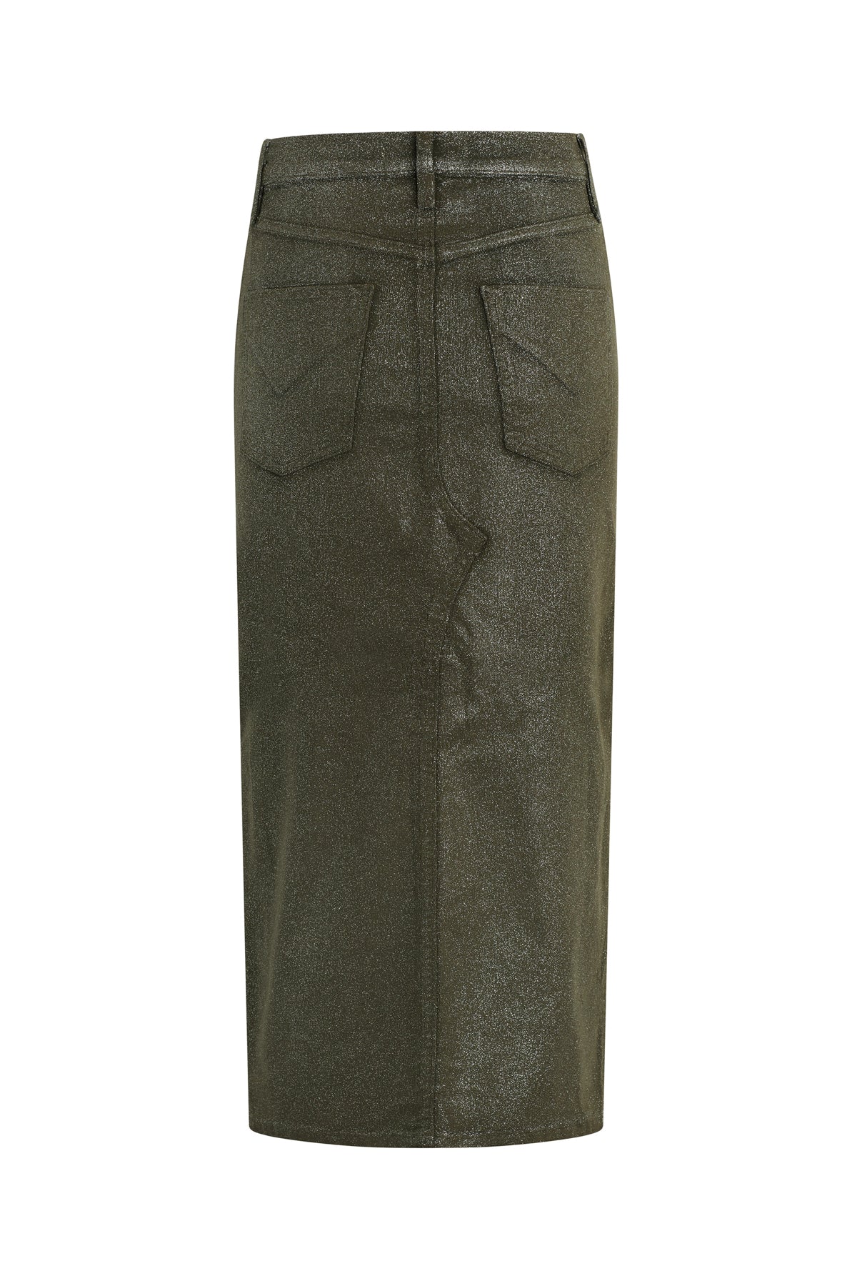 Our Reconstructed Skirt in Cypress Glitter is cut from soft and buttery corduroy with premium comfort stretch. It hits below the knee with a midi length and features a front slit and a soft clear coating with all-over glitter. -
