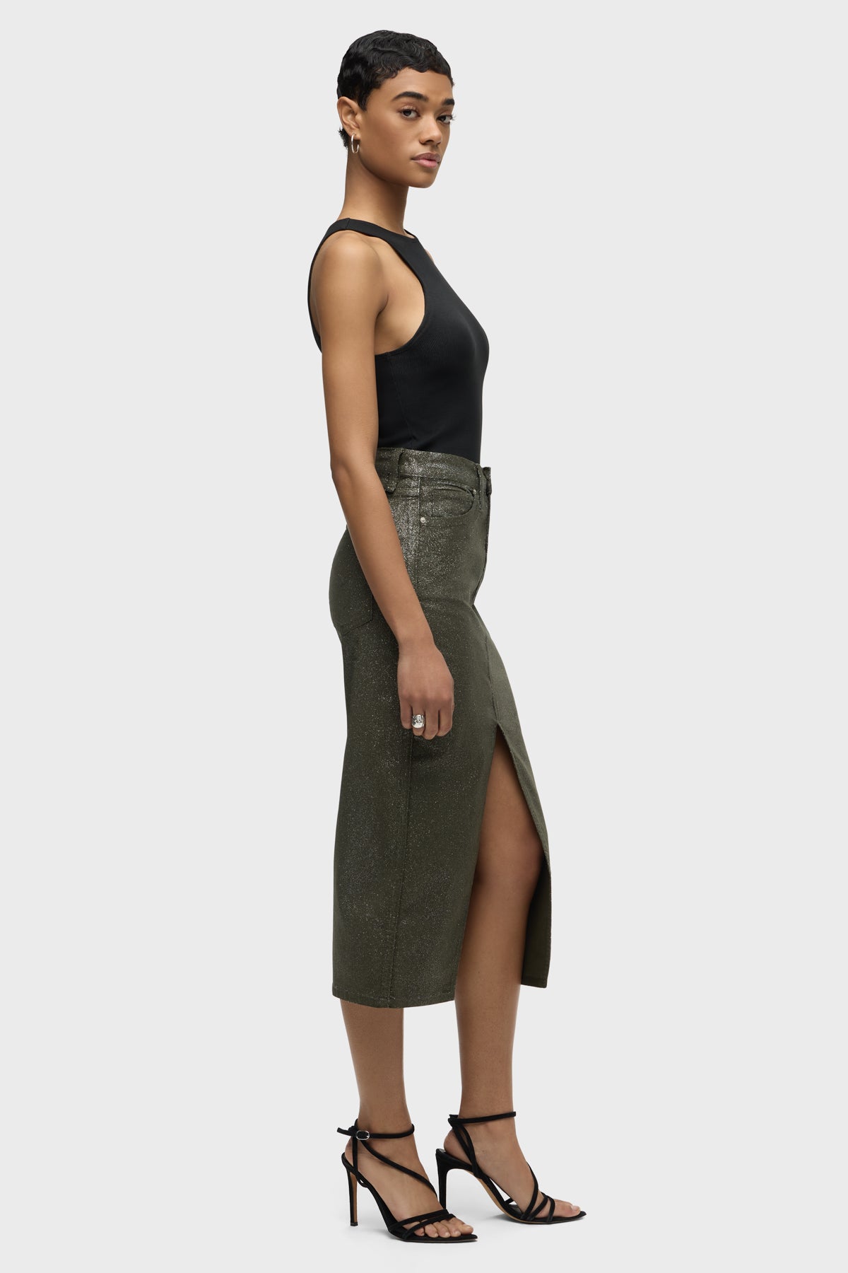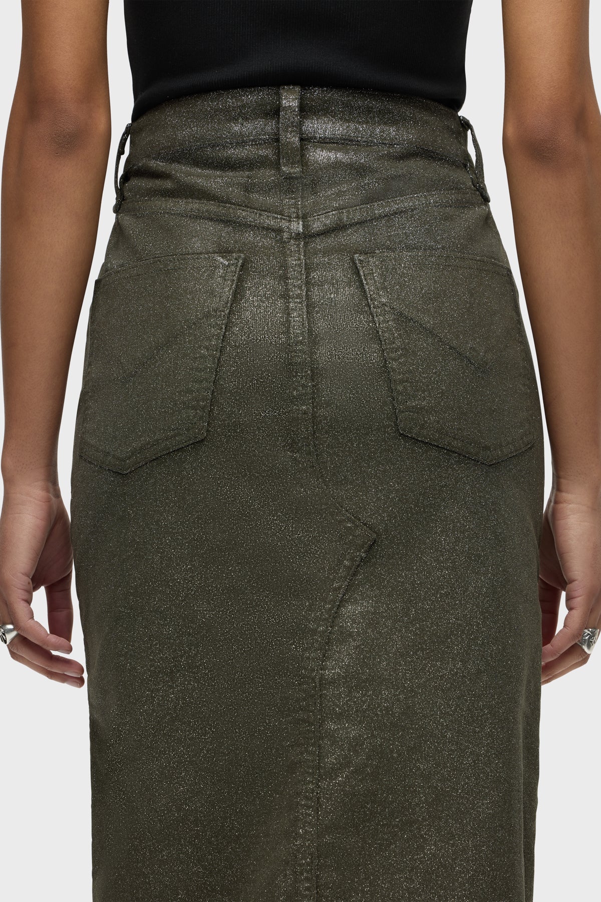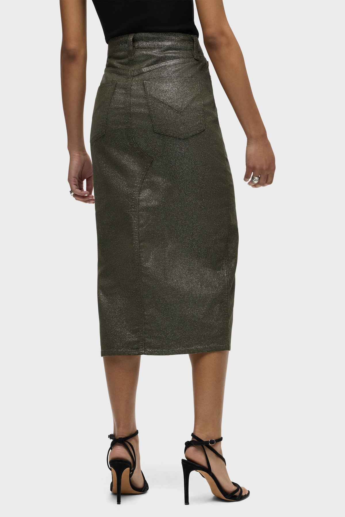 Our Reconstructed Skirt in Cypress Glitter is cut from soft and buttery corduroy with premium comfort stretch. It hits below the knee with a midi length and features a front slit and a soft clear coating with all-over glitter. -