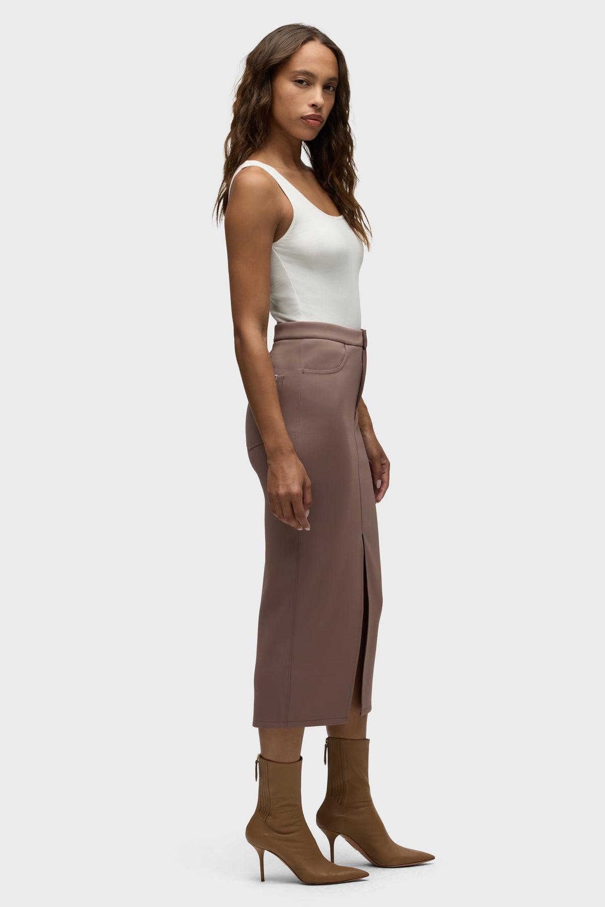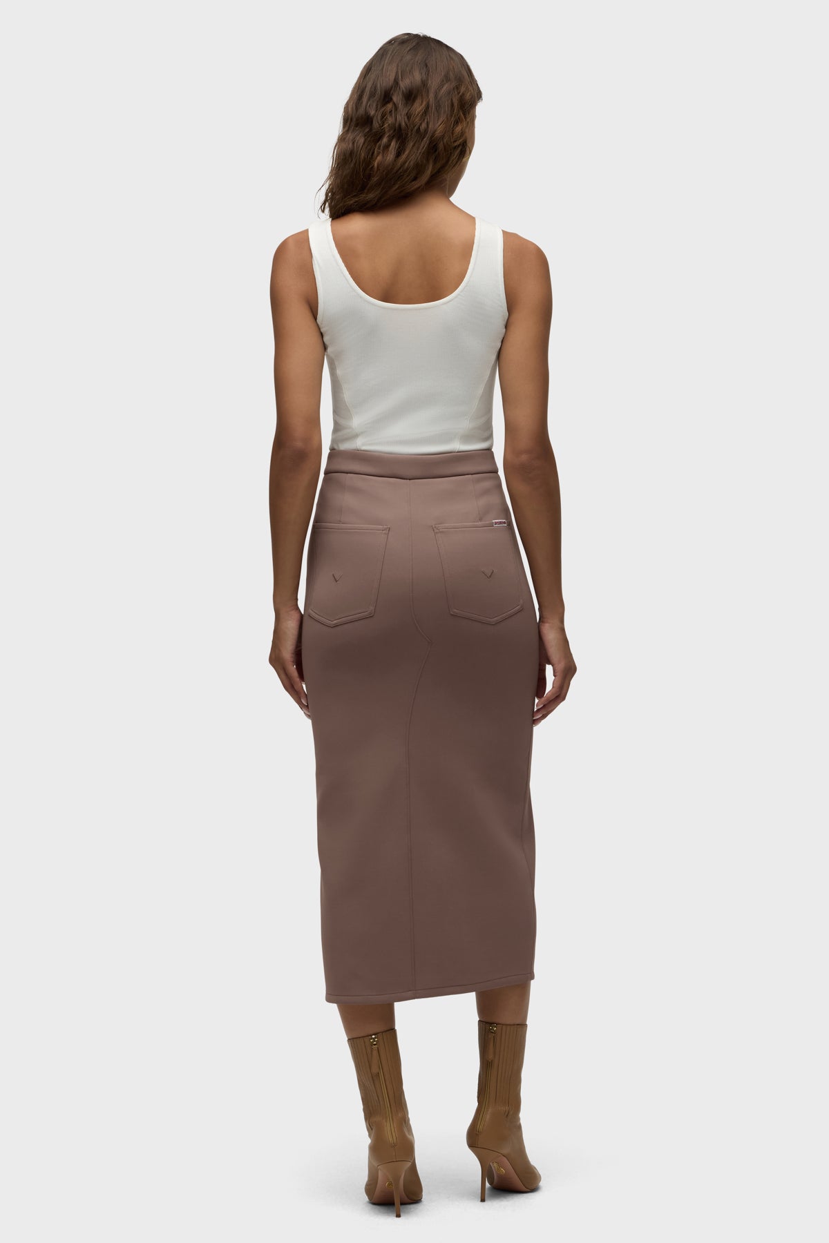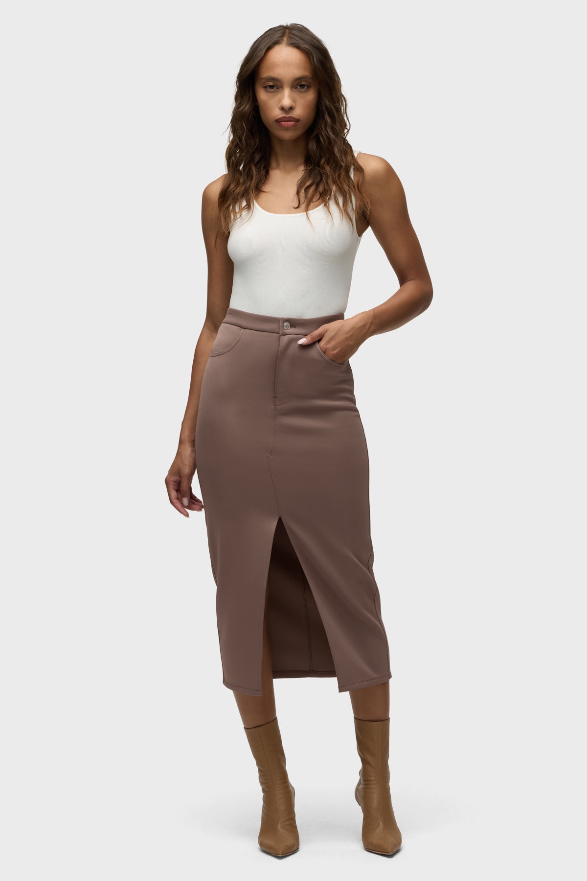 Our Reconstructed Skirt in Deep Taupe is cut from our new sculpting rib-scuba knit, a soft and flexible feel with every move and a hold-you-in fit. Hitting below the knee with a midi length, it features a front slit and pockets. -
