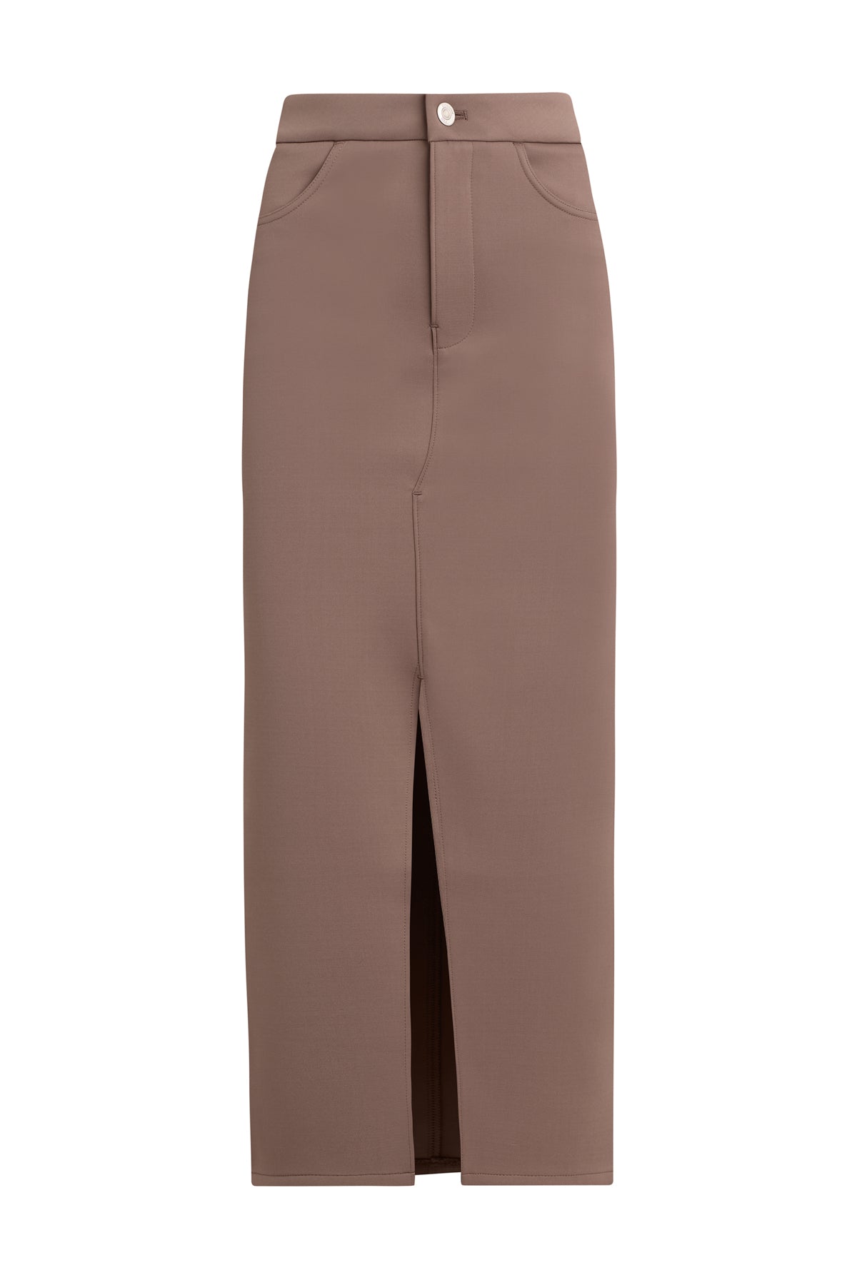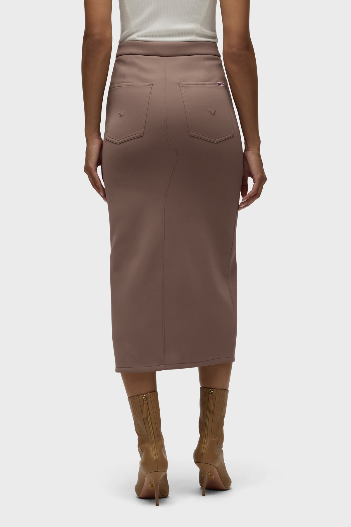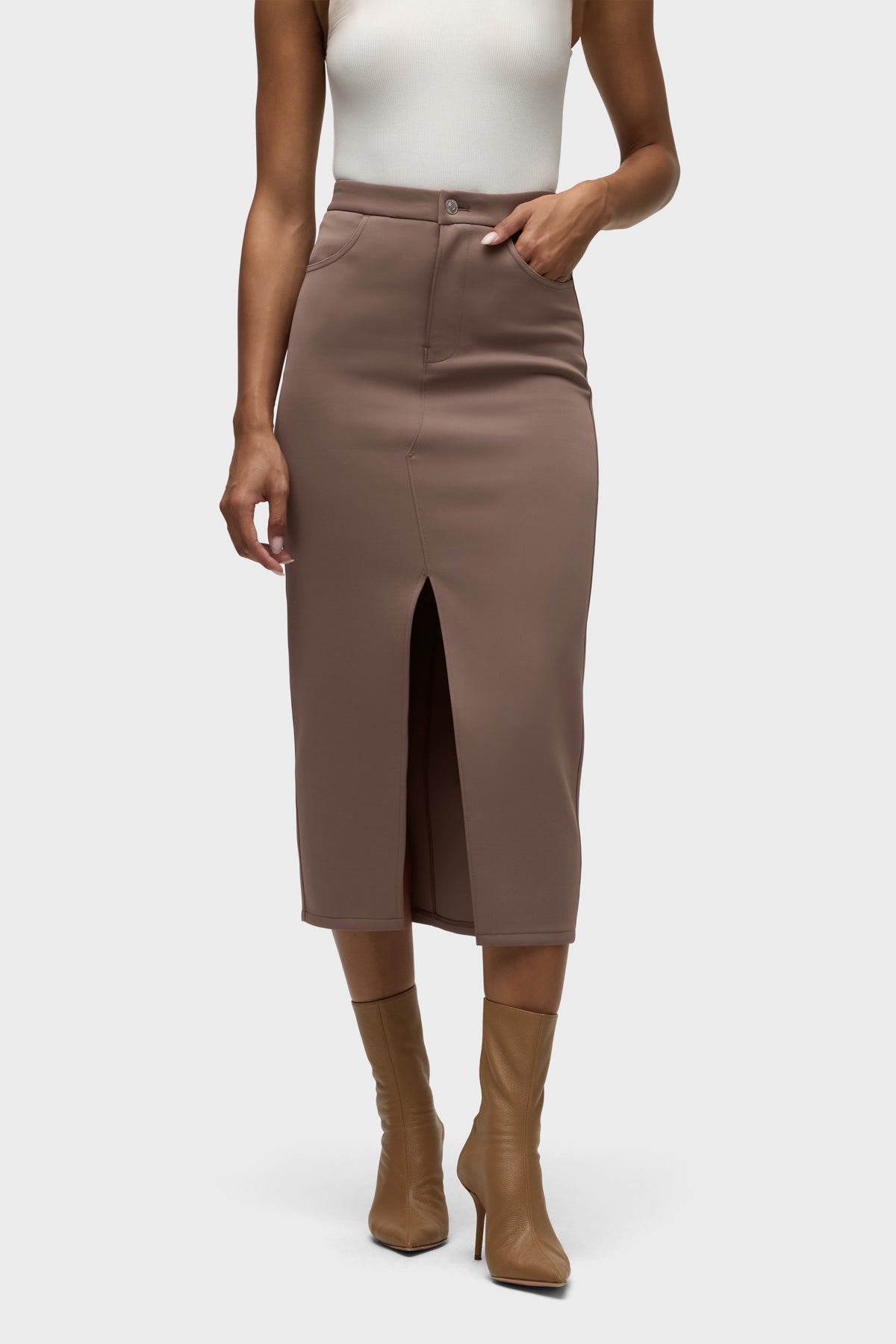 Our Reconstructed Skirt in Deep Taupe is cut from our new sculpting rib-scuba knit, a soft and flexible feel with every move and a hold-you-in fit. Hitting below the knee with a midi length, it features a front slit and pockets. -