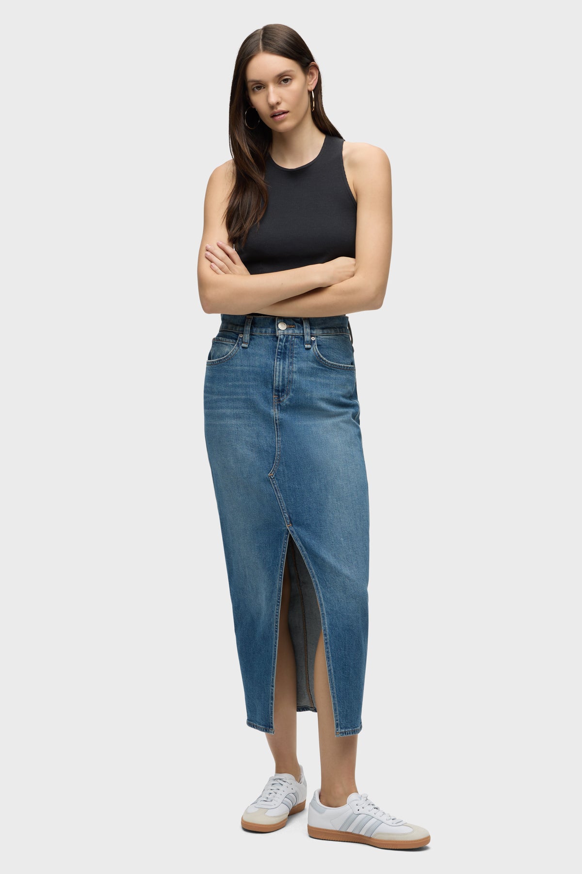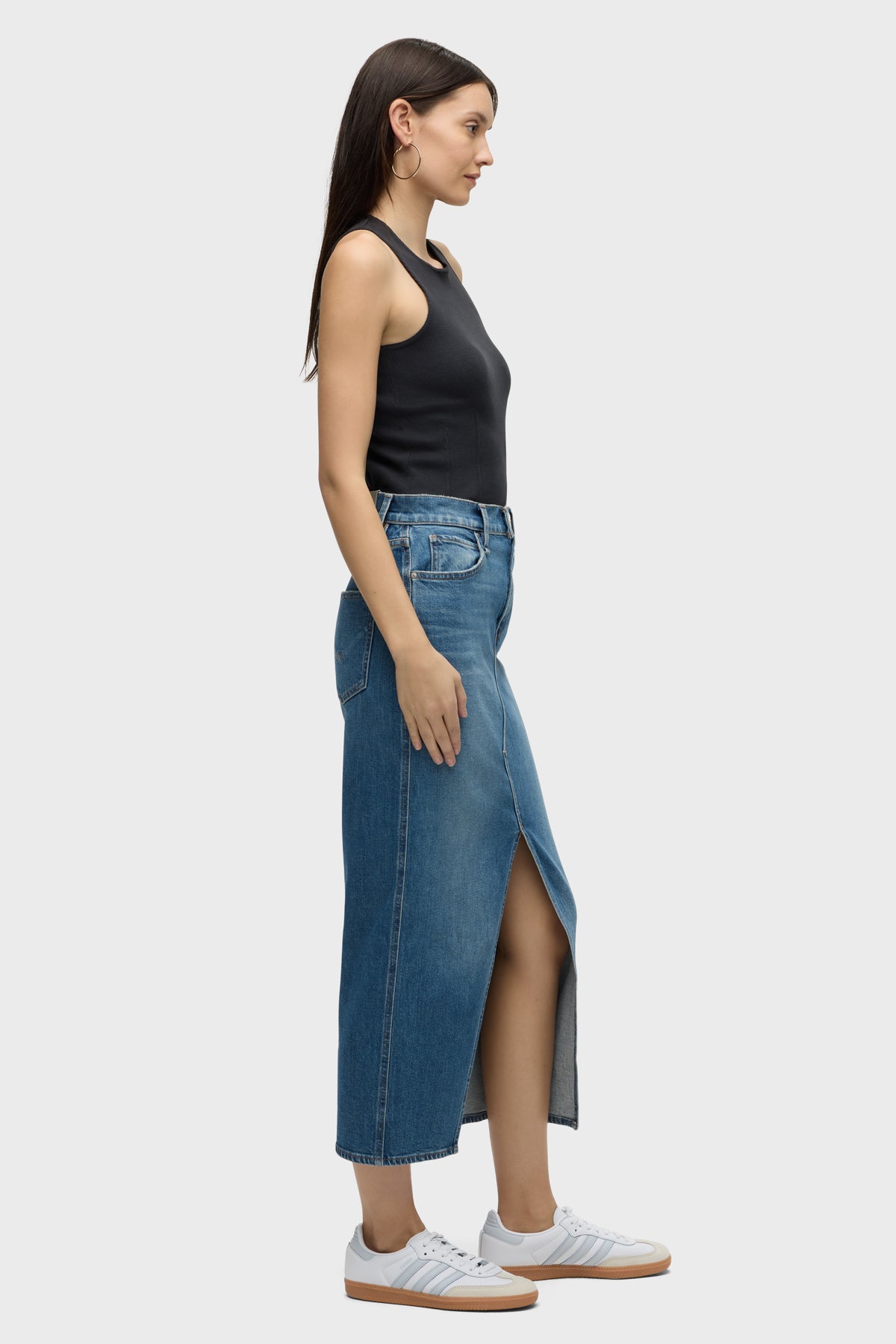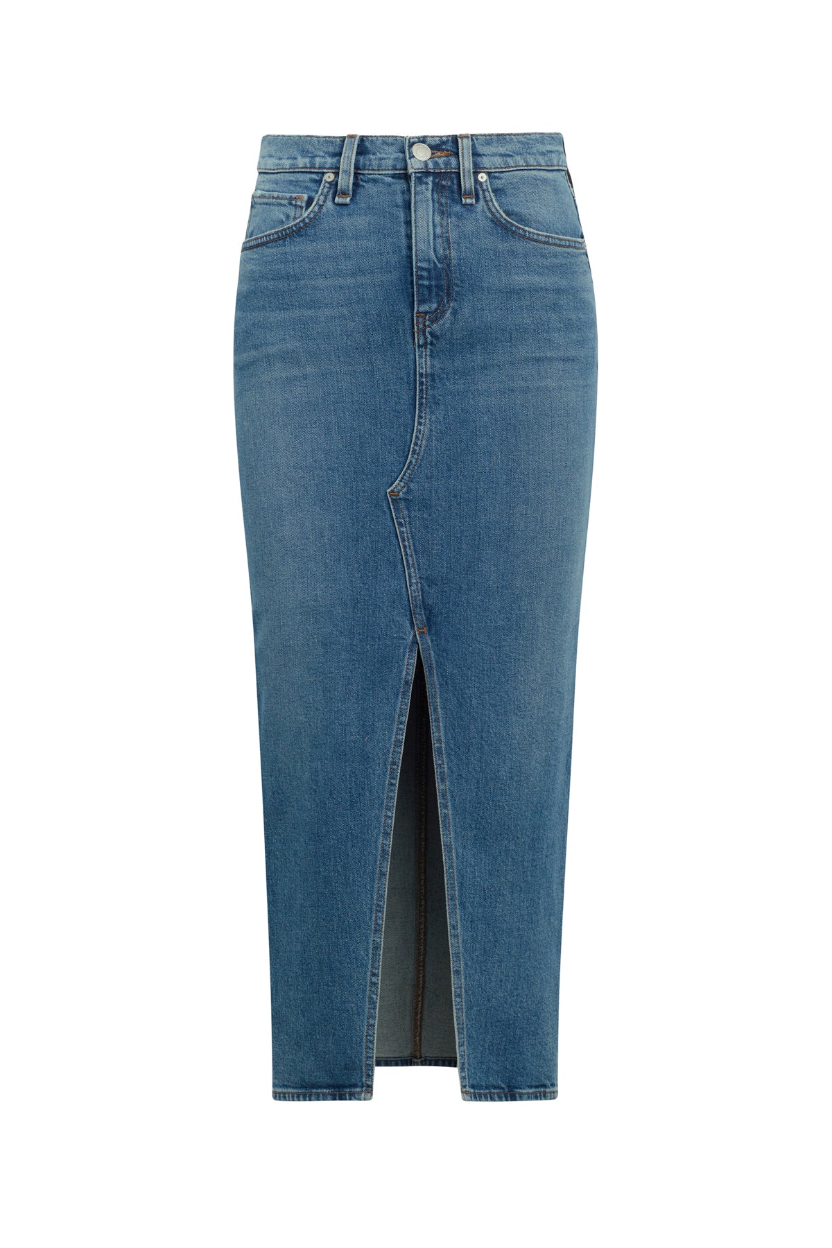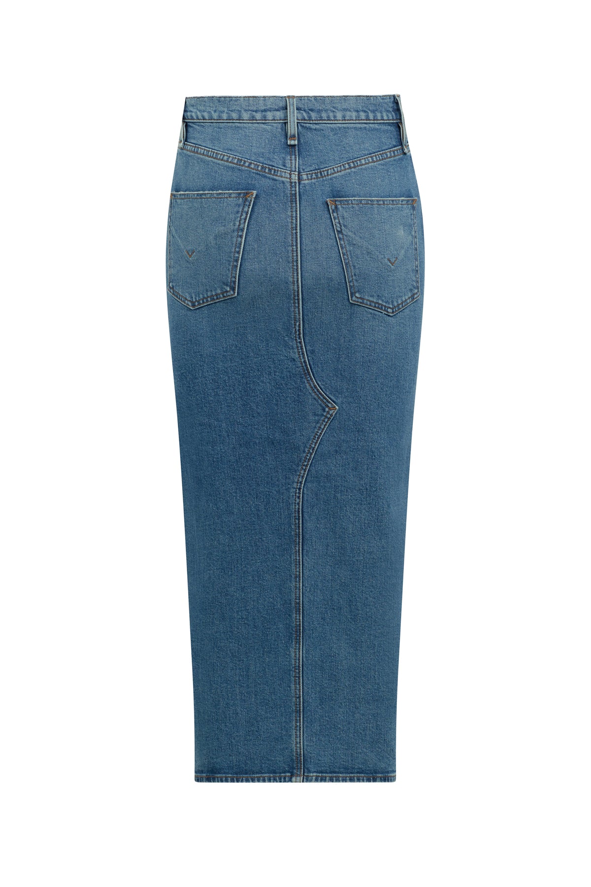 Our High-Rise Reconstructed Skirt in medium blue Lucent is cut from Legacy, Italian premium comfort stretch denim for a flattering, hold-you-in fit. Hitting below the knee, it features a front slit and grinding along the edges. -