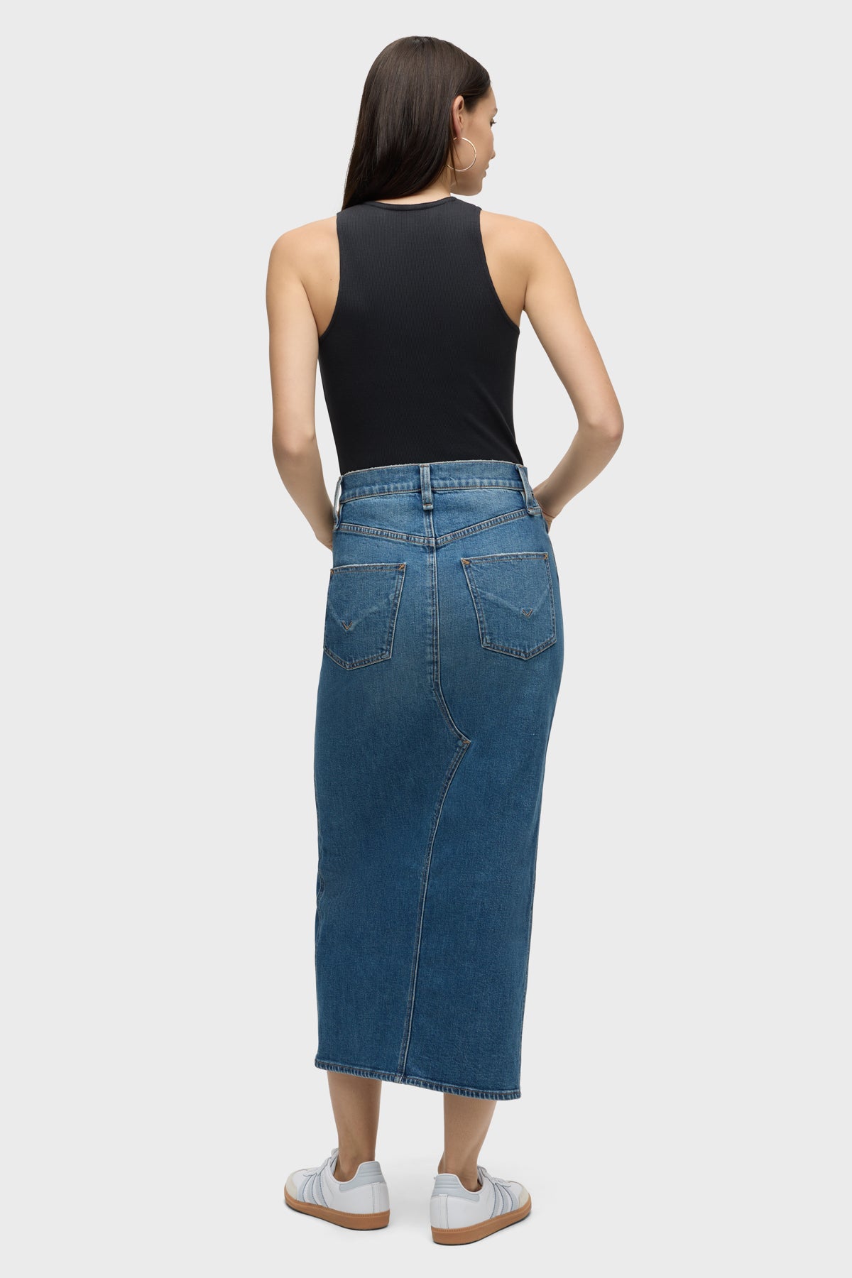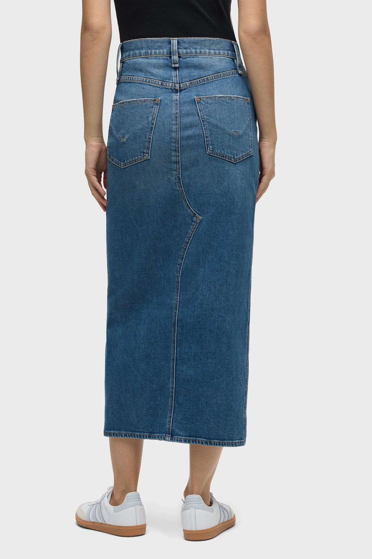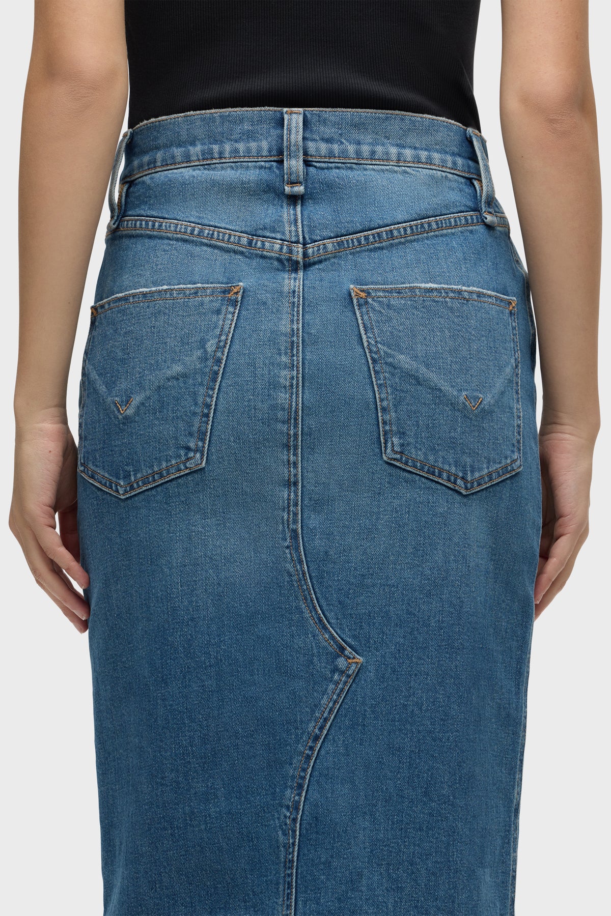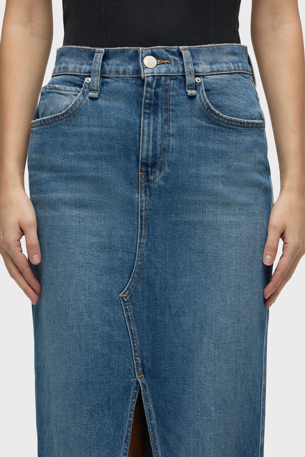 Our High-Rise Reconstructed Skirt in medium blue Lucent is cut from Legacy, Italian premium comfort stretch denim for a flattering, hold-you-in fit. Hitting below the knee, it features a front slit and grinding along the edges. -