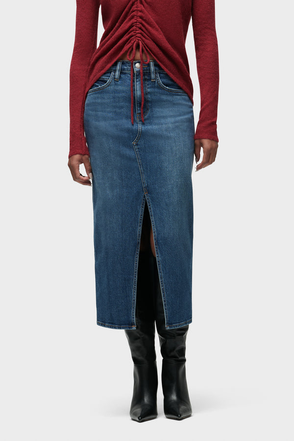 Our Reconstructed Skirt in medium-dark Zion hits below the knee with a midi length. With the front slit and versatile styling, it's a year-round must. -
