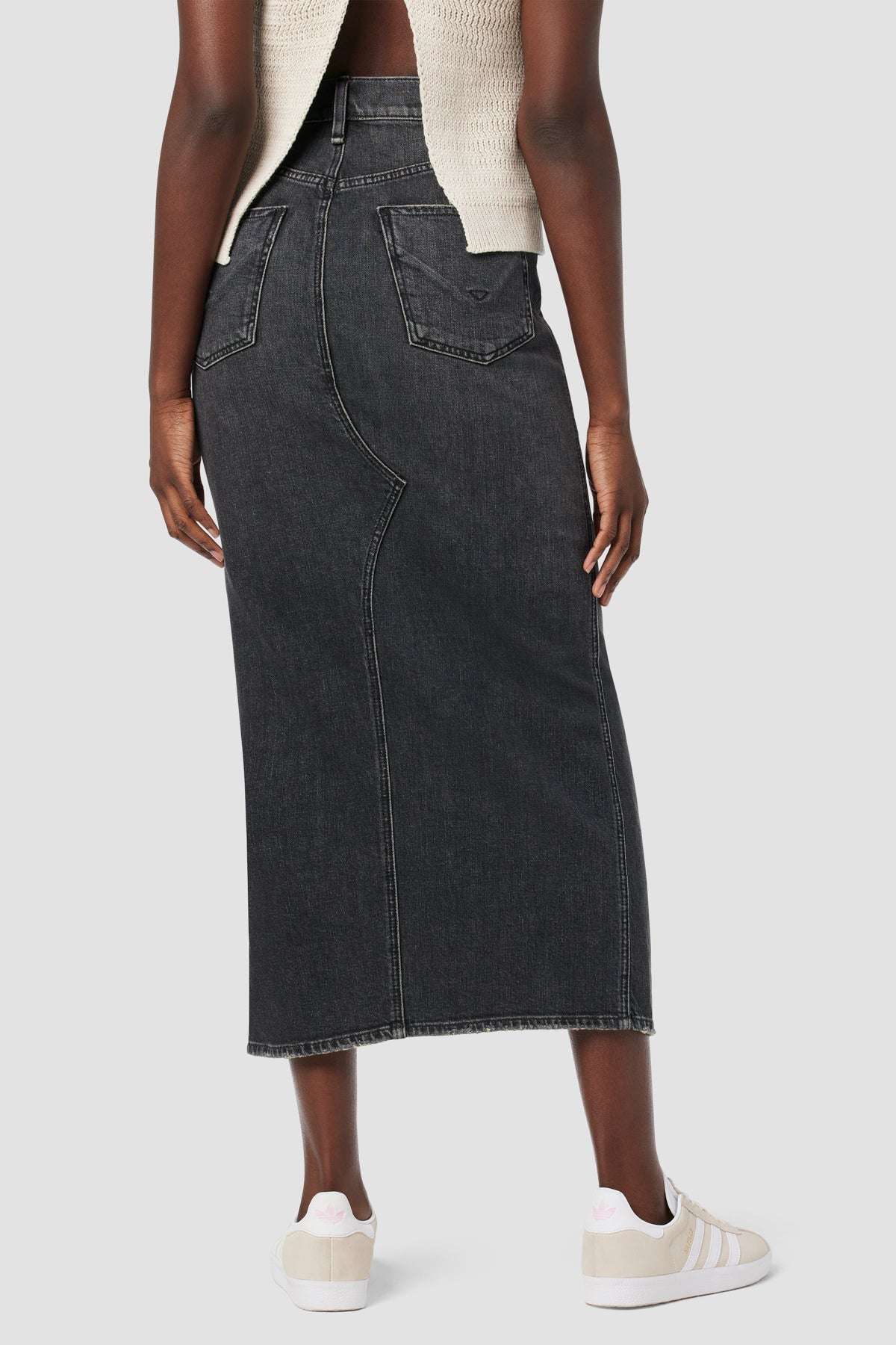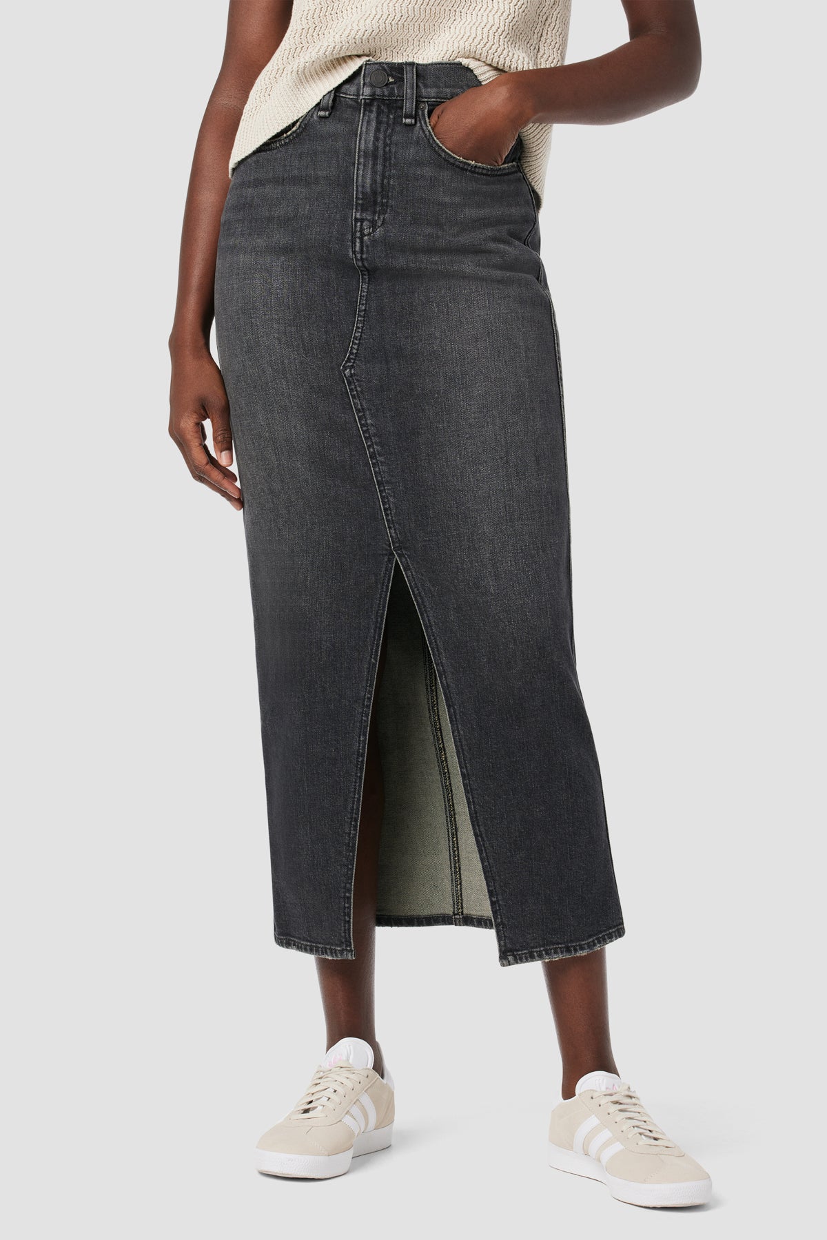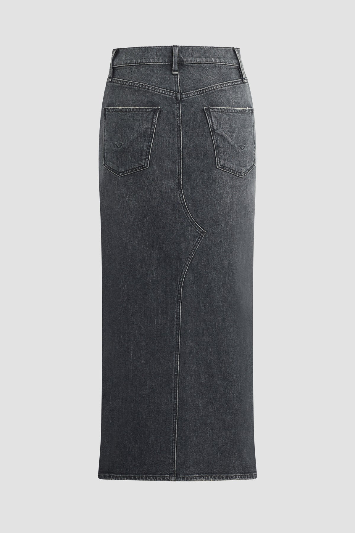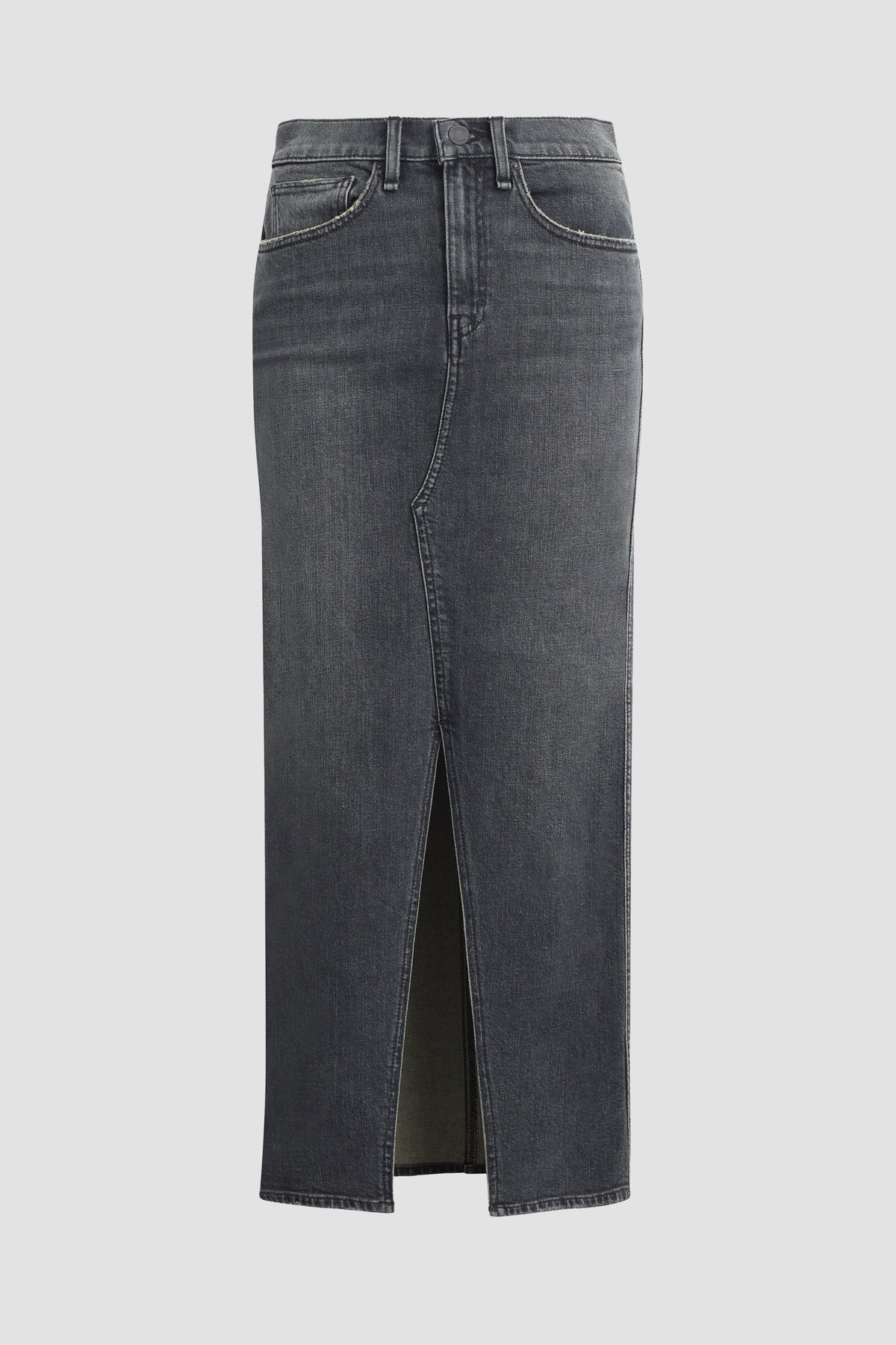 Our Reconstructed Skirt in washed down Black Pearl is cut from Italian premium denim with just enough stretch for a flattering, hold-you-in fit. Hitting below the knee with a midi length, it features a front slit and grinding along the edges. -