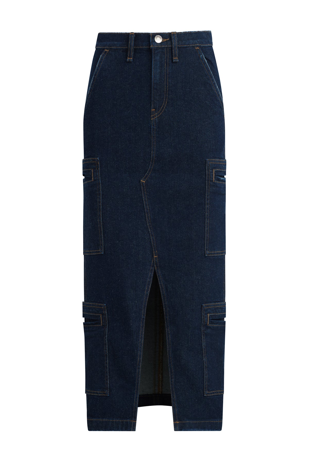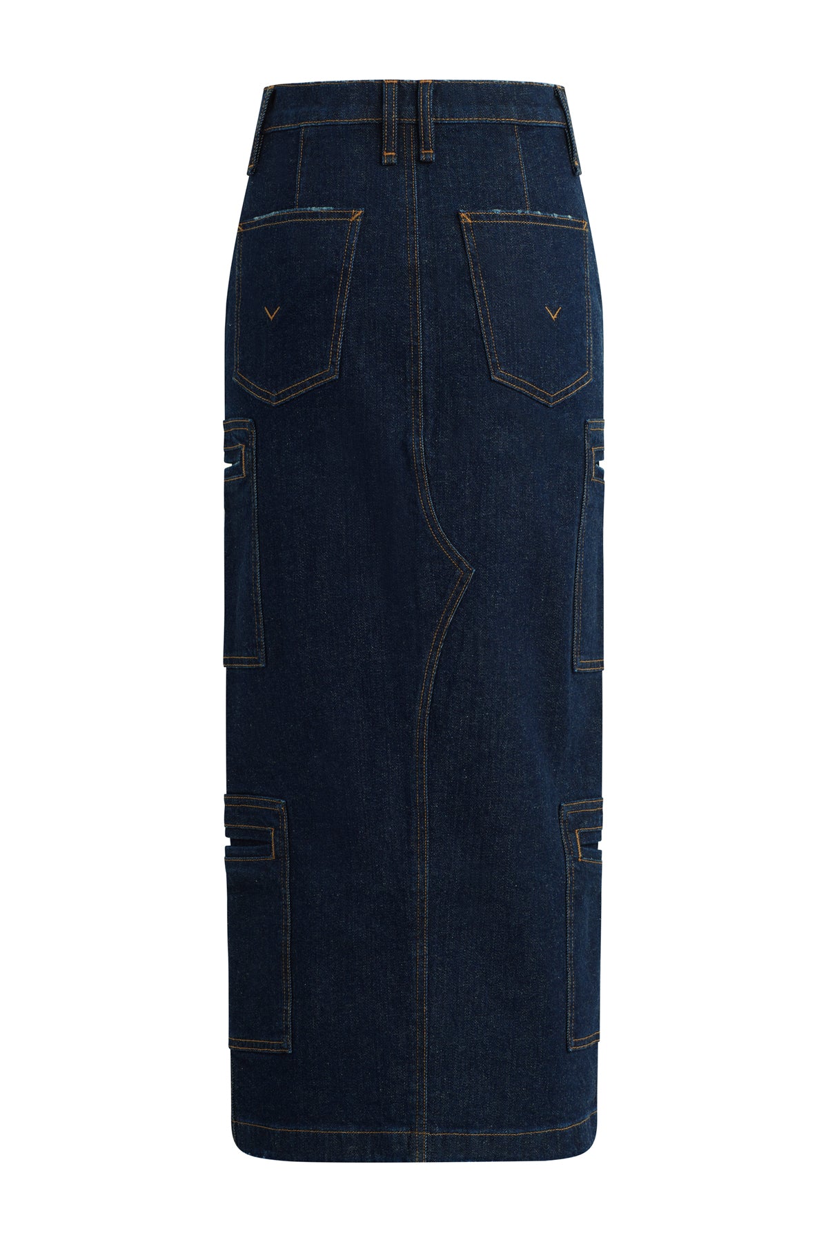 Our Reconstructed Skirt w/ Cargo Welt Pockets in Denim Rinse is cut from Italian comfort stretch denim for a flattering, hold-you-in fit. Hitting below the knee with a midi length, it features a front slit, grinding along the edges and patch welt pockets in an dark indigo. -
