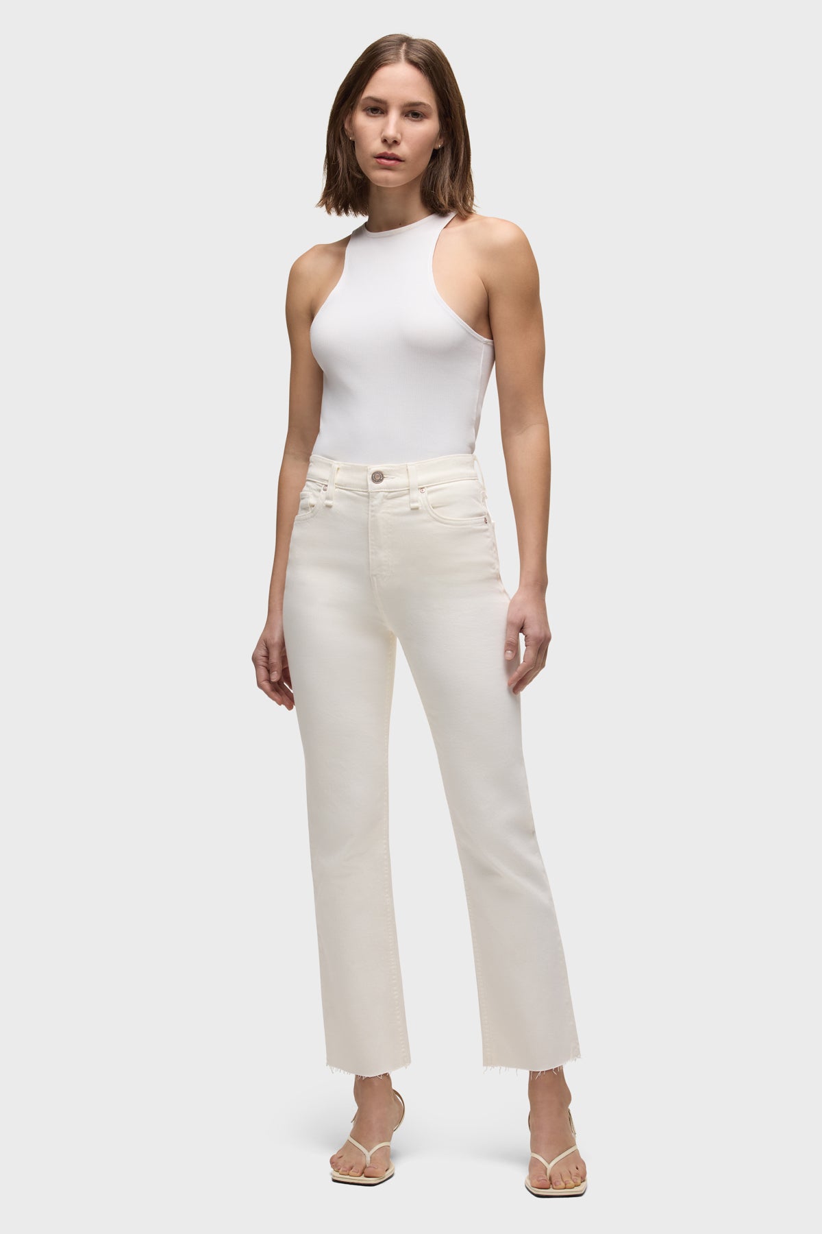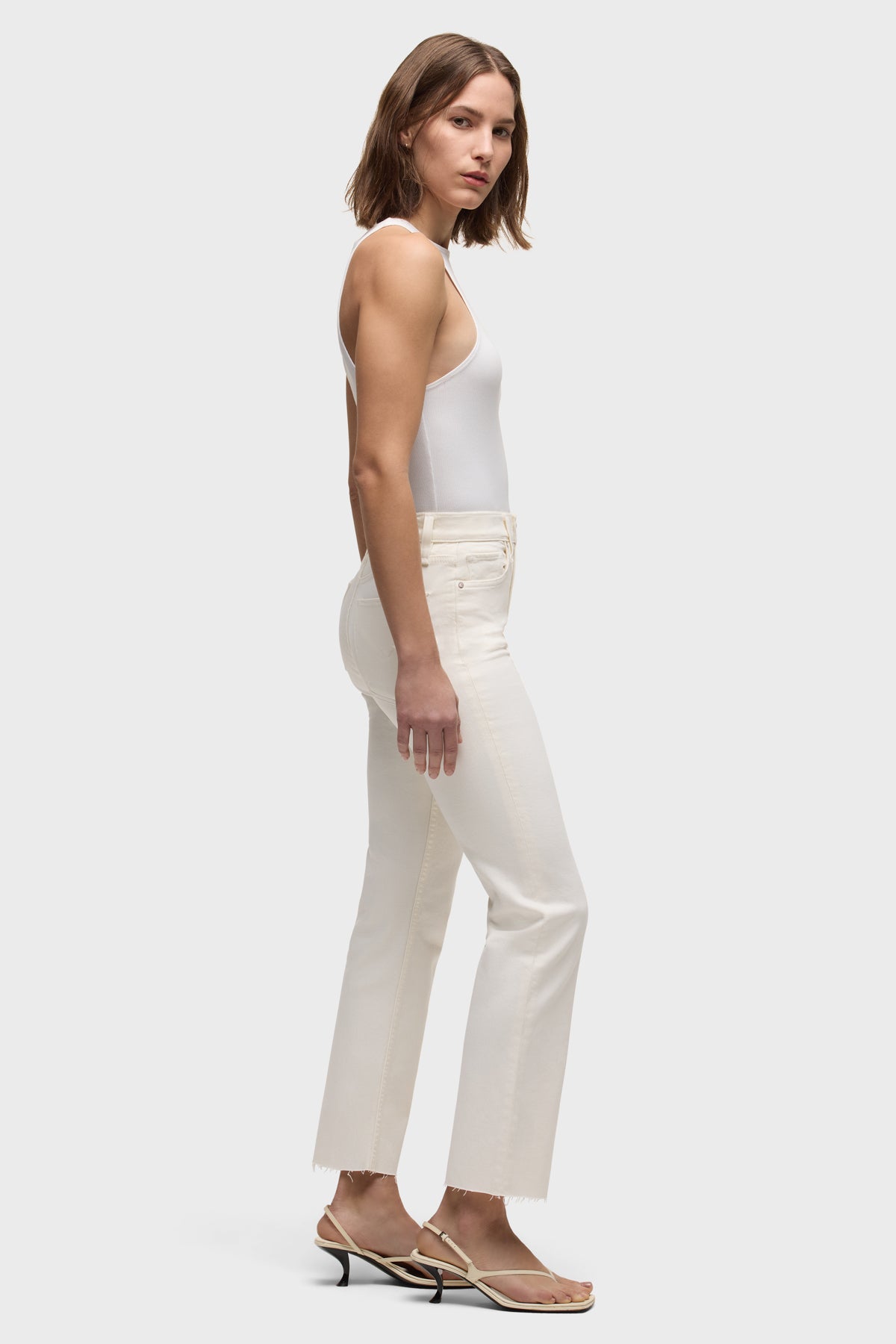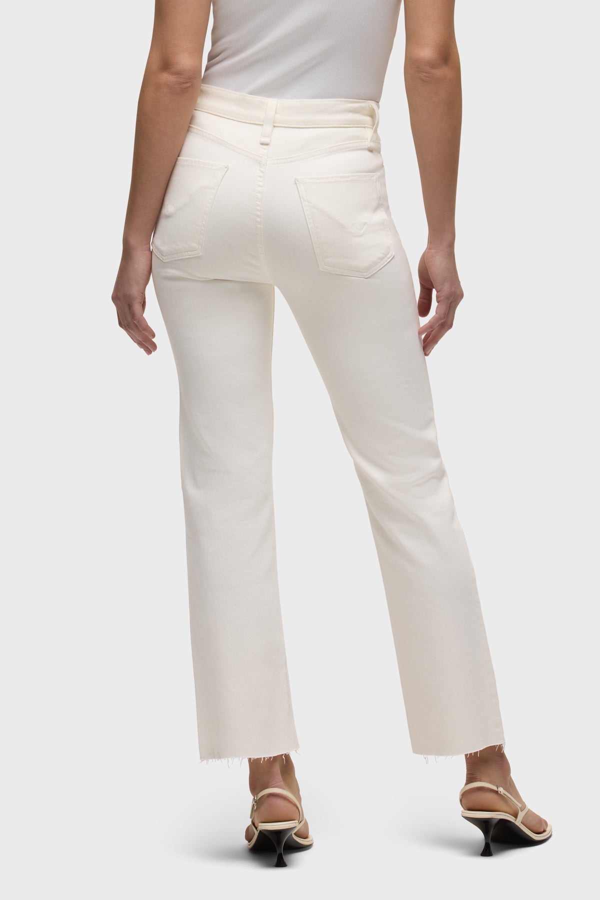 Our Remi High-Rise Straight Ankle Jean in Ecru is cut with a flattering high rise and relaxed leg. Made of true comfort stretch denim in an overdyed ecru shade, this pair is finished with an ankle-length 28" inseam and raw hem. -