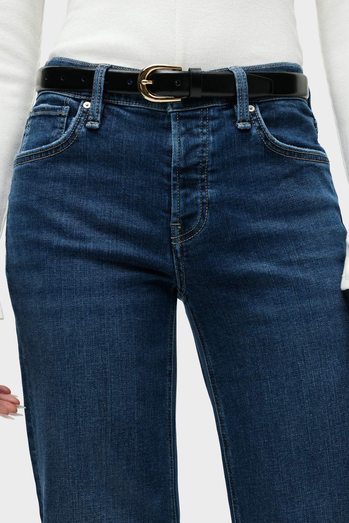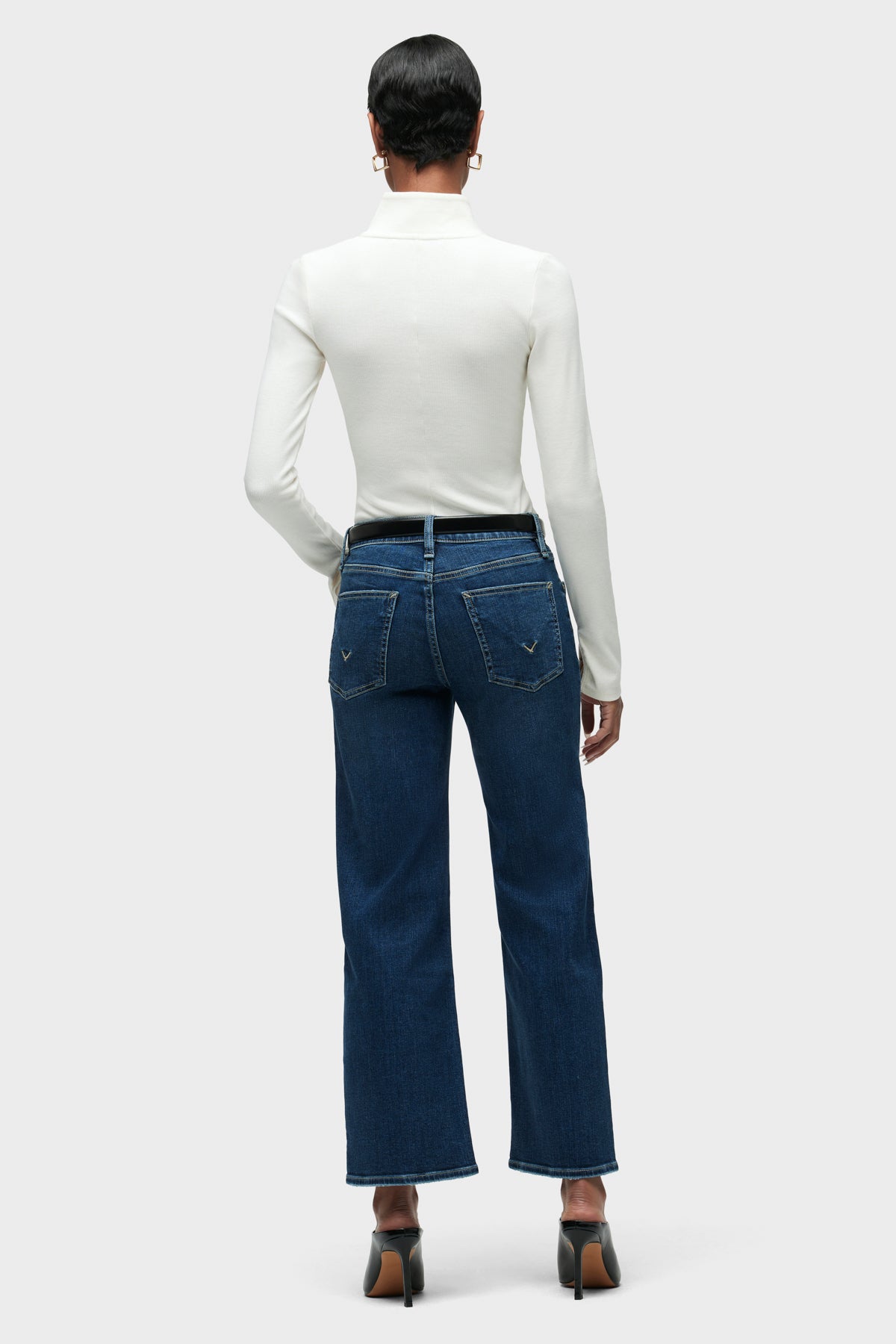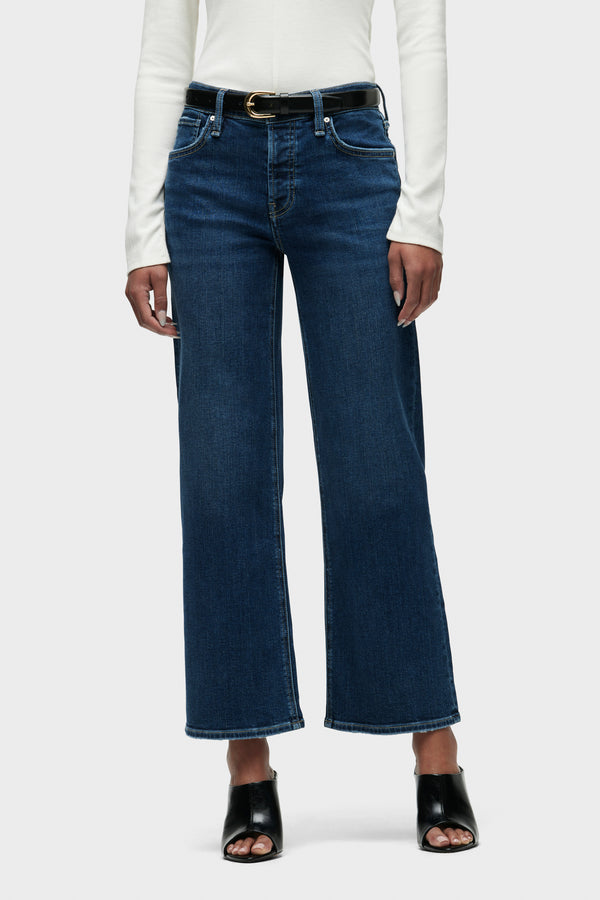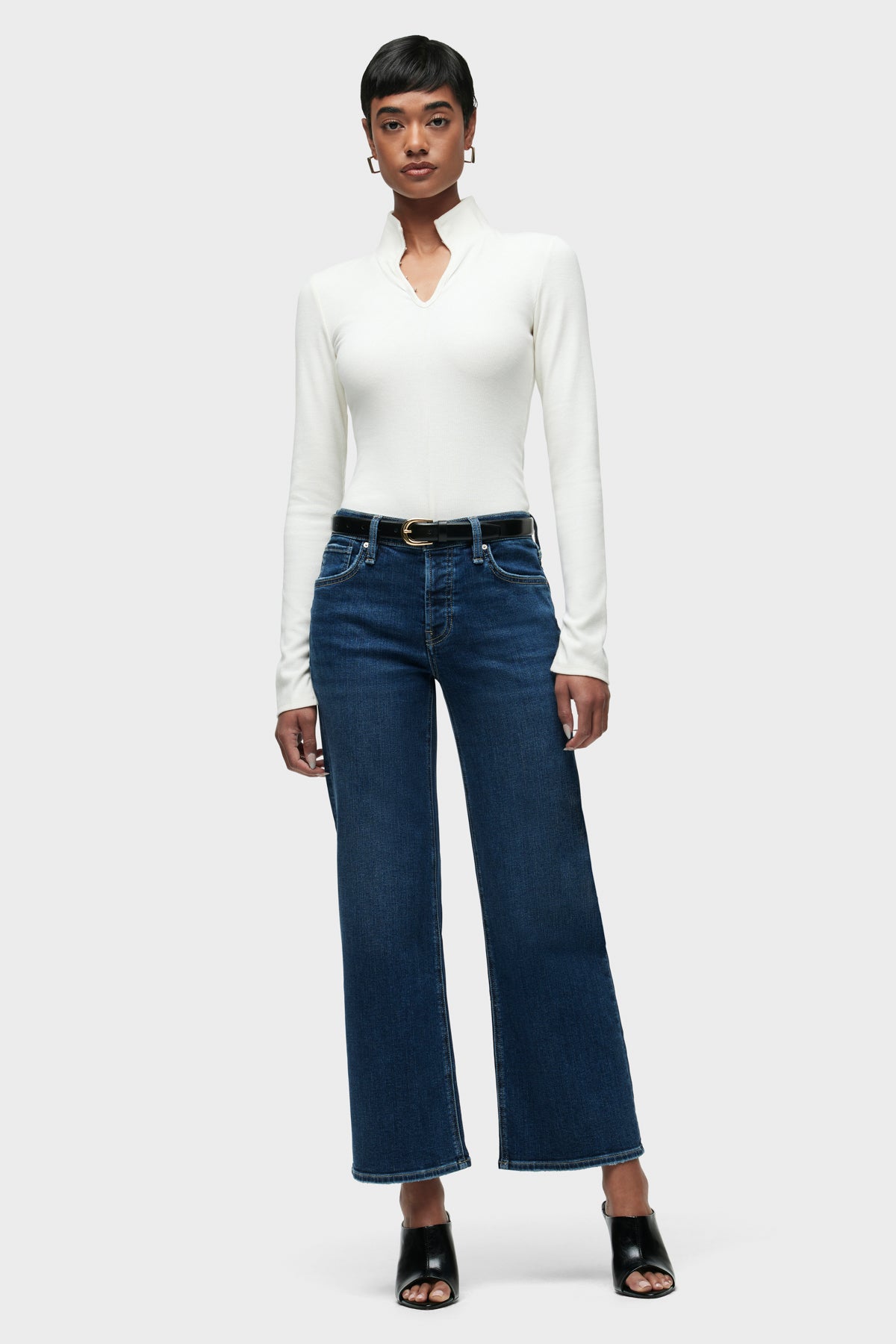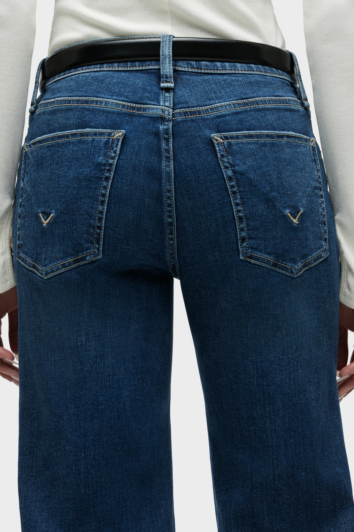 Re-up with our Rosie High-Rise Wide Leg Ankle Jean, cut with an elevated waistline and ankle-length, roomy leg. Crafted from premium comfort stretch denim that's been expertly washed to a medium indigo with edge grinding, covered button fly and classic five-pocket details. -