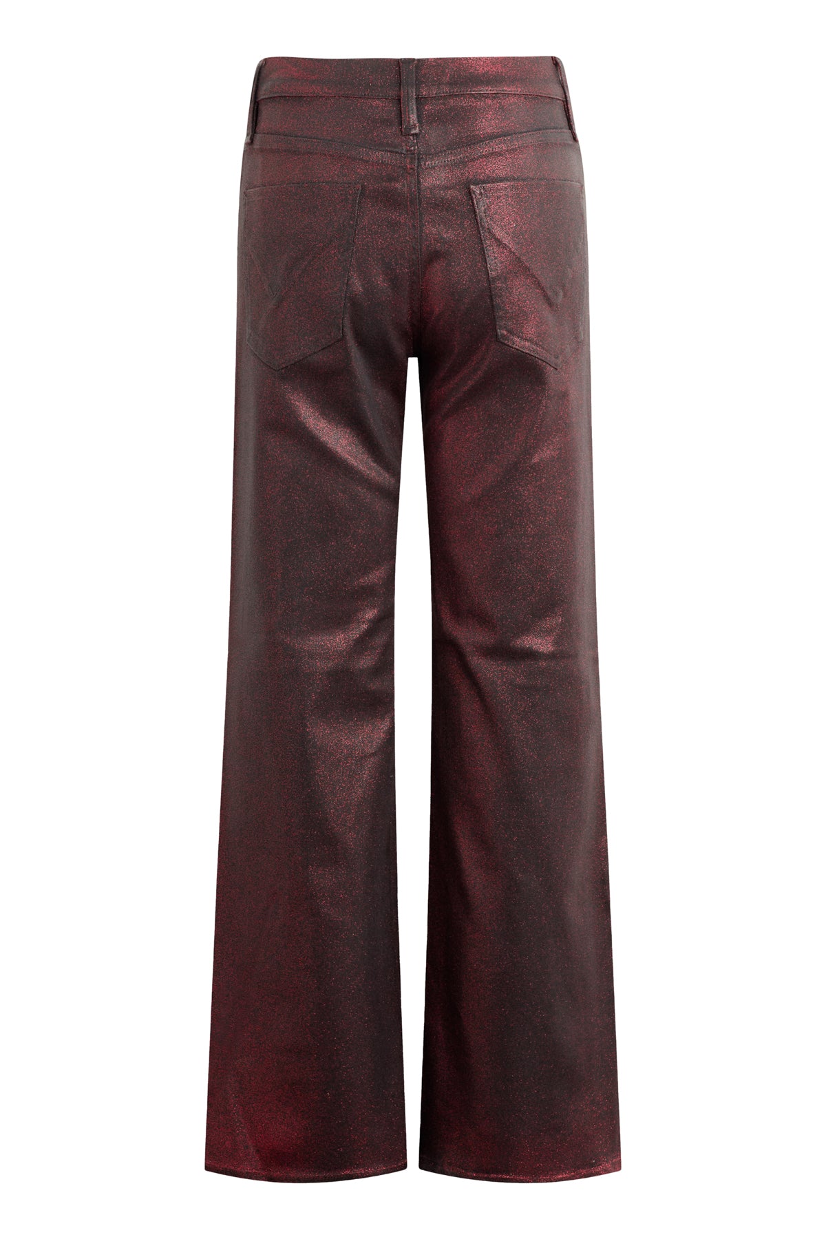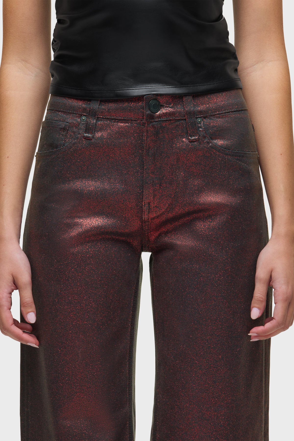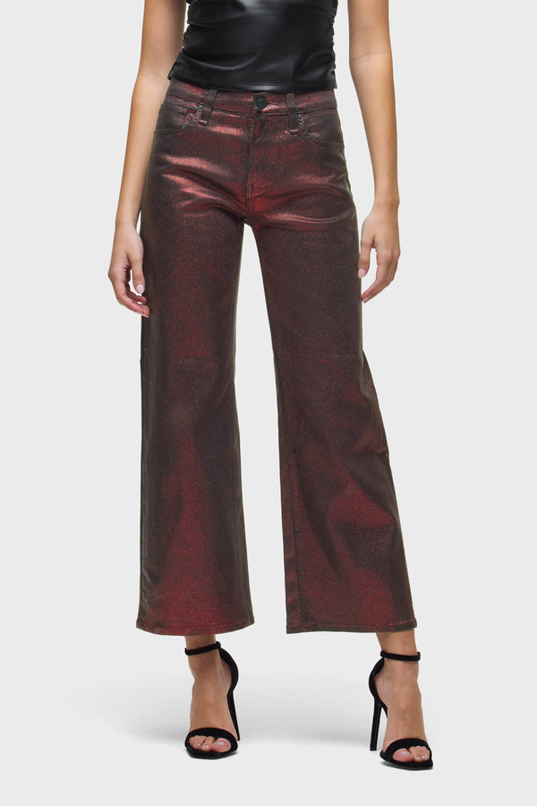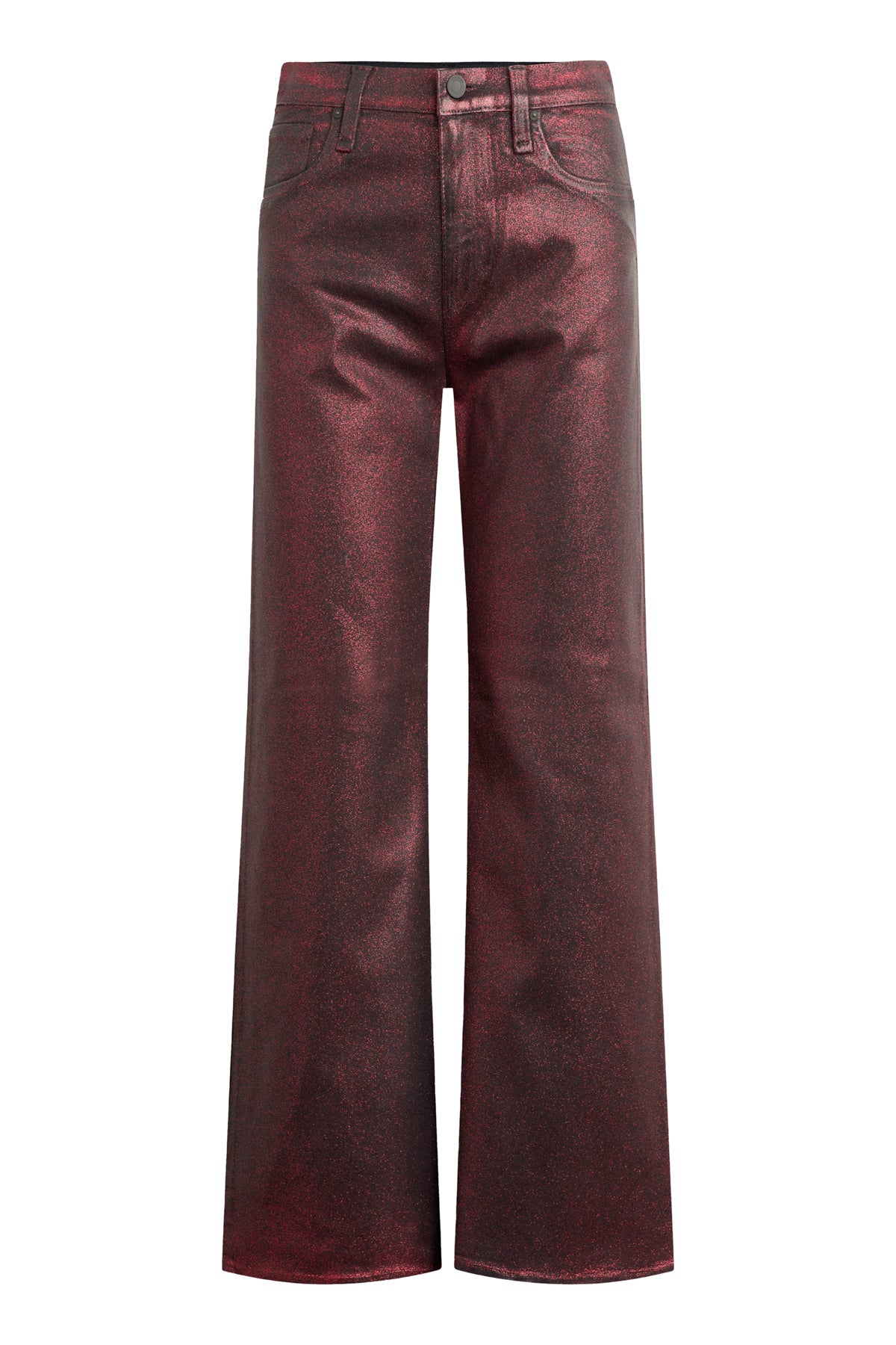 Our Rosie High-Rise Wide Leg Ankle Jean in Port Glitter Foil is cut with an elevated waistline and ankle-length, roomy leg. Crafted from overdyed black denim with a glitter coating that gives it a burgundy shine, this style is finished with a 28" inseam, covered button fly and clean finished hem. -