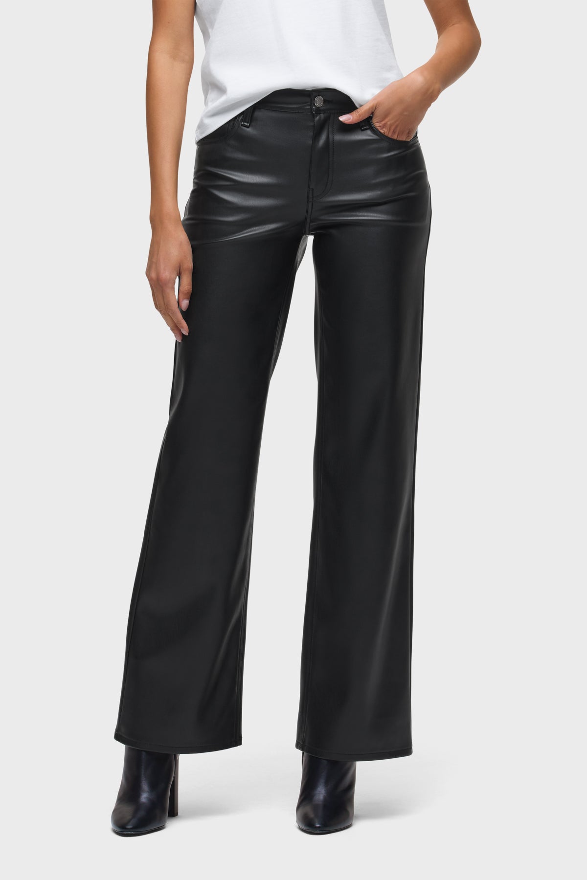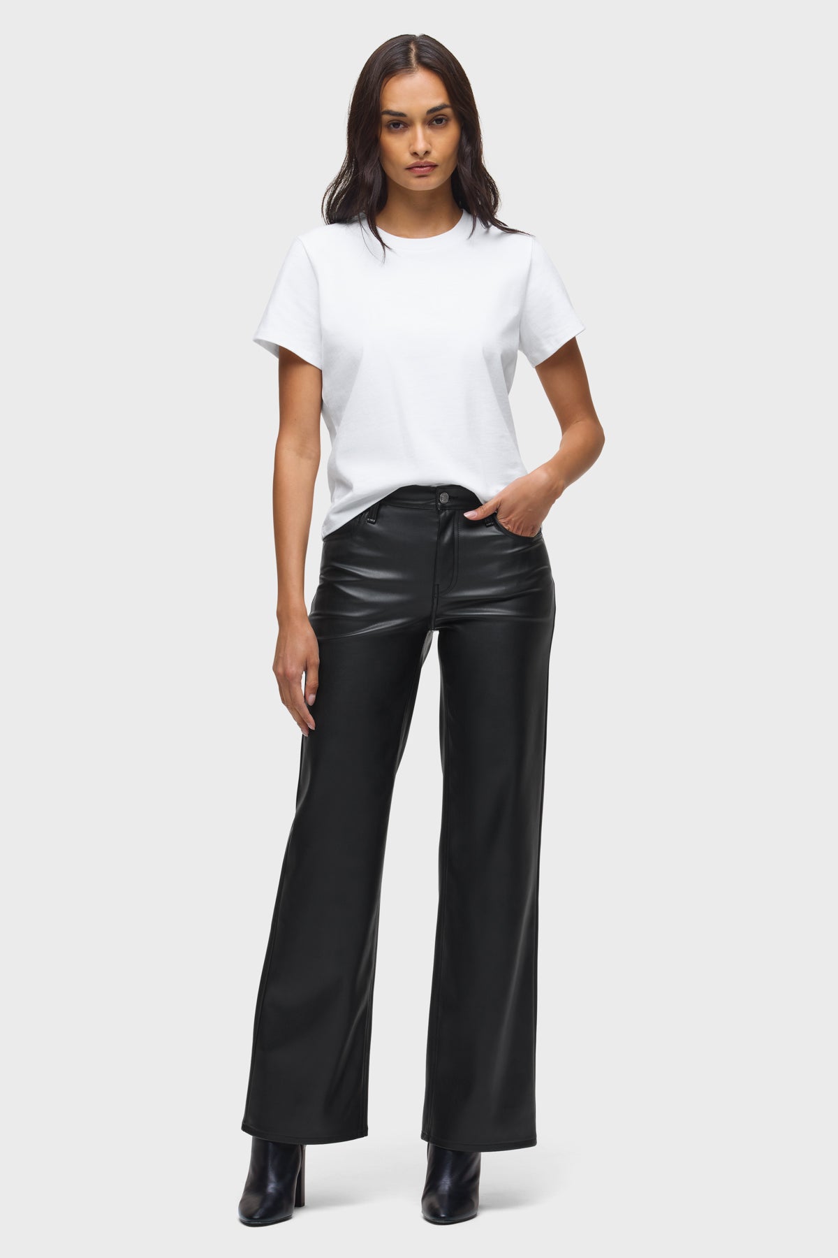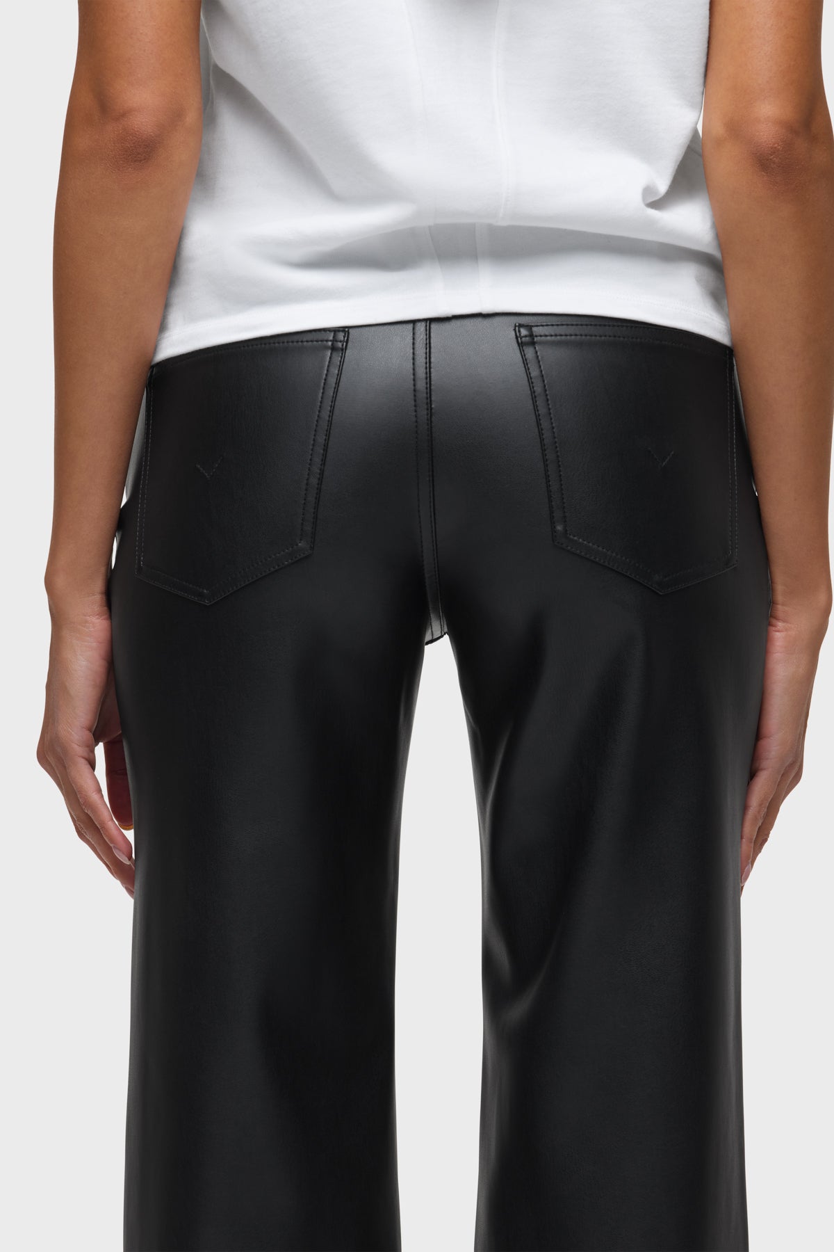 Our Rosie High-Rise Wide Leg Pant in Black has a classic fit with an elevated waistline and a roomy leg. Crafted from black vegan leather, this full-length 32" pair is finished with a zipper fly. -