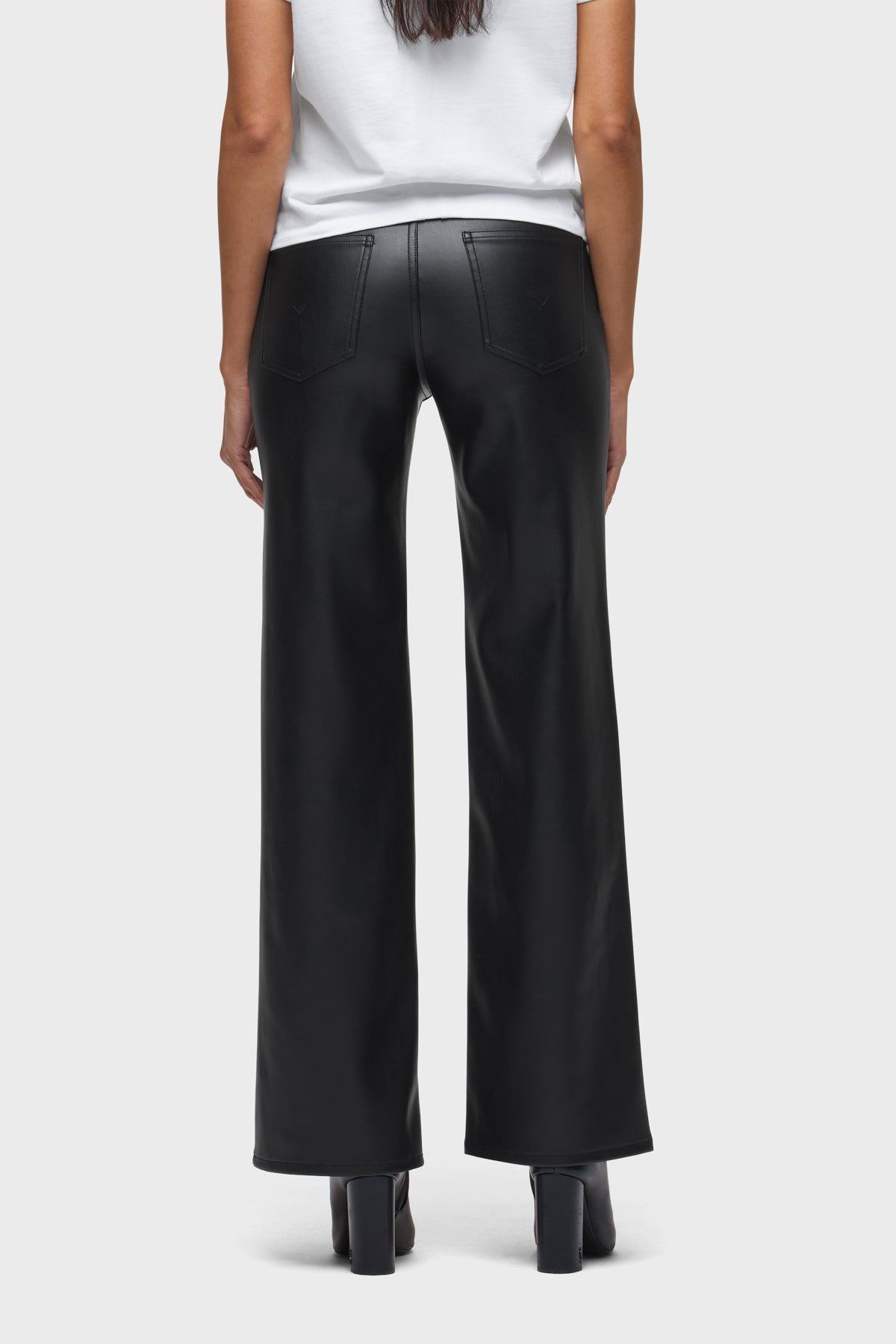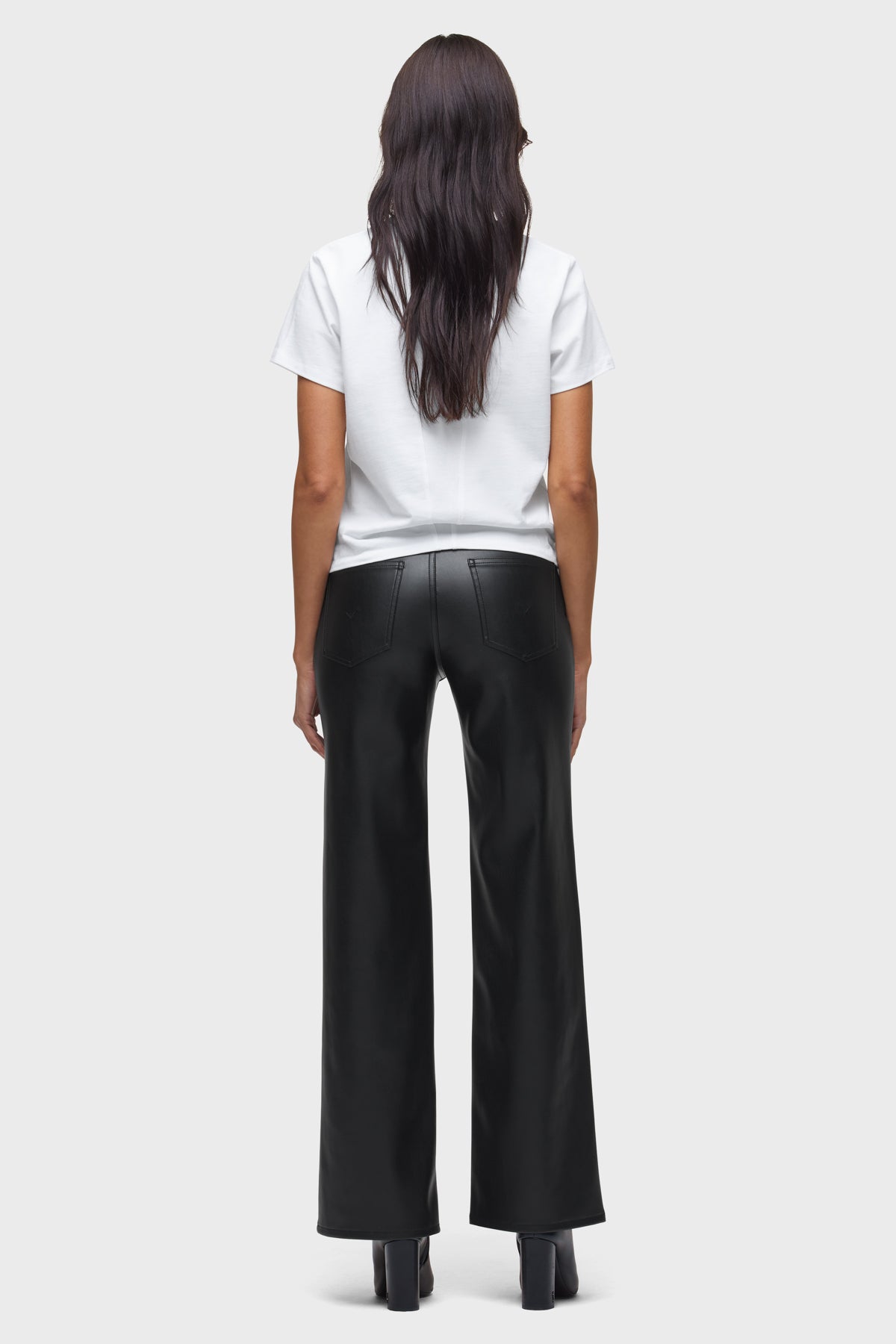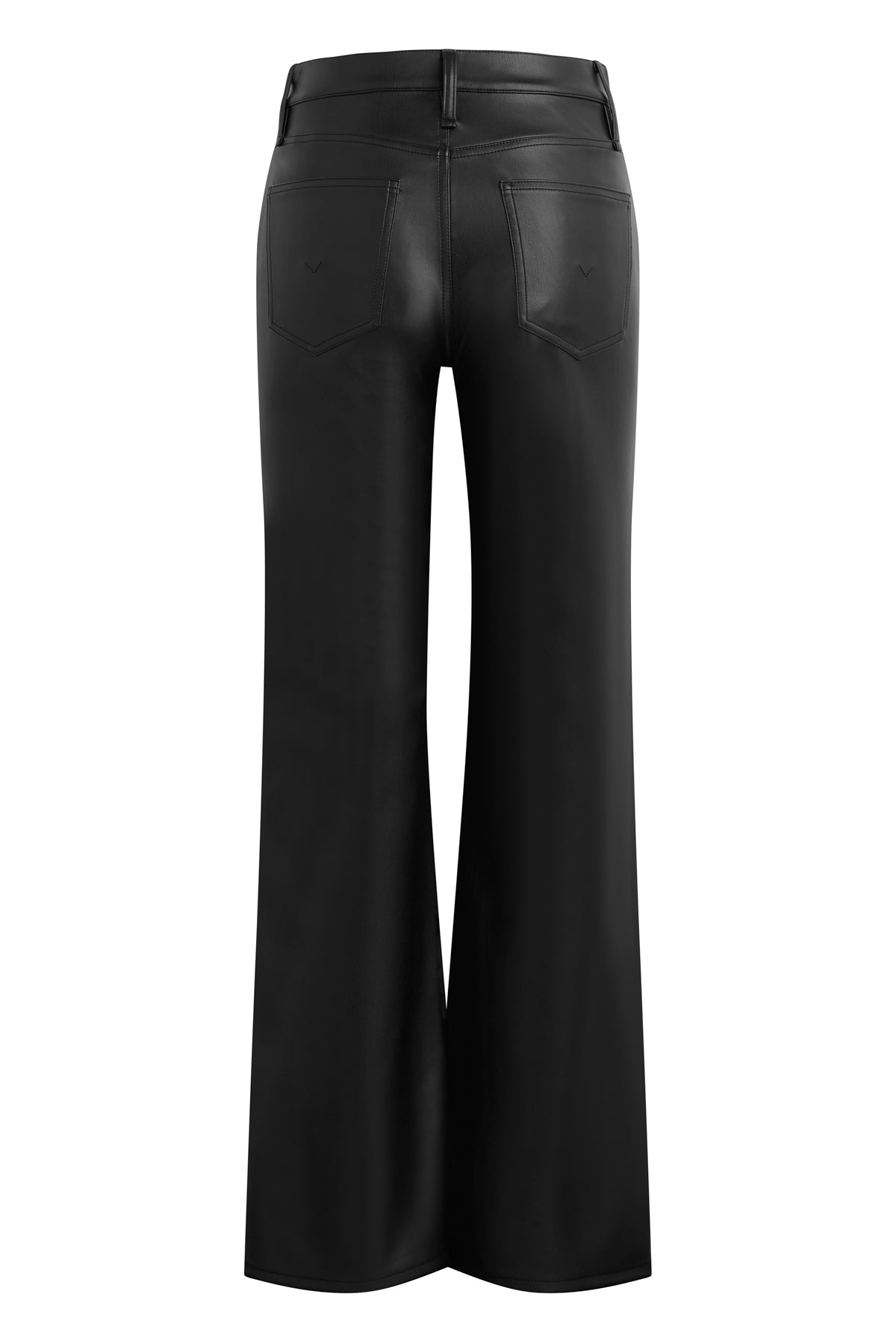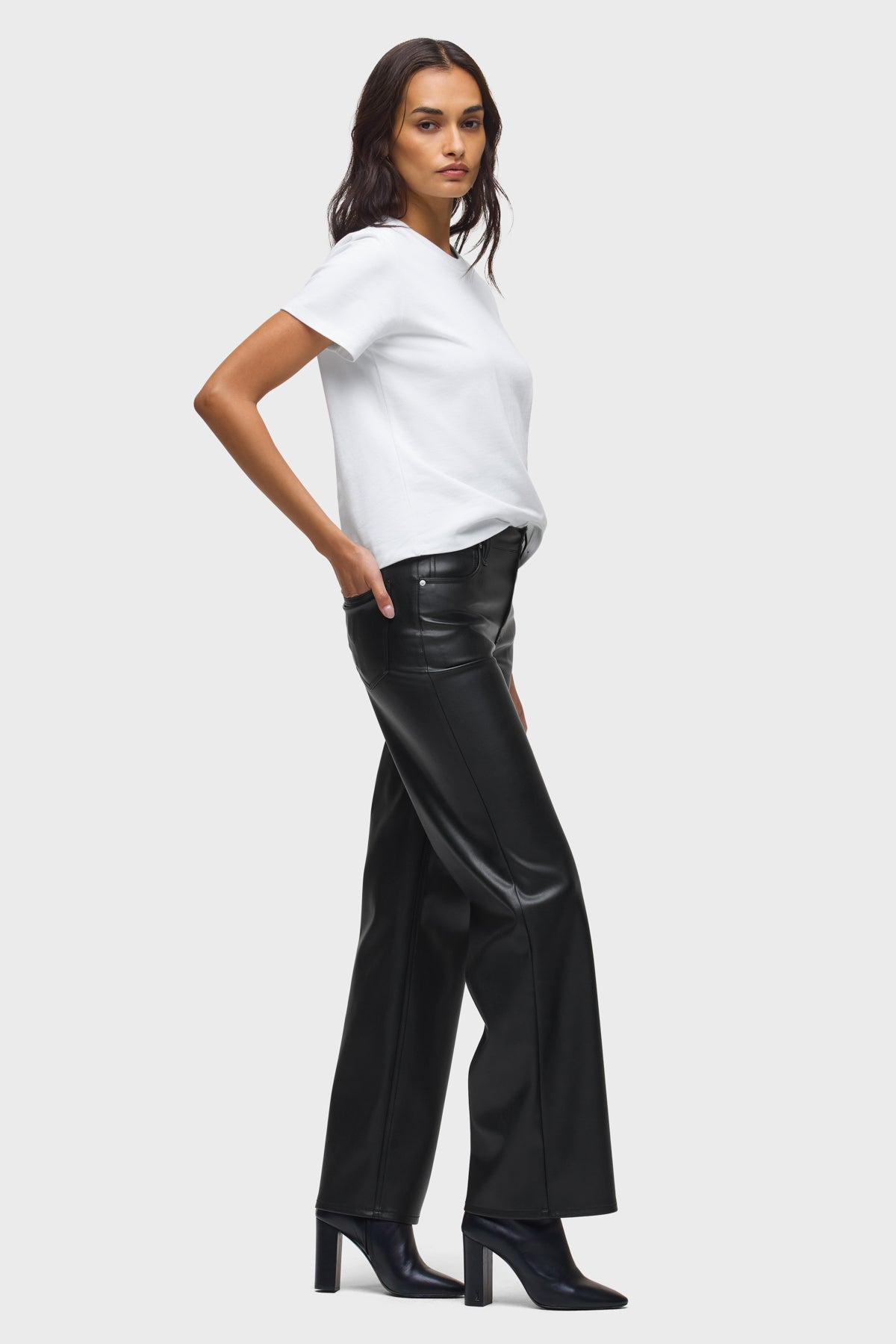 Our Rosie High-Rise Wide Leg Pant in Black has a classic fit with an elevated waistline and a roomy leg. Crafted from black vegan leather, this full-length 32" pair is finished with a zipper fly. -