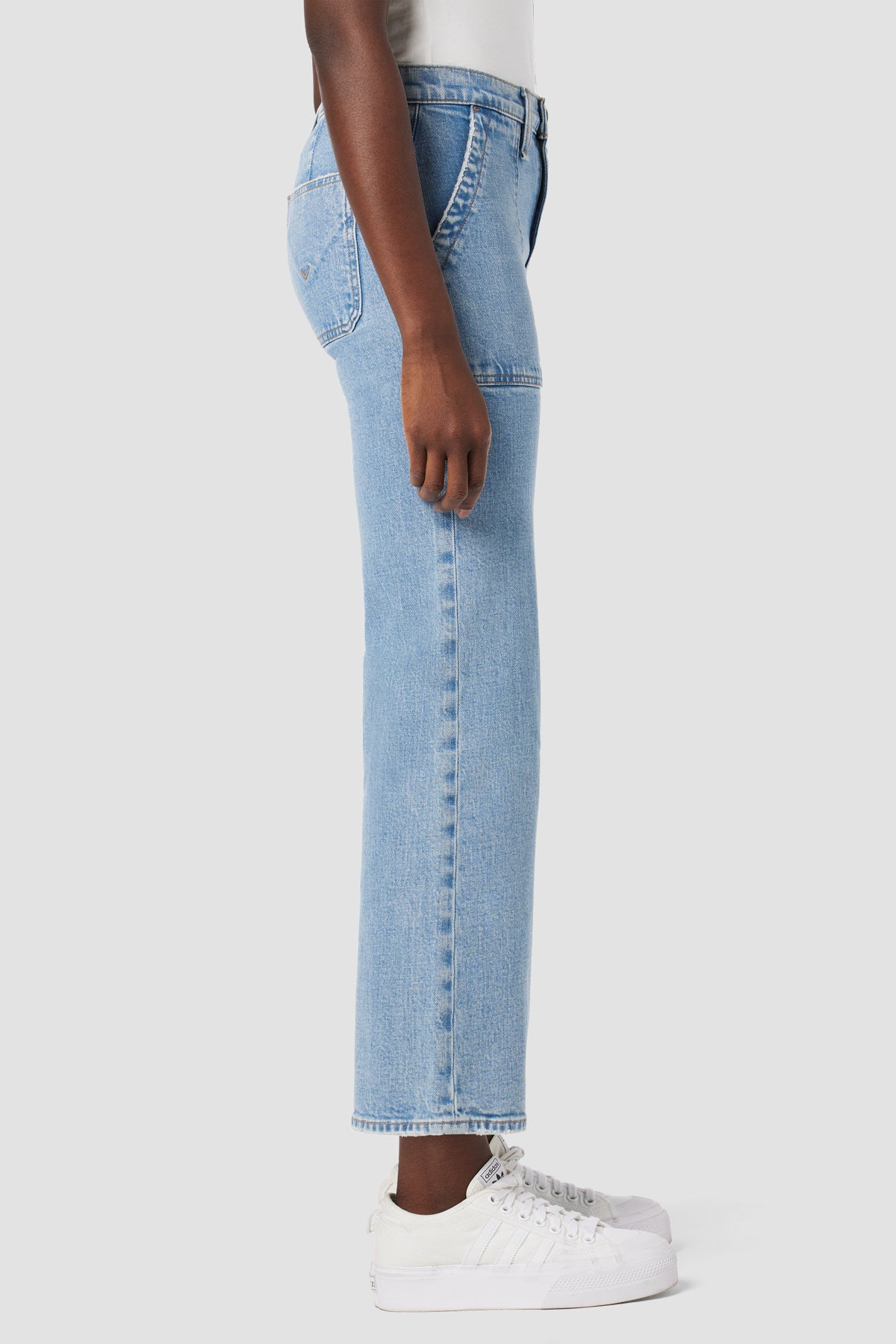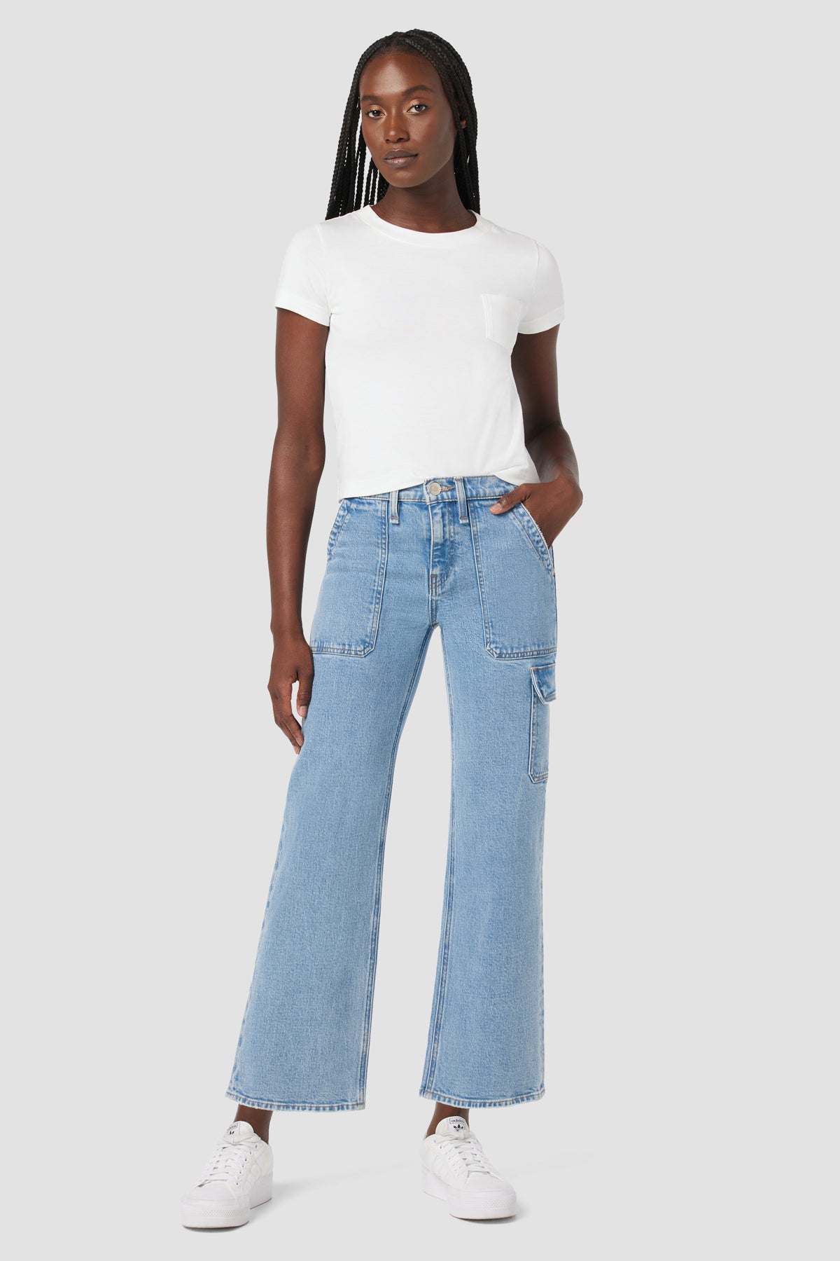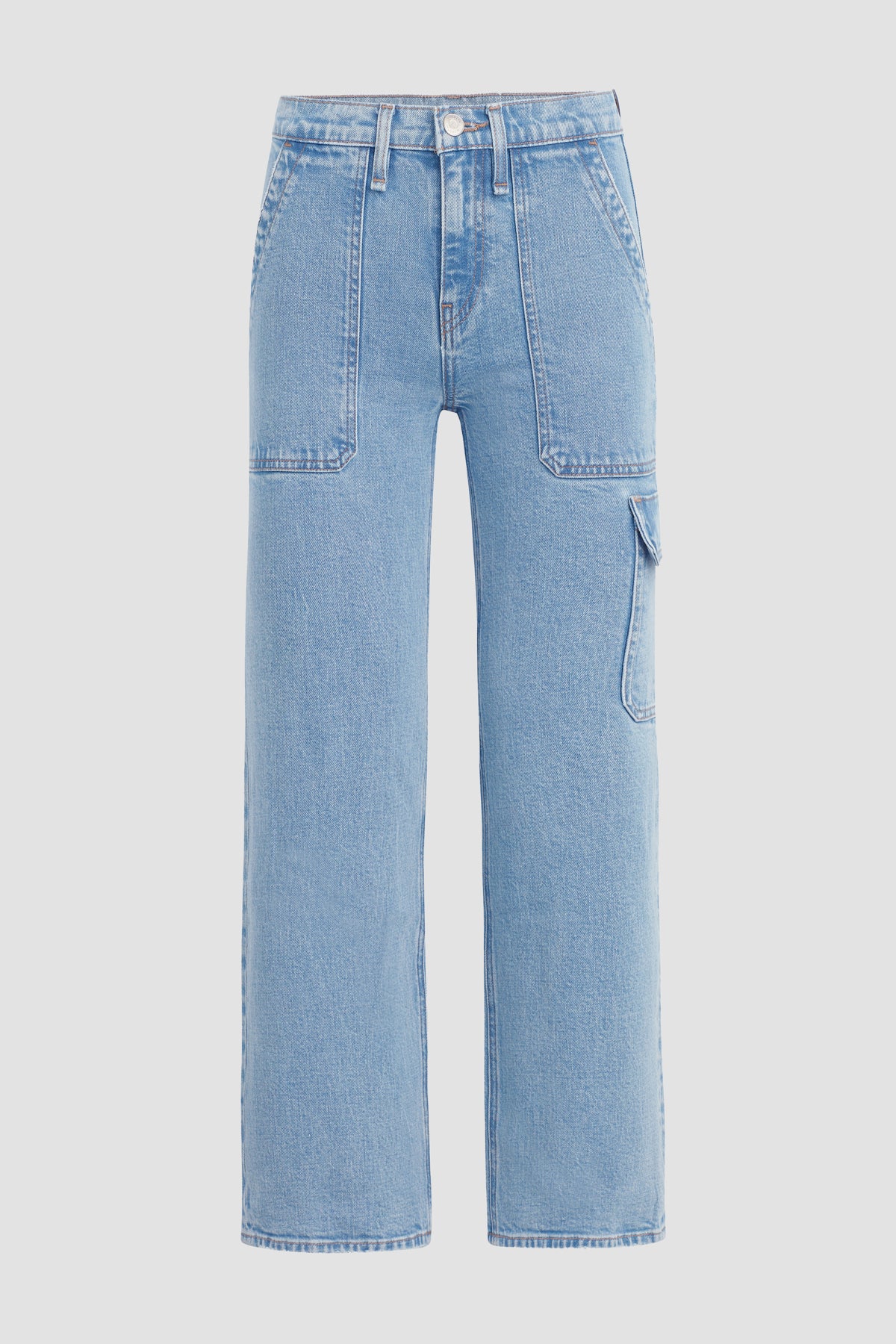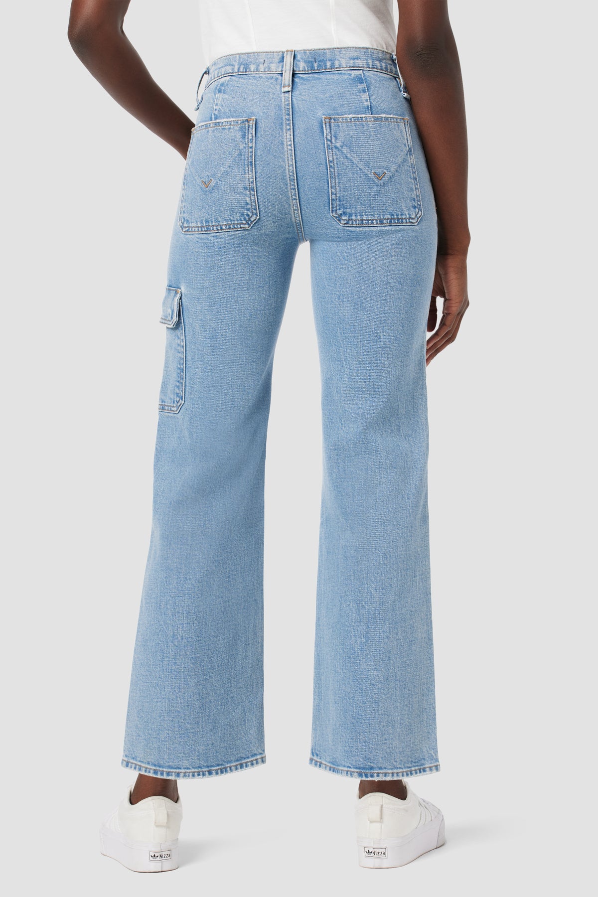 Our Rosie High-Rise Wide Leg Cargo Jean is cut with a high rise, utility cargo detail and wide leg. Crafted from Italian premium comfort stretch denim, the light blue Reservoir wash features a clean hem and edge grinding. -