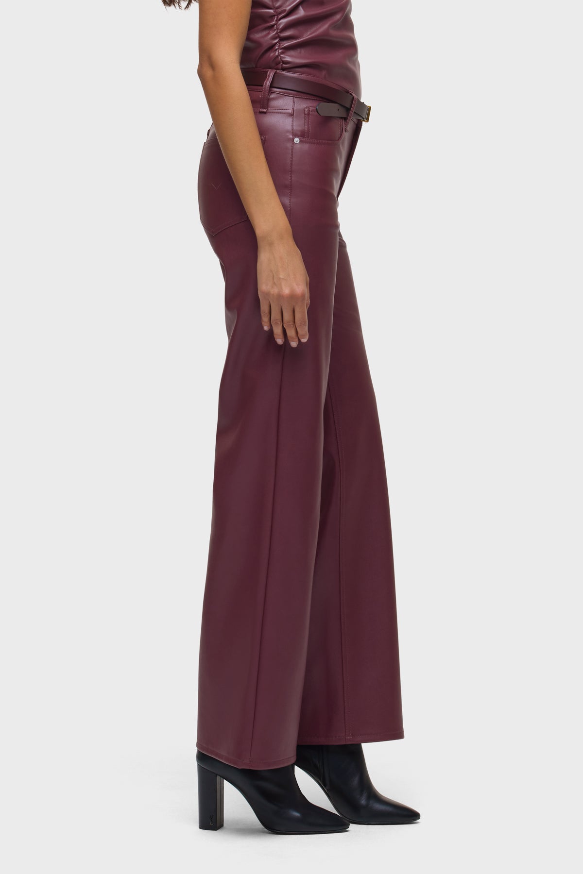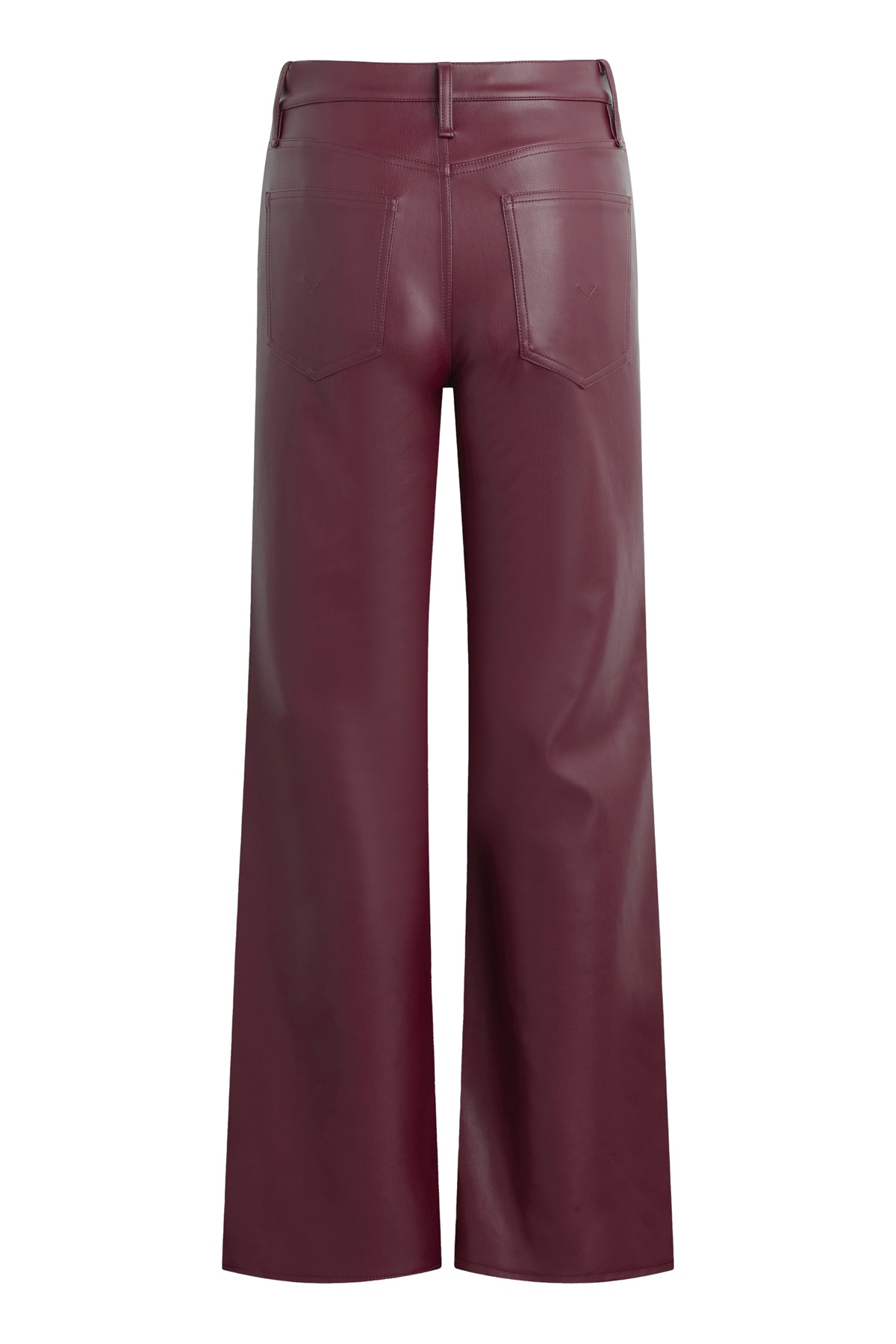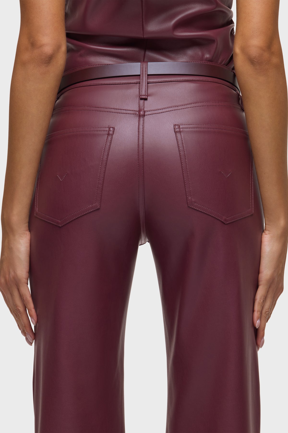 Our Rosie High-Rise Wide Leg with Cuff in Port Royal has a classic fit with an elevated waistline and a roomy leg. Crafted in maroon vegan leather, this full-length 32" pair is finished with a zipper fly. -