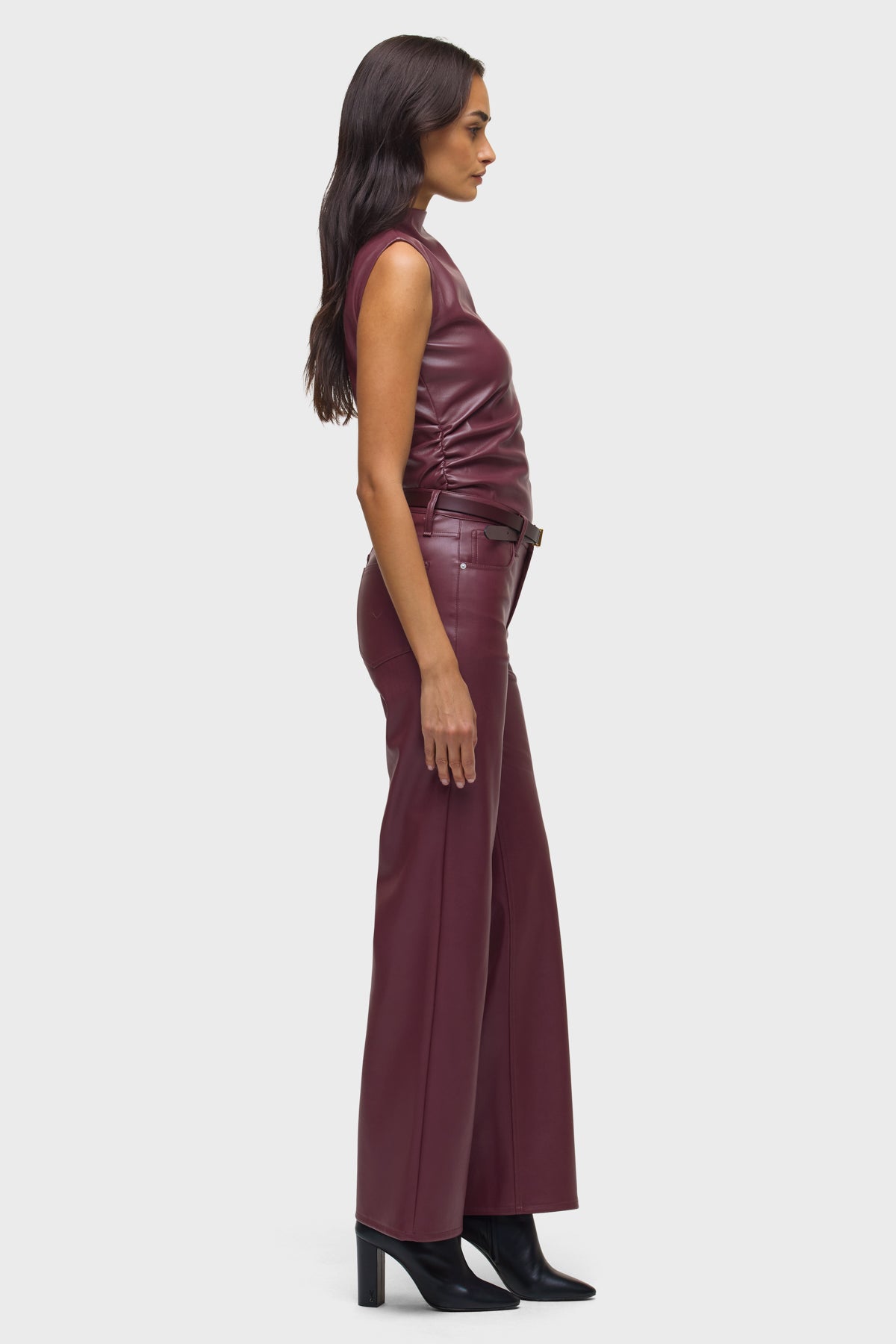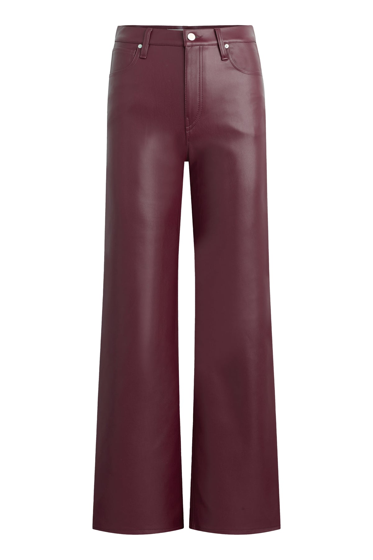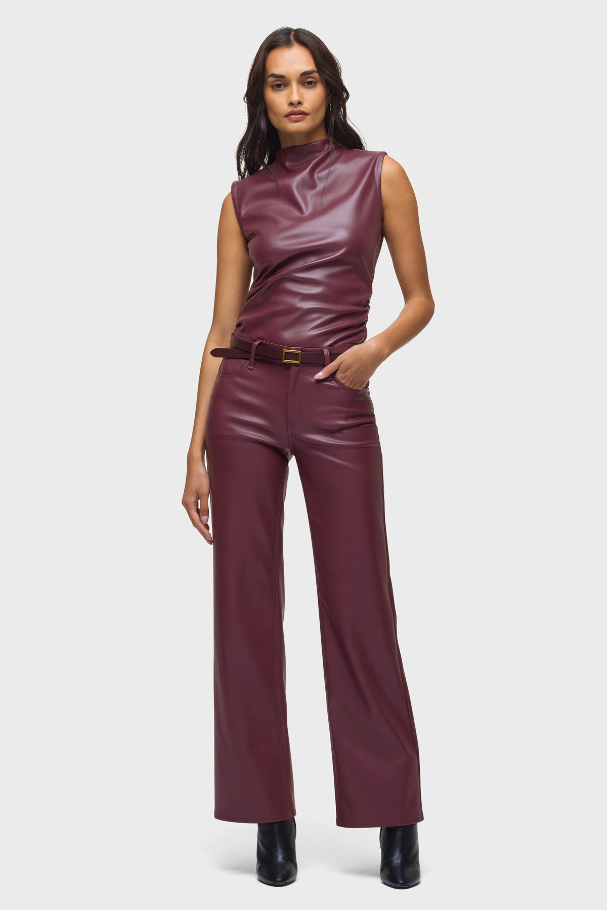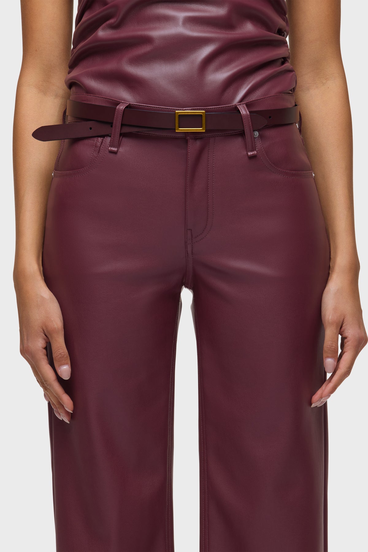 Our Rosie High-Rise Wide Leg with Cuff in Port Royal has a classic fit with an elevated waistline and a roomy leg. Crafted in maroon vegan leather, this full-length 32" pair is finished with a zipper fly. -