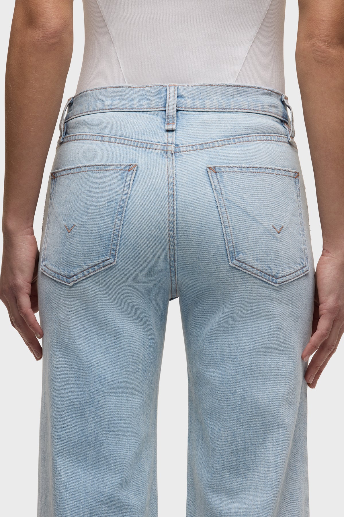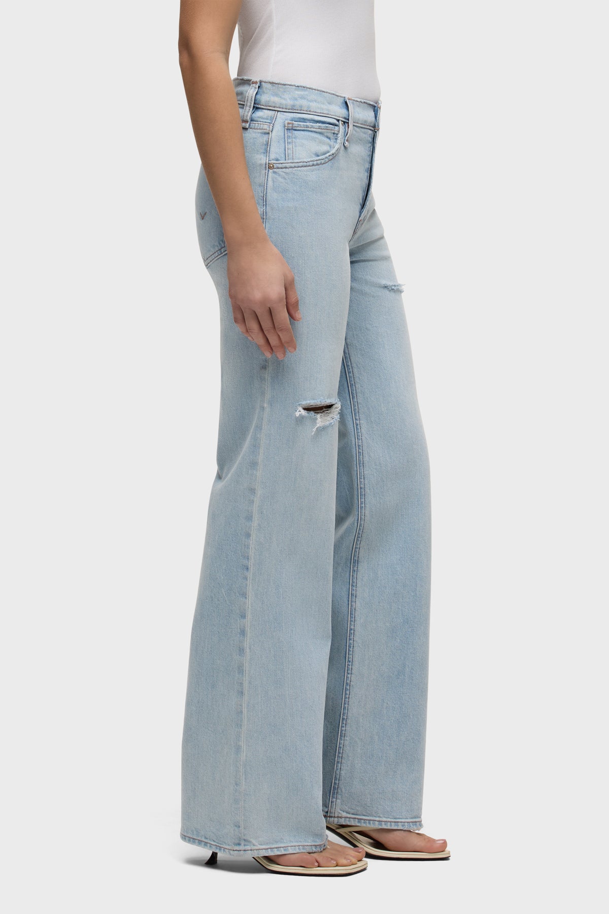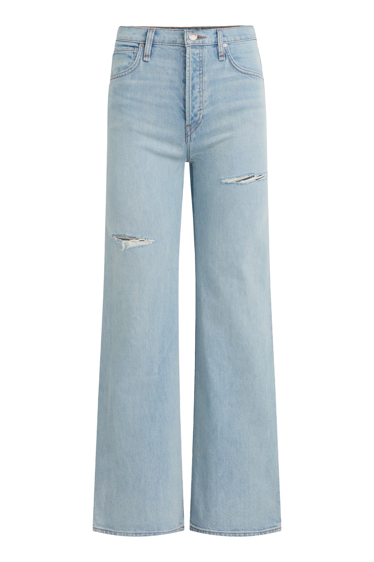 Our Rosie High-Rise Wide Leg Jean with Covered Button Fly in Rearview has a classic fit with an elevated waistline and a roomy leg. Crafted from Italian comfort stretch denim in a light indigo wash with heavy acid washing, stone washing, bleaching, whiskering, edge grinding and destruction on both legs, this full-length 32" pair is finished with a covered button fly and clean finished hem. -