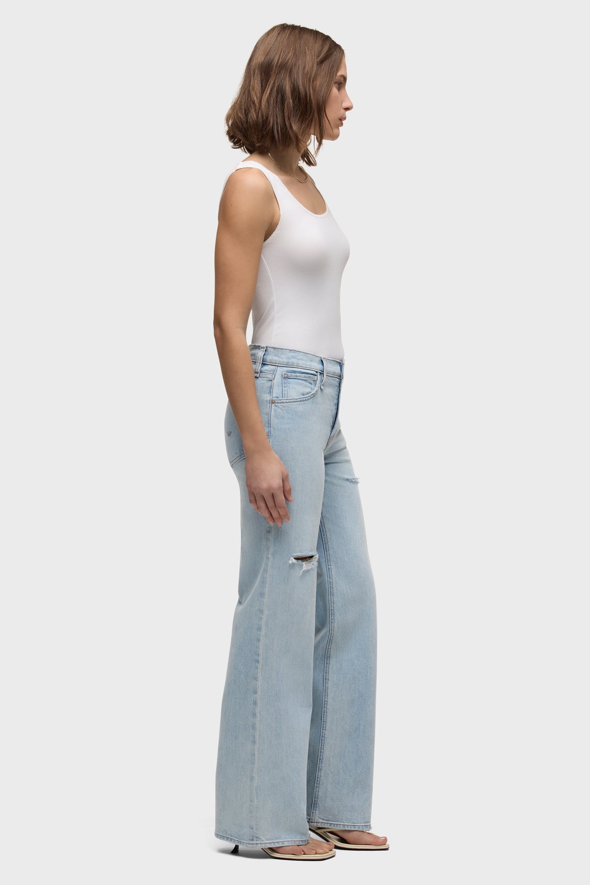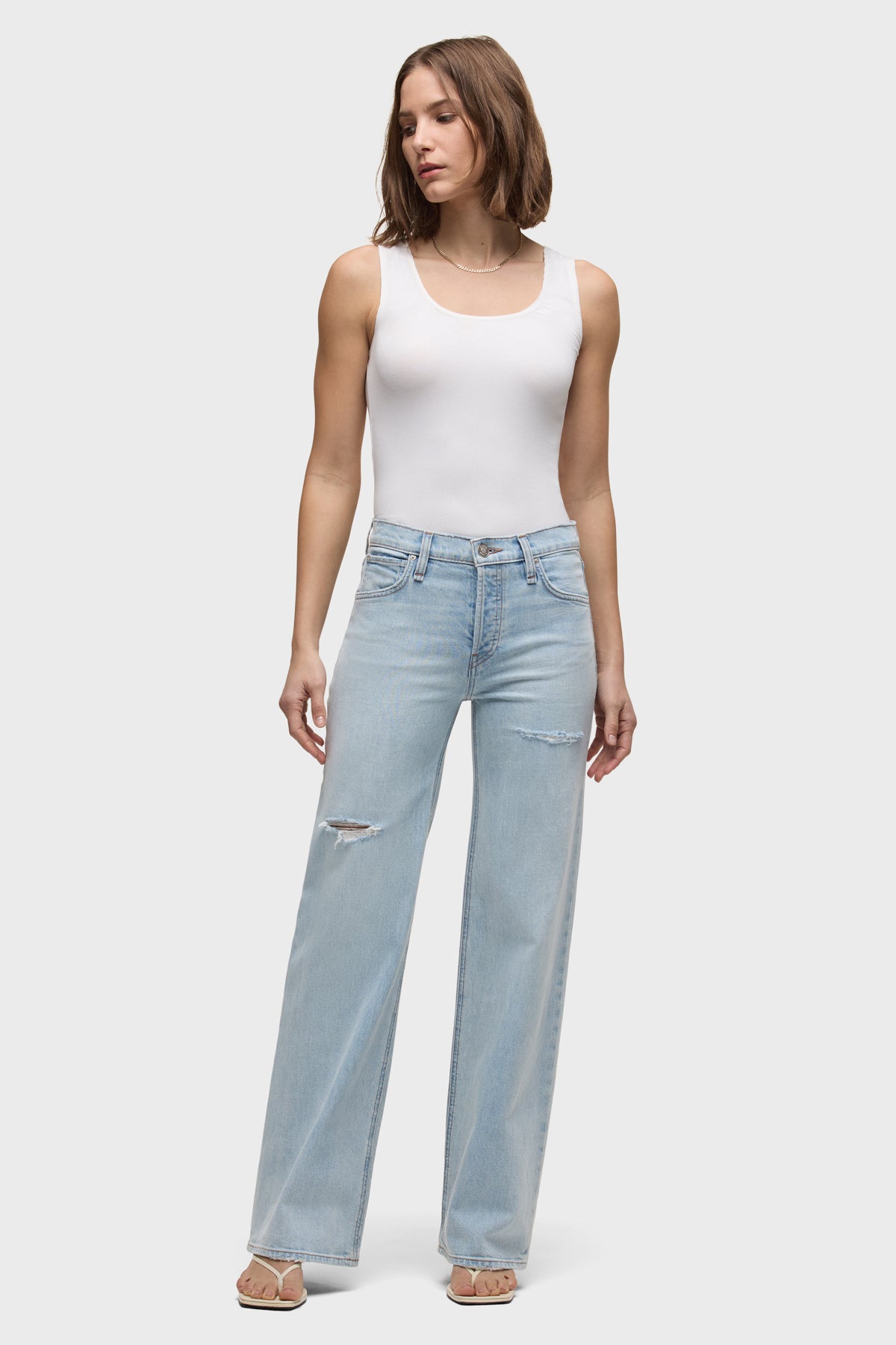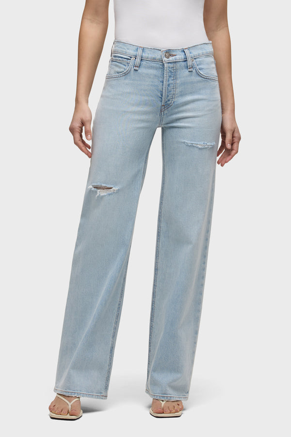 Our Rosie High-Rise Wide Leg Jean with Covered Button Fly in Rearview has a classic fit with an elevated waistline and a roomy leg. Crafted from Italian comfort stretch denim in a light indigo wash with heavy acid washing, stone washing, bleaching, whiskering, edge grinding and destruction on both legs, this full-length 32" pair is finished with a covered button fly and clean finished hem. -