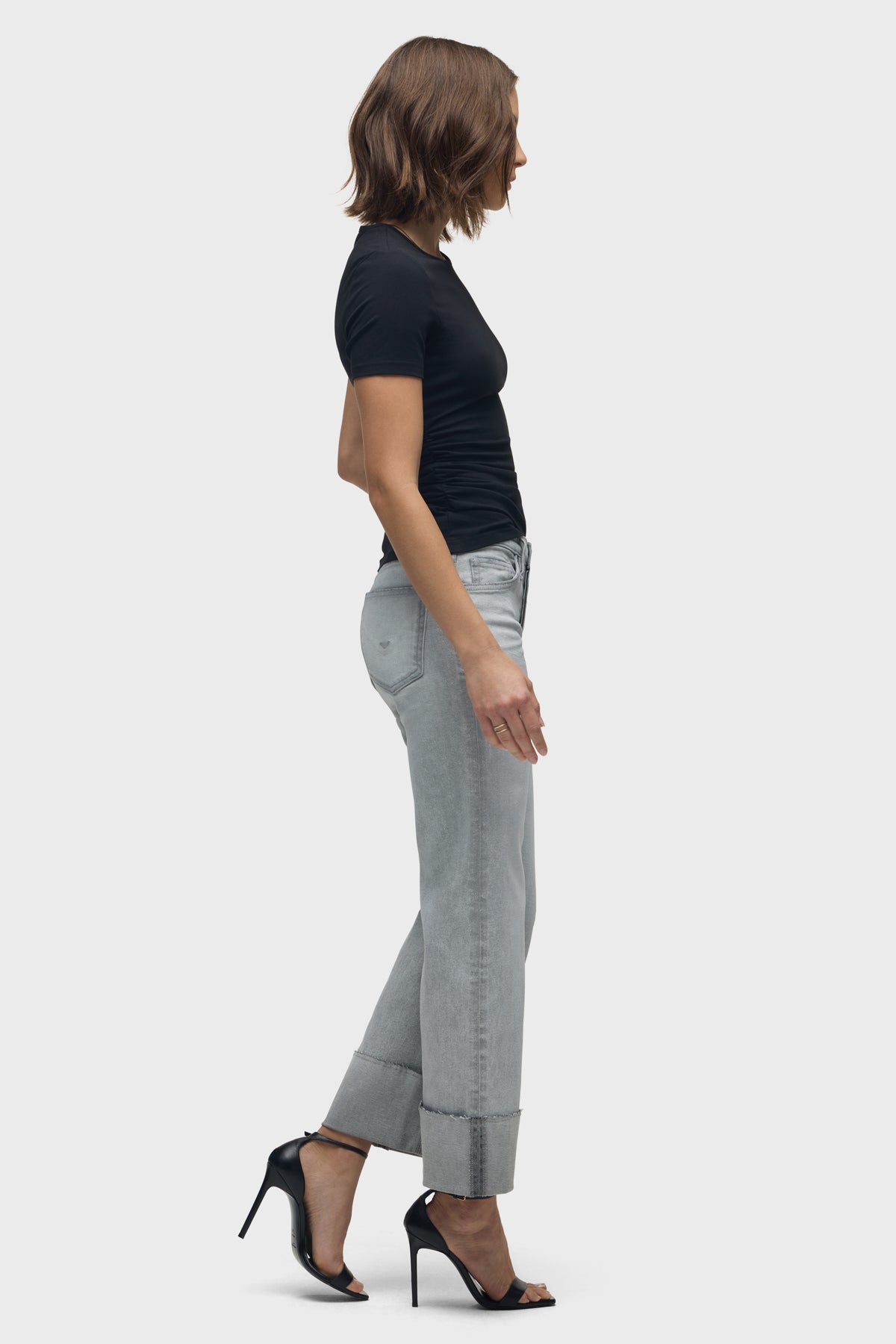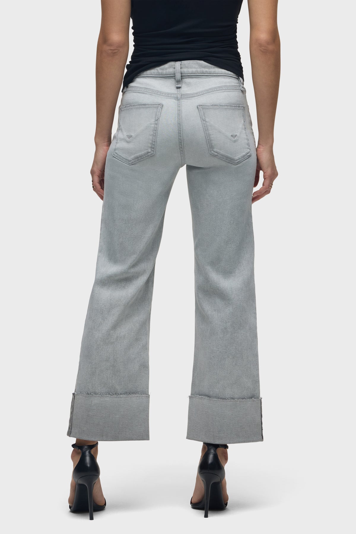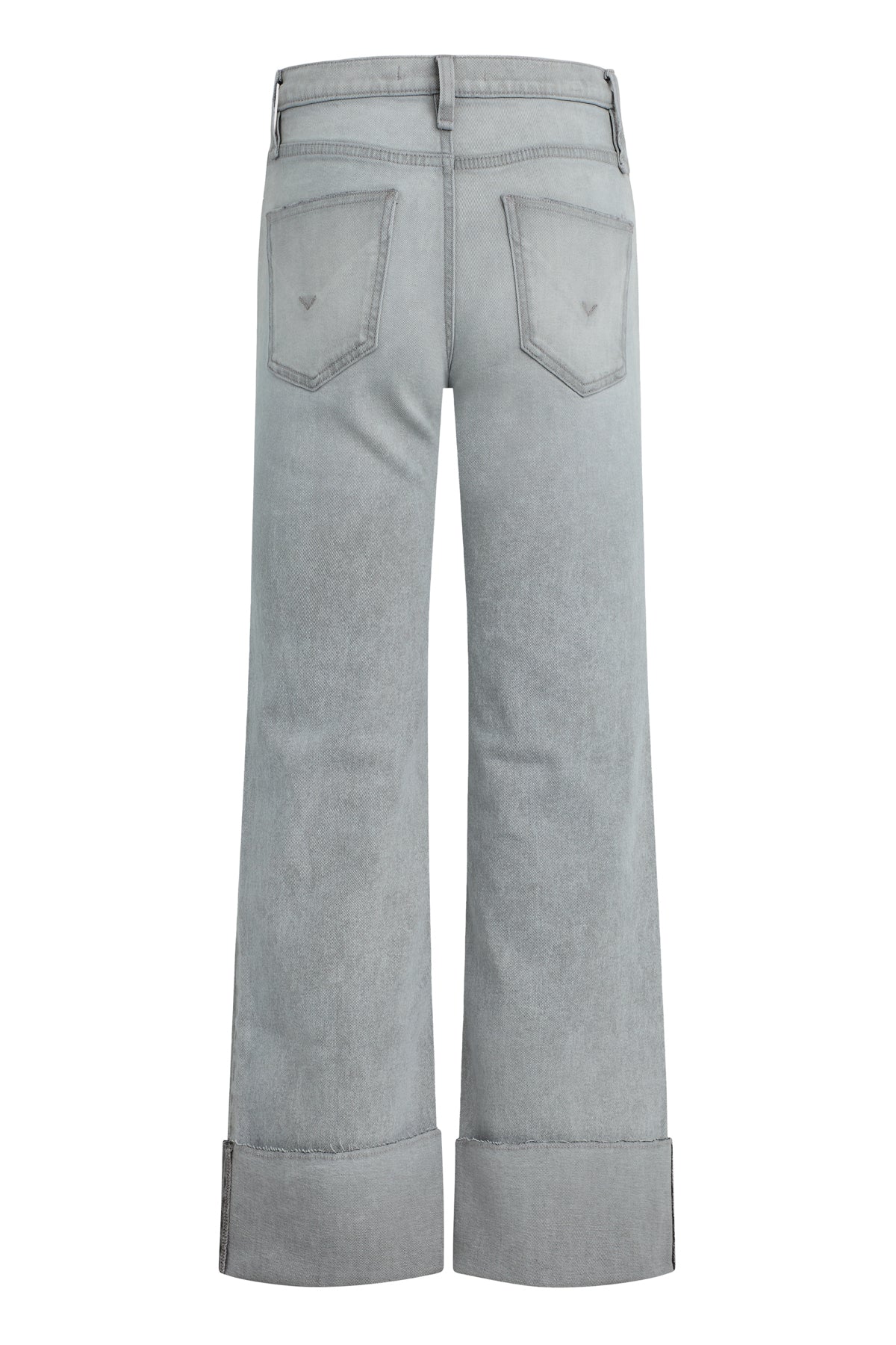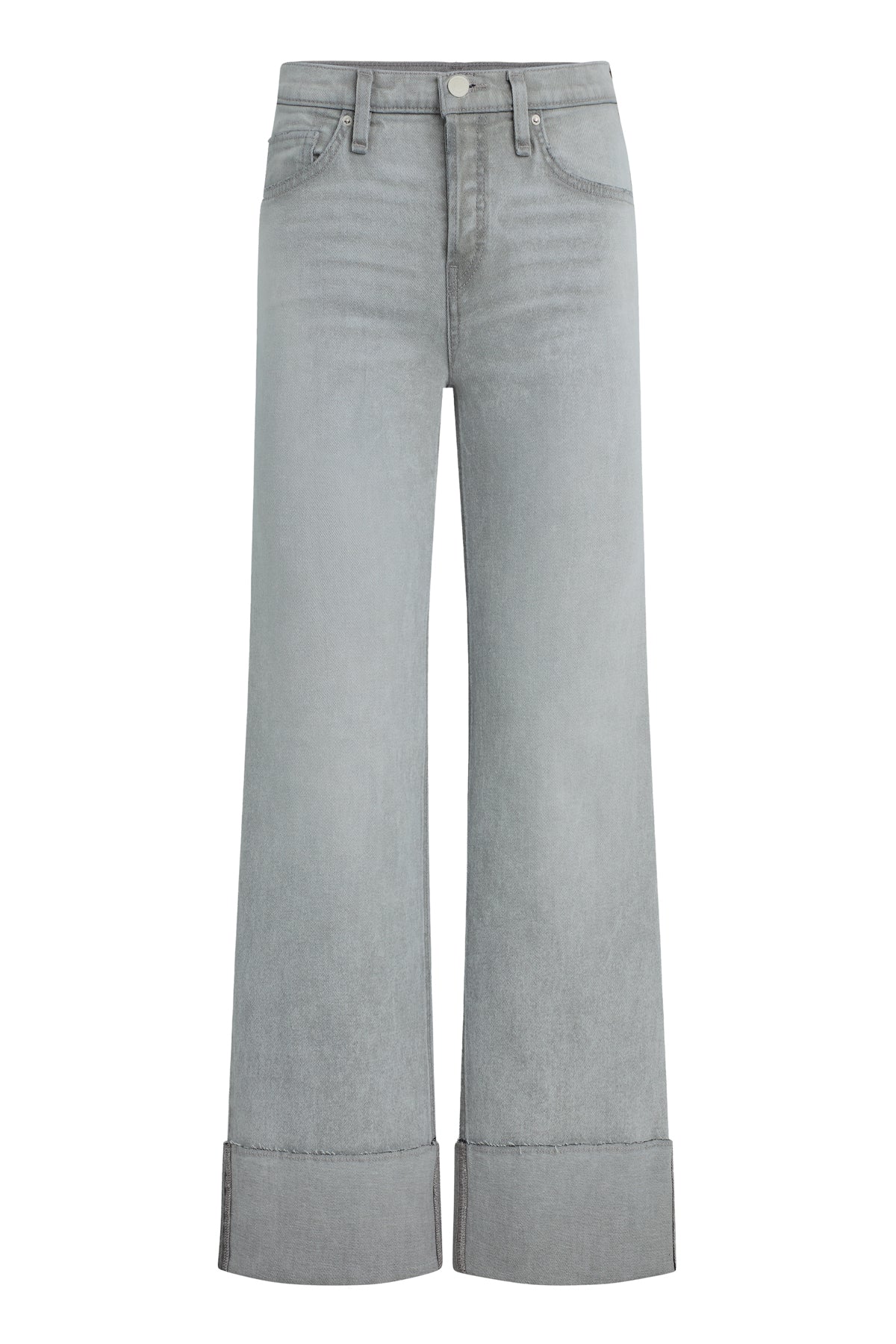 Our Rosie High-Rise Wide Leg Jean w/ Cuff has a classic fit with an elevated waistline, a roomy leg and a raw hem that is designed to be cuffed. This pair is crafted from premium stretch denim in a washed light grey shade, Washed Slate, with stone washing, acid washing, whiskering and edge grinding. -