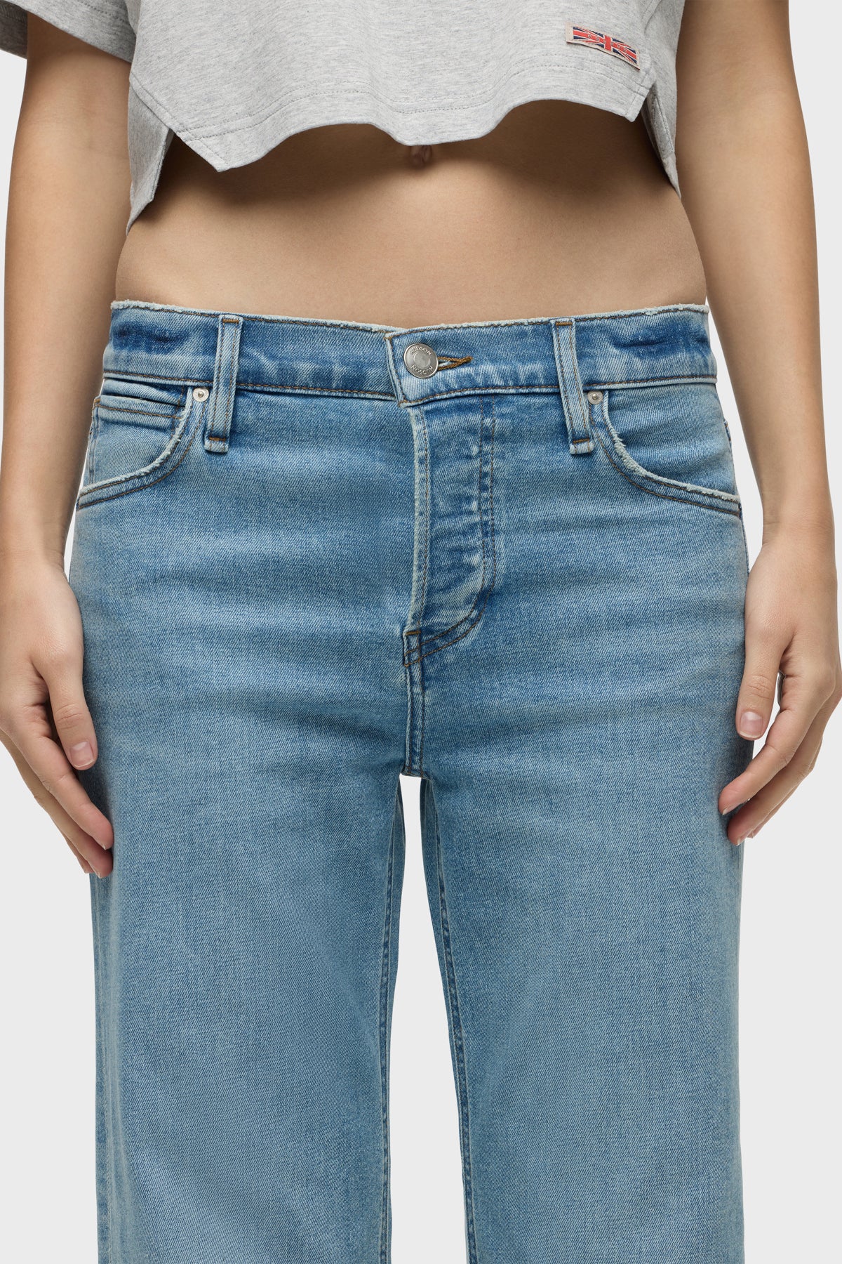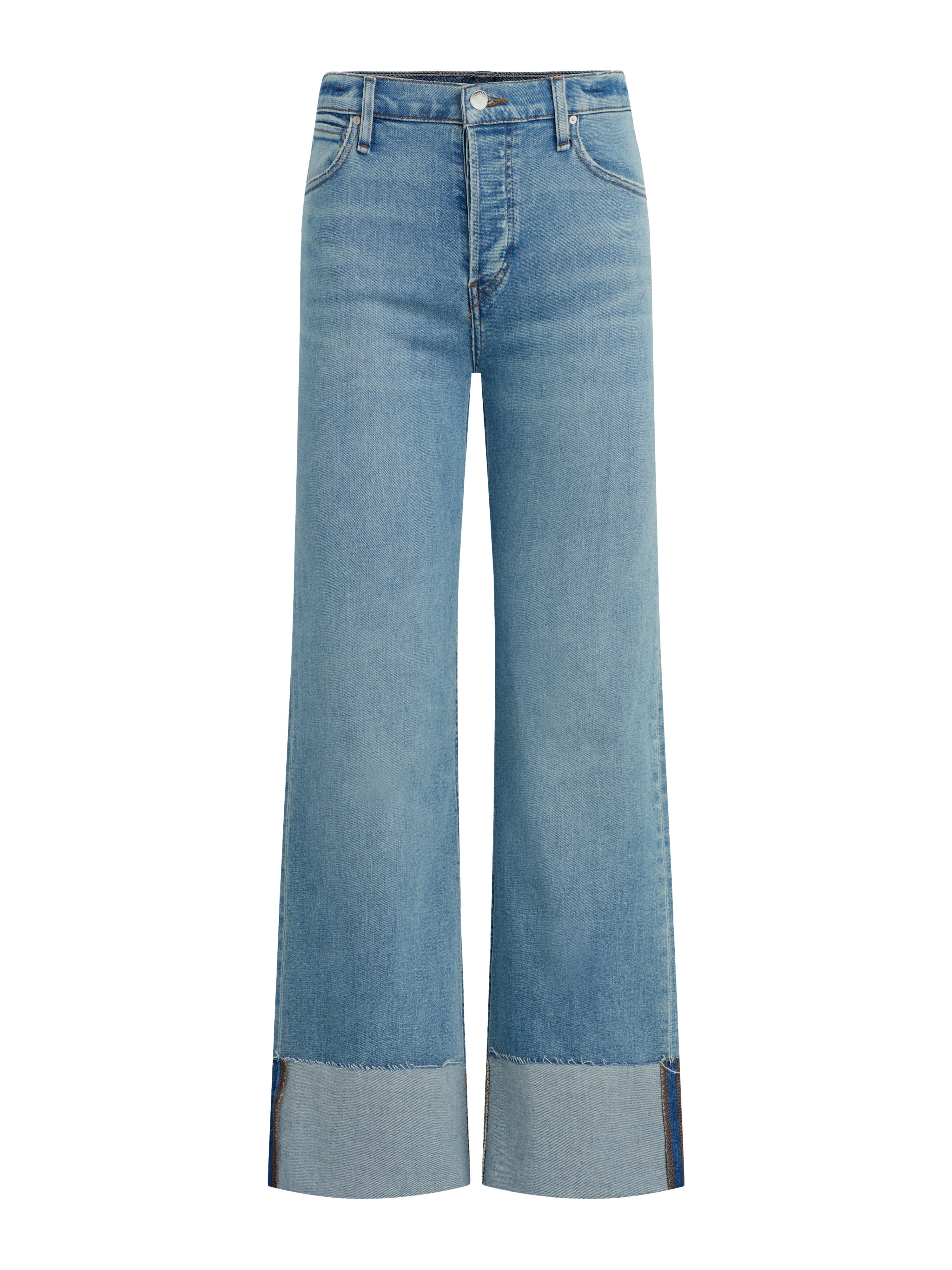 Our Rosie High-Rise Wide Leg Petite Jean w/ Cuff is cut with a high rise, wide cuff, covered button fly and wide leg. Crafted in a light indigo Oak, the pair is finished with a whiskering and grinding along the edges. The 25" cuffed inseam is designed for petite proportions. -