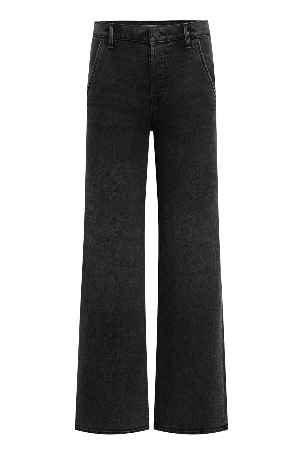 Re-up with our Rosie High-Rise Trouser Wide Leg Ankle Jean, cut with an elevated waistline and a 28" ankle length. The washed-black Smokey is made from super stretch denim with excellent fit and recovery. The pair is finished with a covered button fly, whiskering and edge grinding. -